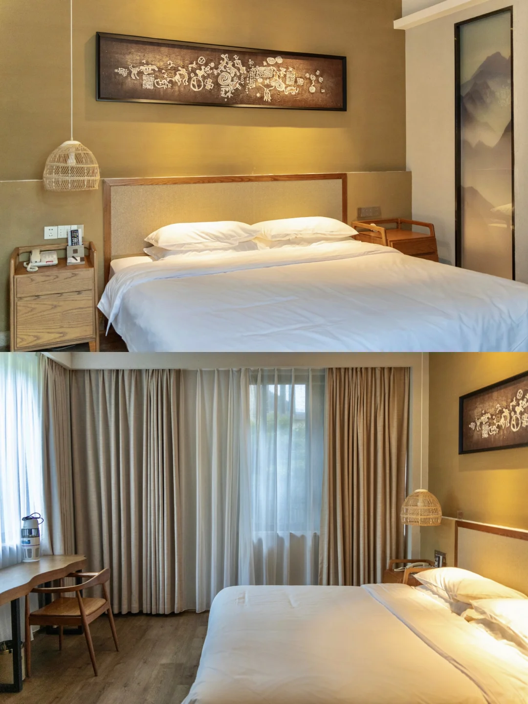 度假区有民宿/酒店/青旅选择。我们为了第二天上山方便,入住【枕山宿】距离索道200m,房间是新中式风格!酒店门口是摆渡车停靠点🅿️游玩景点🉑免费接送