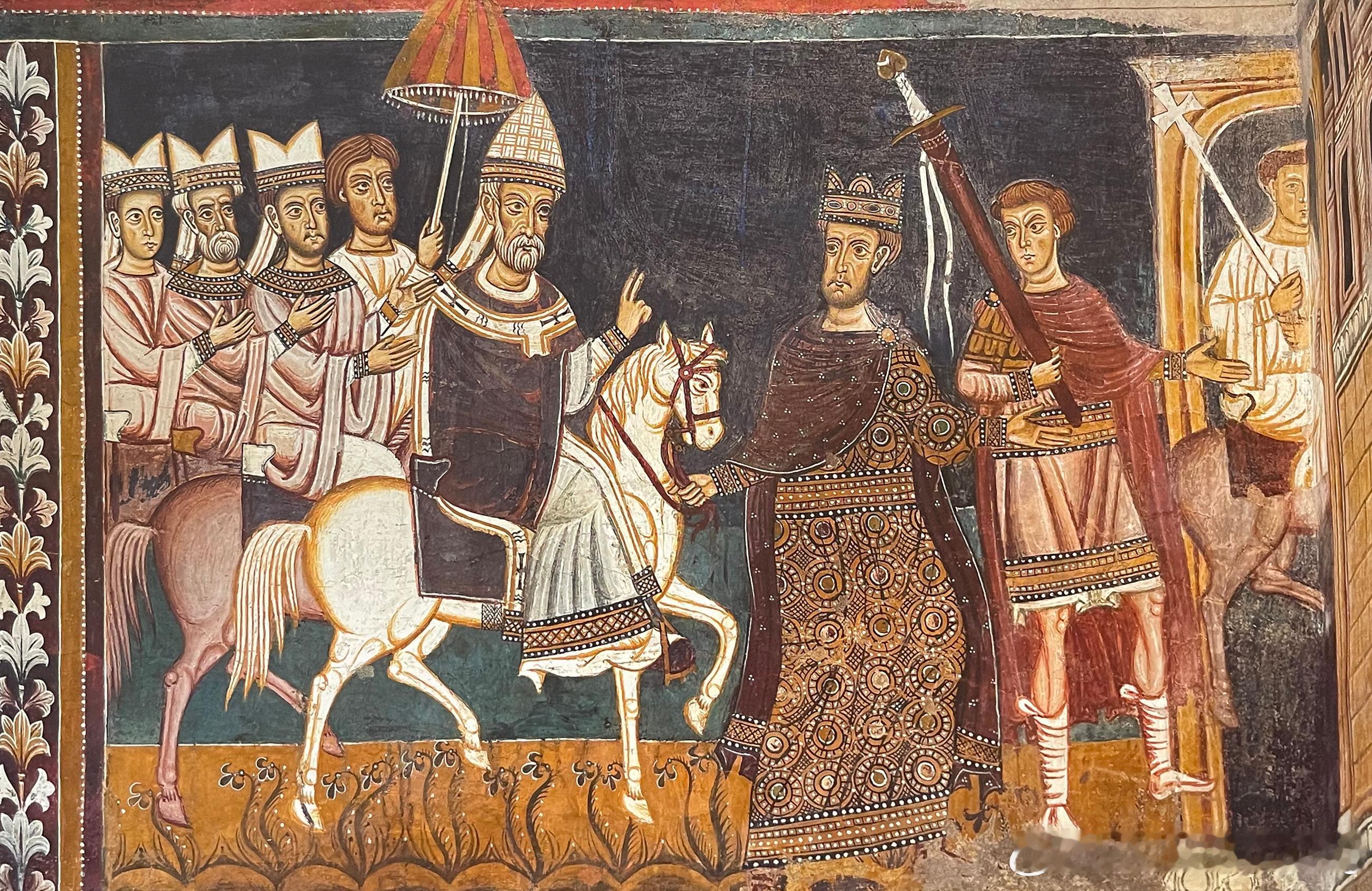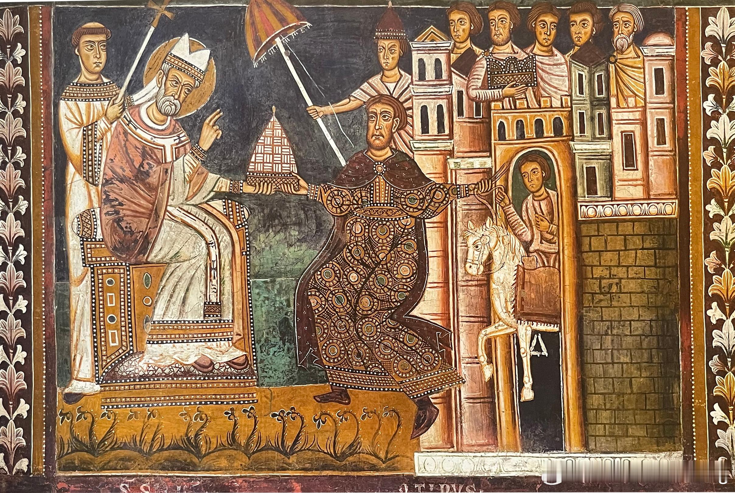 在日耳曼霍亨斯陶芬王朝的腓特烈二世(1194--1250)与教宗激烈相争的时期,圣西尔维斯特礼拜堂的湿壁画指出教宗的权力高于君士坦丁帝王。其中一幅湿壁画描绘君士坦丁跪在教宗西尔维斯特面前,献上其弗利吉亚帽,即王冠。而在门边壁画中,戴着此权力象征的教宗骑着马,引导随从人员朝下一幅壁画前进,身边围绕着神职人员和女士们。帝王则如同看守马的角色跟随并亲自为他带路,这在封建法中代表一种效忠的举动。