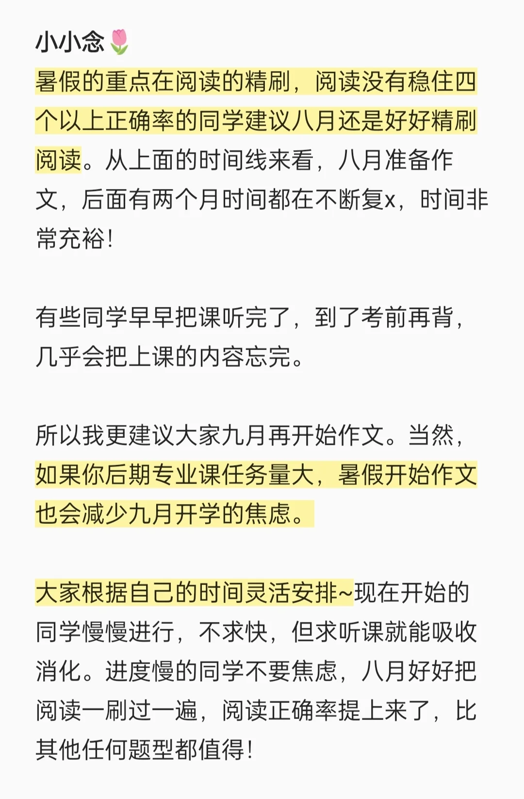 暑假的重点在阅读的精刷,阅读没有稳住四个以上正确率的同学建议八月还是好好精刷阅读。从上面的时间线来看,八月准备作文,后面有两个月时间都在不断复x,时间非常充裕!