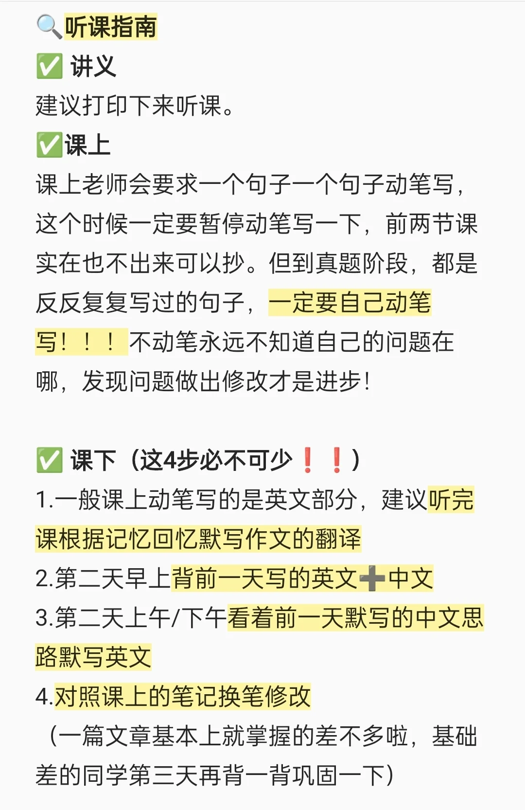 课上老师会要求一个句子一个句子动笔写,这个时候一定要暂停动笔写一下,前两节课实在也不出来可以抄。但到真题阶段,都是反反复复写过的句子,一定要自己动笔写!!!不动笔永远不知道自己的问题在哪,发现问题做出修改才是进步!
