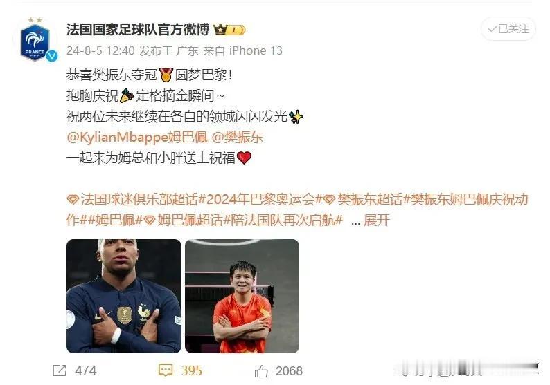 这就是排面!樊振东让乒乓球与足球梦幻联动 樊振东拿到奥运会男单金牌实现大满贯,比赛结束那一刻,小胖激动地做起了姆巴佩标志性庆祝动作。而法国国家队官微也第一时间站出来回应樊振东,并且送上了祝贺。因为樊振东,这一刻的乒乓球帝国与足球强国形成了梦幻联动!小胖是真的牛! #樊振东# #巴黎奥运夺金时刻# #巴黎奥运会# #姆巴佩#