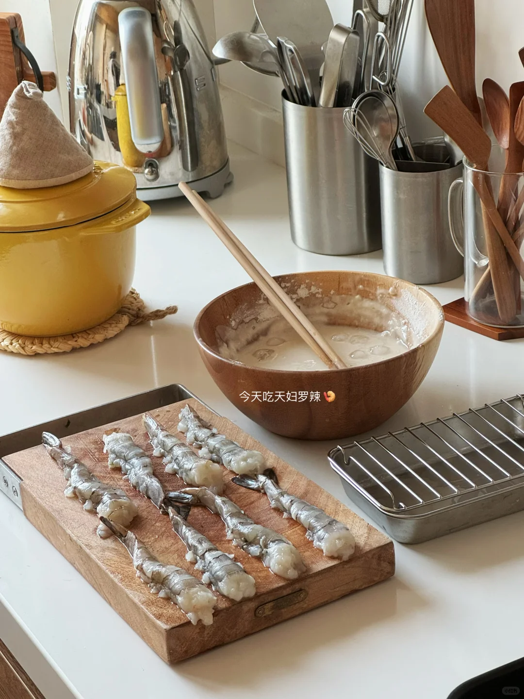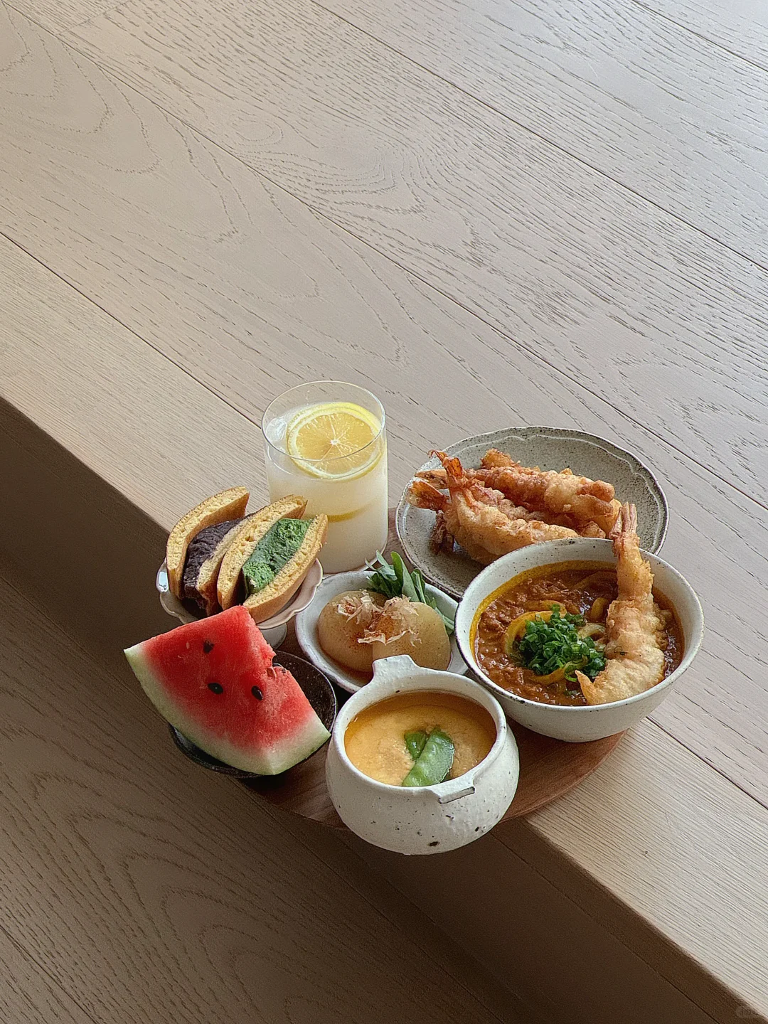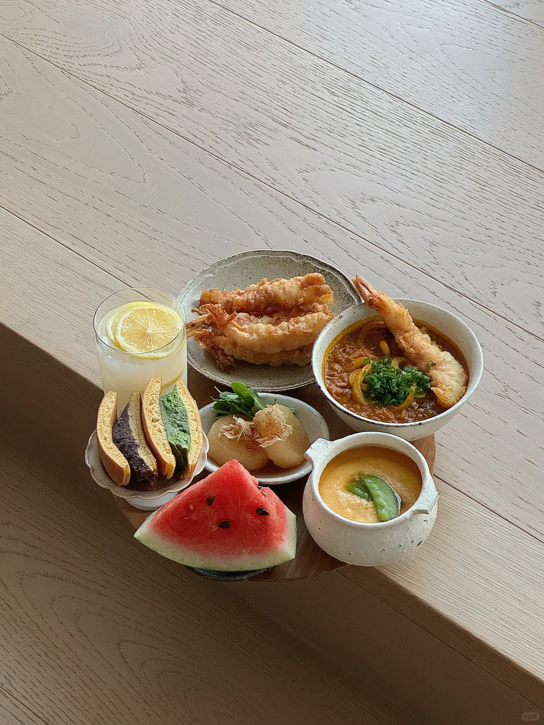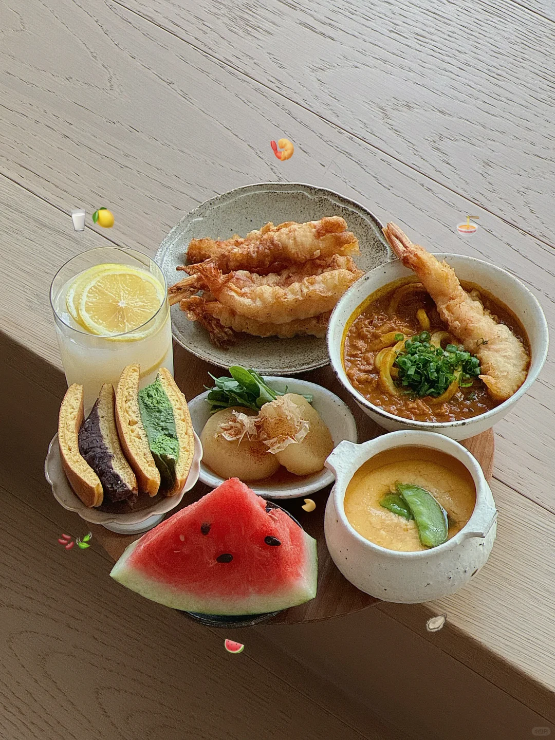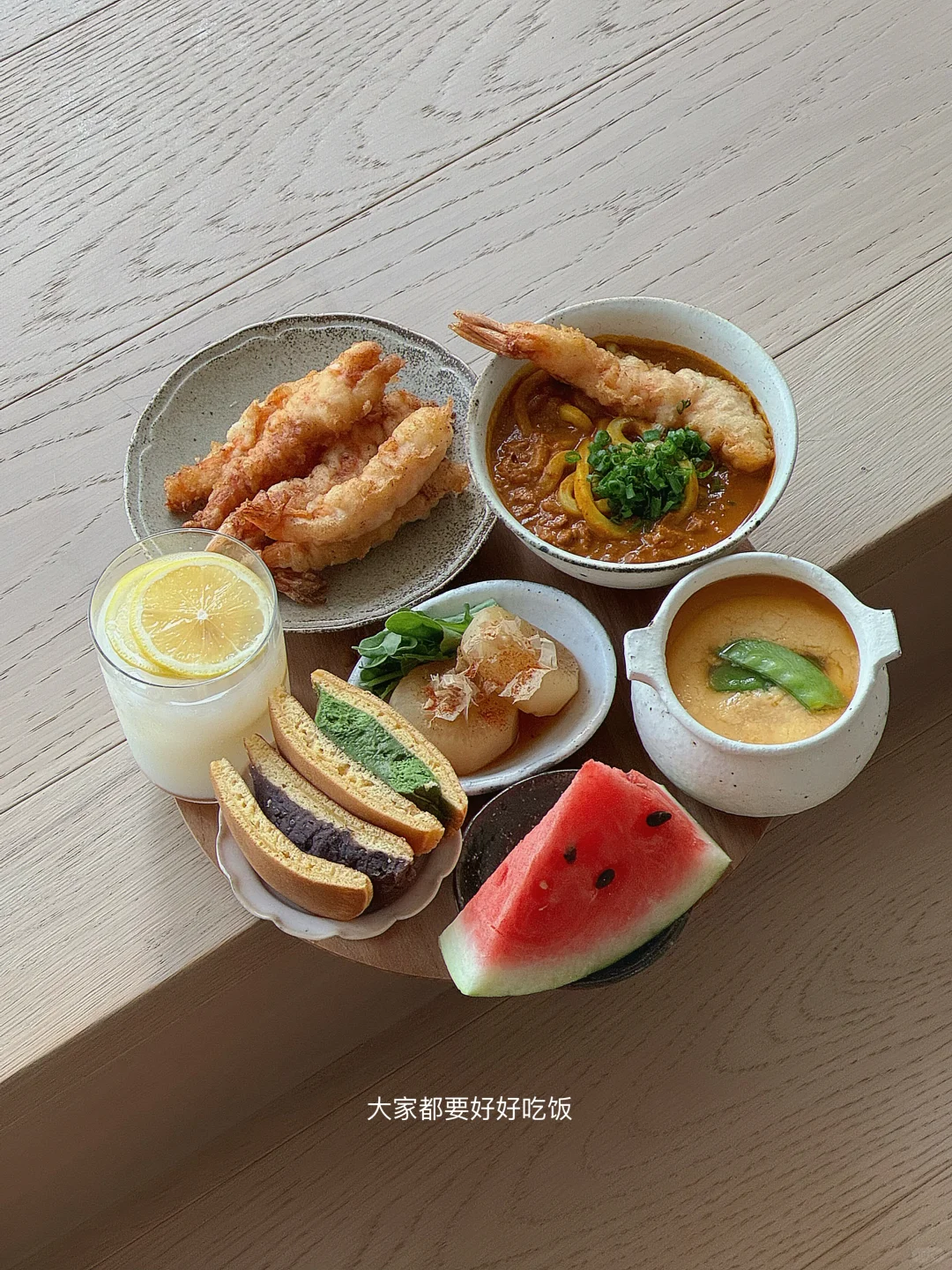 - 孤独食堂今日菜单📝 鸡肉番茄咖喱乌冬🍜 炸炸天妇罗🍤 蛤蜊炖蛋🦪 关东猪萝卜芝麻菜🍃 红豆+抹茶铜锣烧🫘 柠檬可尔必思🍋🥛 籽很多的西瓜🍉哼 - 炸虾天妇罗经常做 主页🔍 我有写过喔 随便黑虎虾或白虾 选大一些的哈哈哈 吃起来爽~ 记住你才是钱包的主人! - 孤独这玩意儿 你在意它 就是孤独 你享受它 它便是幸福~