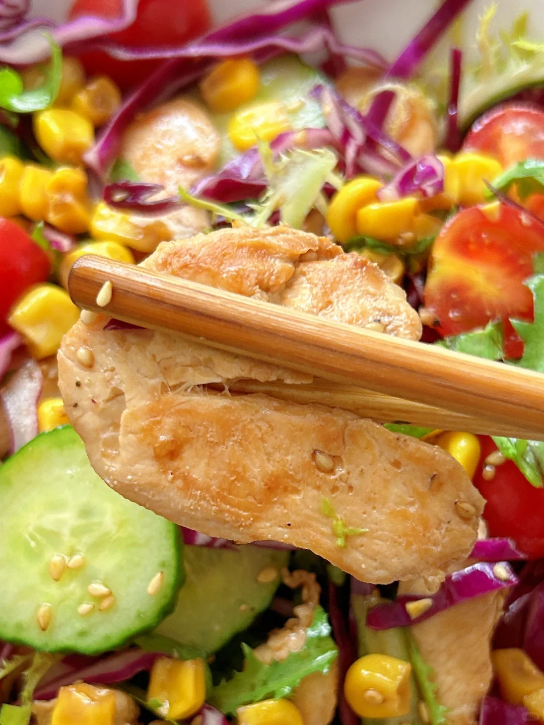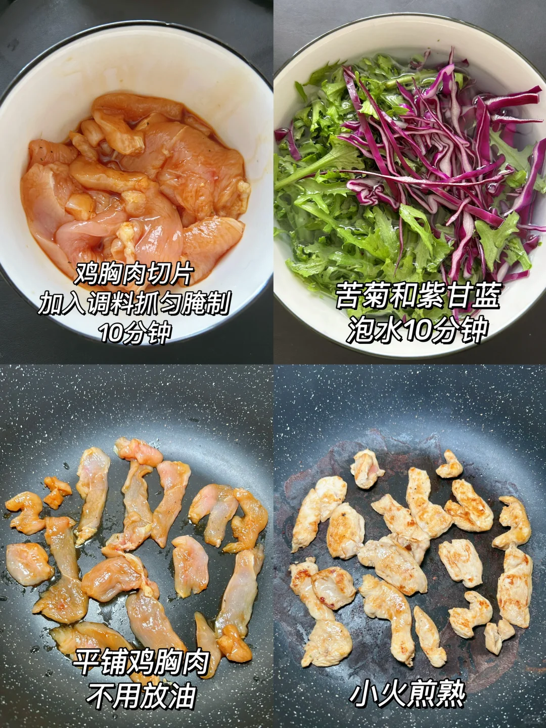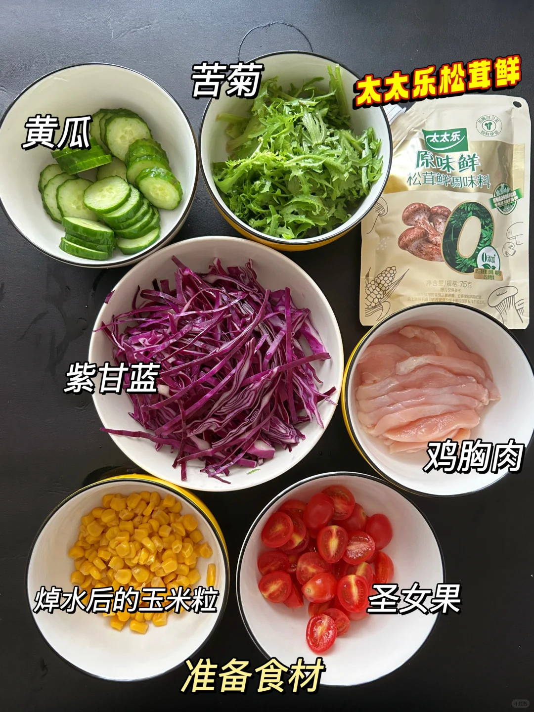 准备食材:黄瓜、玉米粒、小番茄、紫甘蓝、鸡胸肉、苦菊
