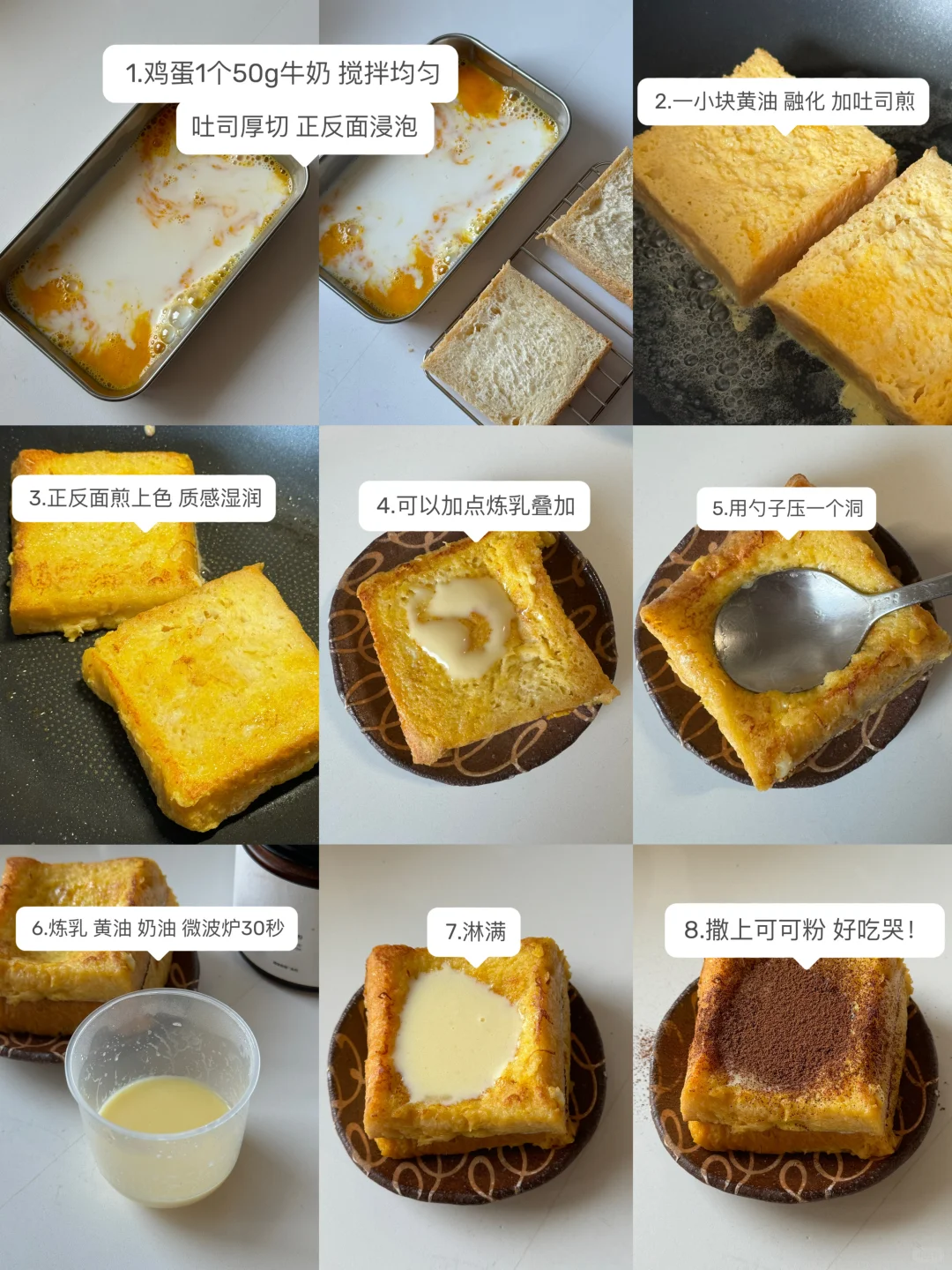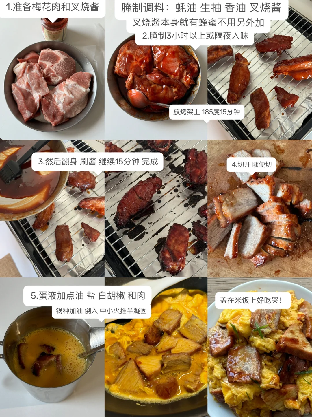 - 孤独菜单📝 叉烧滑蛋饭🥩 白灼芥兰🥬 Mini漏奶华🍞🥛 一颗冻柠茶🍋 - 港式茶餐厅的叉烧滑蛋饭吃不够 那就自己做 想吃几块吃几块 想切多厚切多厚! 记住 你才是叉烧饭的主人!做法附图!👉🏻 小小tips 叉烧酱是用来上色和增稠(含蜂蜜) 腌制肉的时候 还是要对酱汁进行调味! - 漏奶华🍞🥛没有女生会不喜欢吧! 今天撸啦面包 顺便做了个mini小吐司 步骤也给你们整好了!感动不!快点给我哭! - 三条吐司是给邻居和好朋友的啦~🍞 把用不完奶油、牛奶全部揉进去!香! 贴上了我的小猫贴纸hh 希望她们开心! 8过 包装用心归用心 每个人只能给一条 毕竟人性这块 拿捏得死死d 🤏🏻