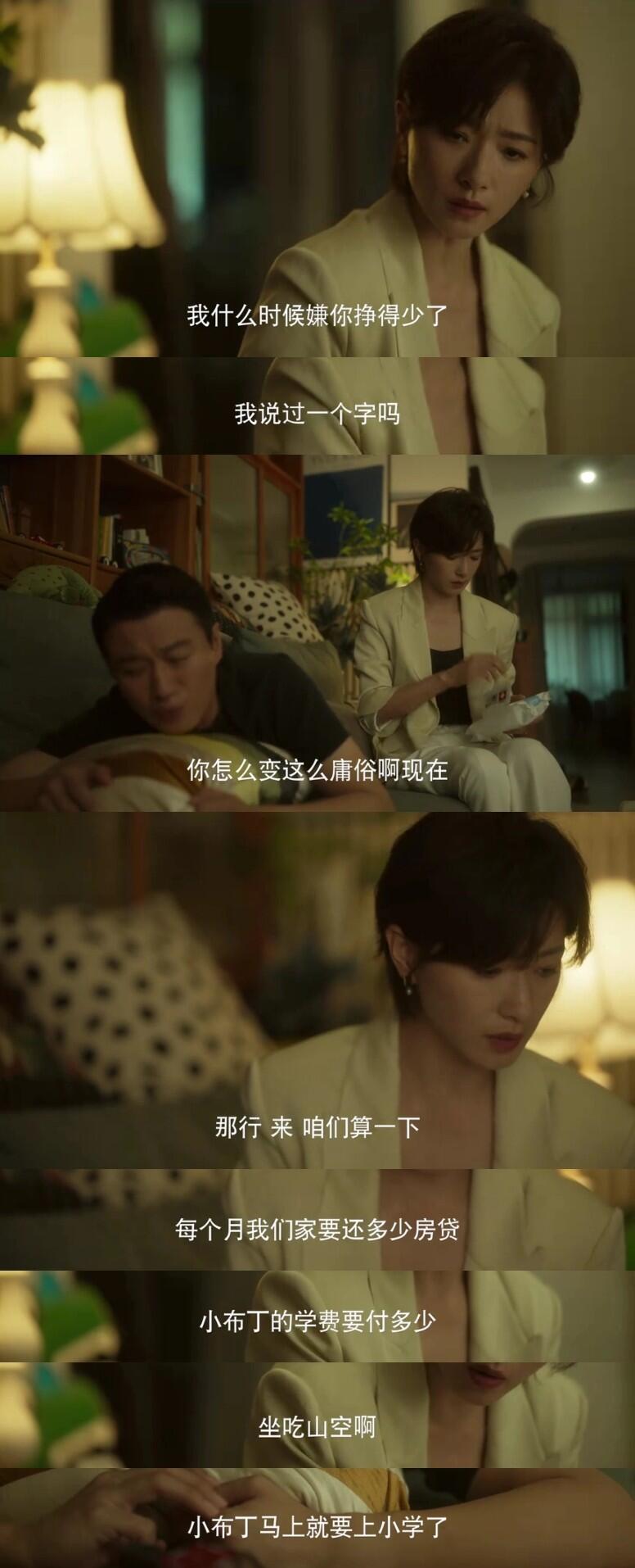 黄牡丹事业不顺,苏苏焦虑过两年儿子上小学需要更多的钱。黄牡丹嘴上说苏苏过于焦虑,实际还是积极的去要账。苏苏嘴上埋怨,还是给黄牡丹买了按摩椅。嘴上说黄牡丹太胖,实际心疼黄牡丹跑瘦了。趁着儿子睡着,点个烧烤喝点酒夫妻俩敞开了聊,真的演的很自然。