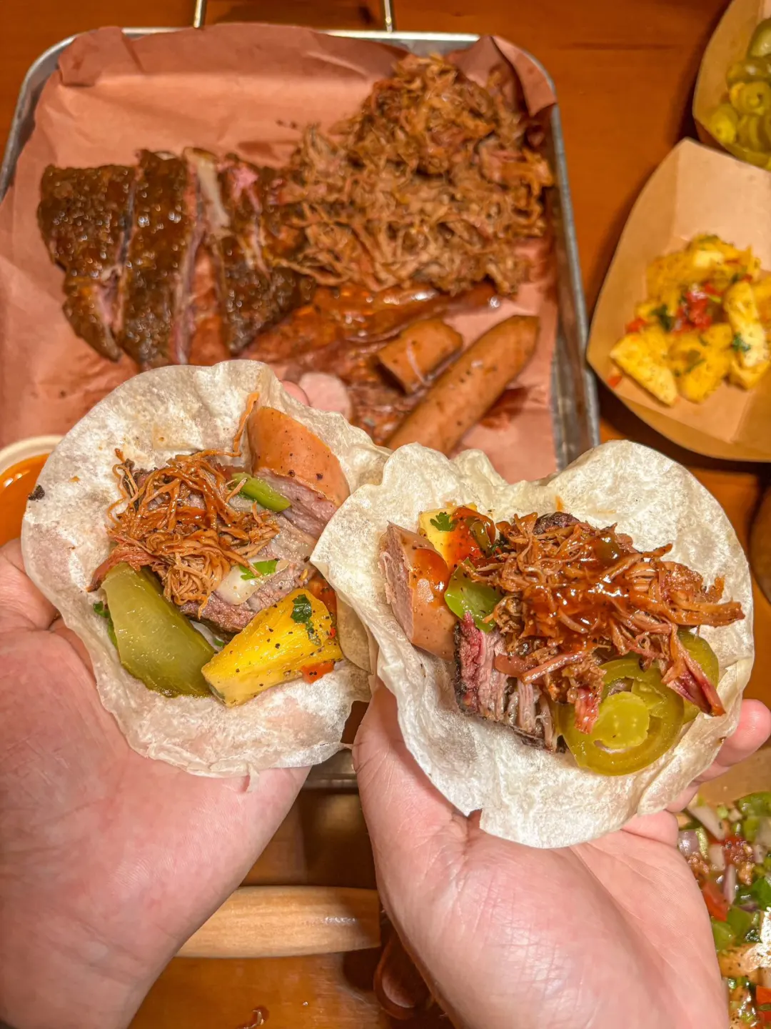 🌟烟熏牛肋排真的超级推荐,肉食爱好者的最爱😋用热乎乎的饼皮包着菠萝+番茄沙拉+墨西哥辣椒➕酸黄瓜再加上大块牛肉牛🥩