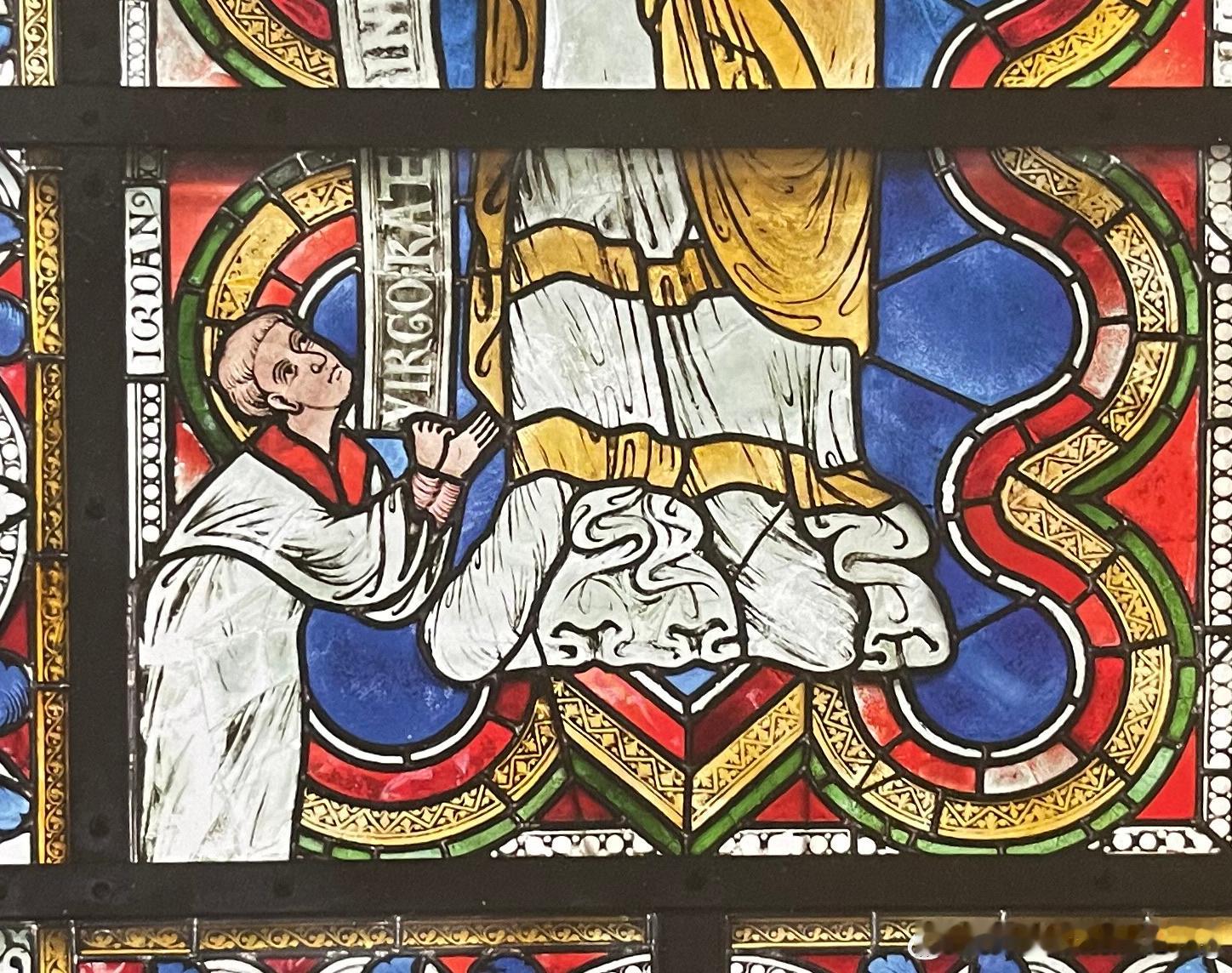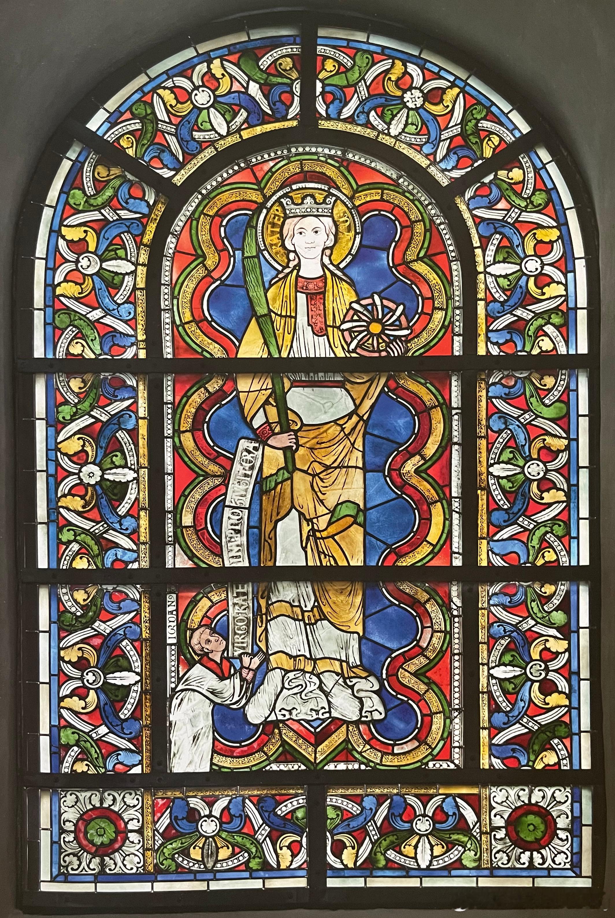 科隆的圣库尼贝特教堂现存有几面描绘站姿圣徒的大型窗户,例如戴着头冠、光环与手持棕榈枝的圣凯萨琳,其画面边缘的串珠状缘饰上写有一位神职人员依欧达诺斯的名字,他可能是圣库尼贝特教堂的一位参事,逝世于1238年。他在图像左下方以敬拜者的姿态出现,这也显示他是位捐赠者(图3-4)。