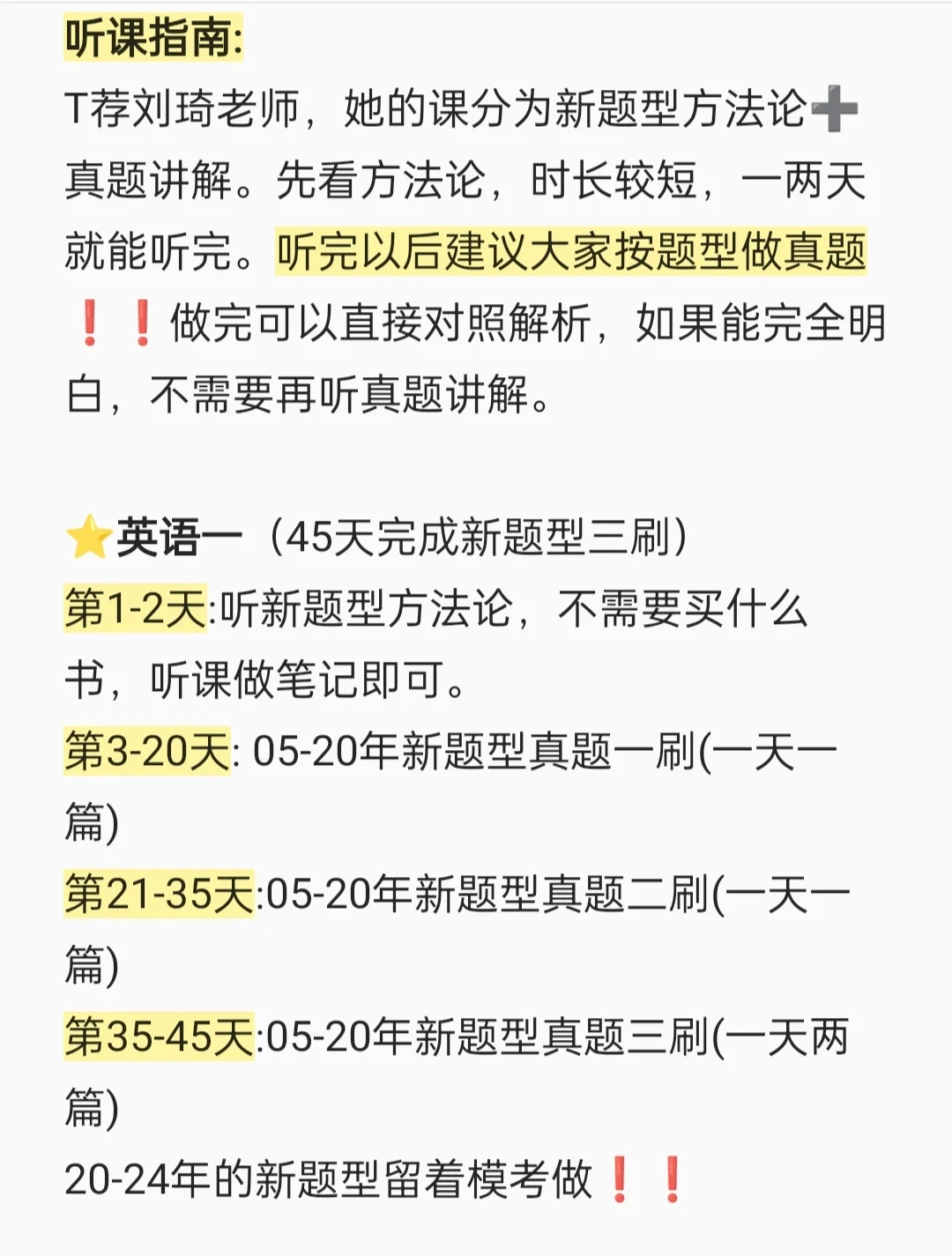T荐刘琦老师,她的课分为新题型方法论➕真题讲解。先看方法论,时长较短,一两天就能听完。听完以后建议大家按题型做真题❗❗做完可以直接对照解析,如果能完全明白,不需要再听真题讲解。