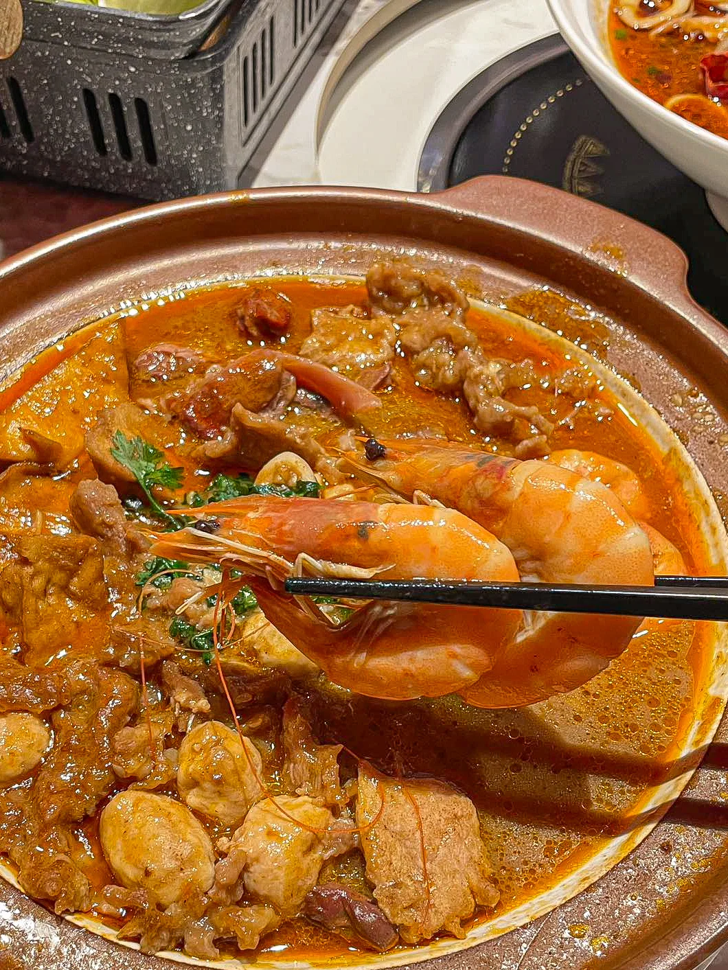 超级喜欢他家的炭烤羊排!!!肉质很嫩很入味🤤蘸上辣椒真的很香!!还有沙茶一品锅里面料很足 沙茶味也非常浓郁👍