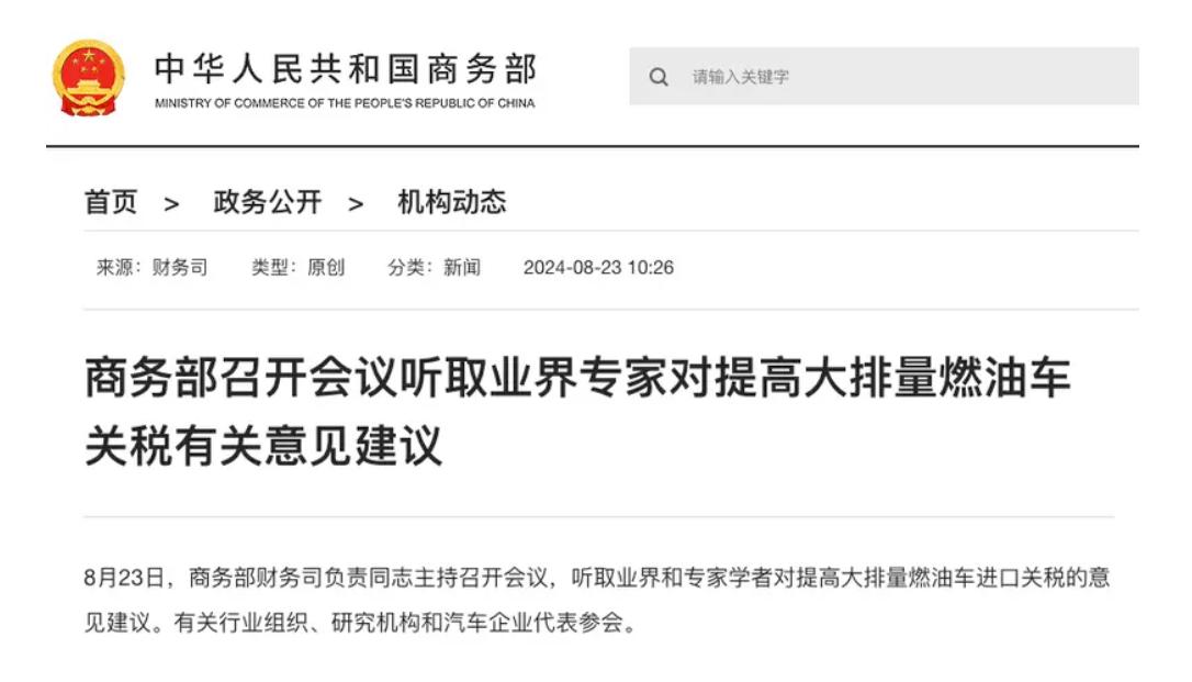 【商务部召开会议听取业界专家对提高大排量燃油车关税意见建议】8月23日,商务部财务司负责同志主持召开会议,听取业界和专家学者对提高大排量燃油车进口关税的意见建议。有关行业组织、研究机构和汽车企业代表参会。 5月23日,在商务部例行记者会上,商务部新闻发言人何亚东回应“称中国正考虑对大排量或2.5升以上进口汽车加征关税”,表示:“中国坚定走绿色低碳发展道路,始终鼓励和支持各行业向绿色低碳方向转型升级、实现高质量发展,包括汽车行业在内的各领域专家也在就此开展研究,为应对全球气候变化建言献策。”【来自懂车帝车友圈】