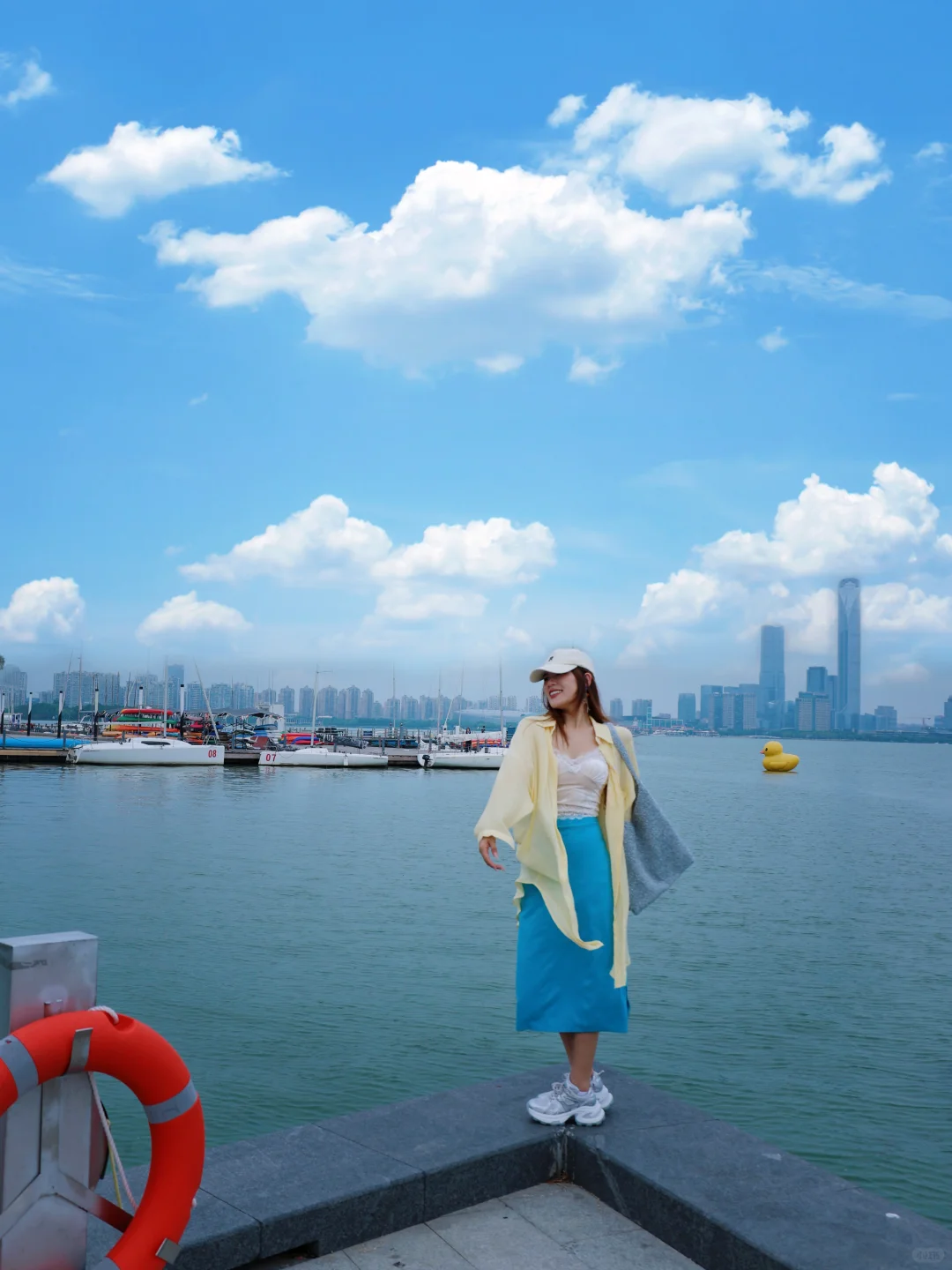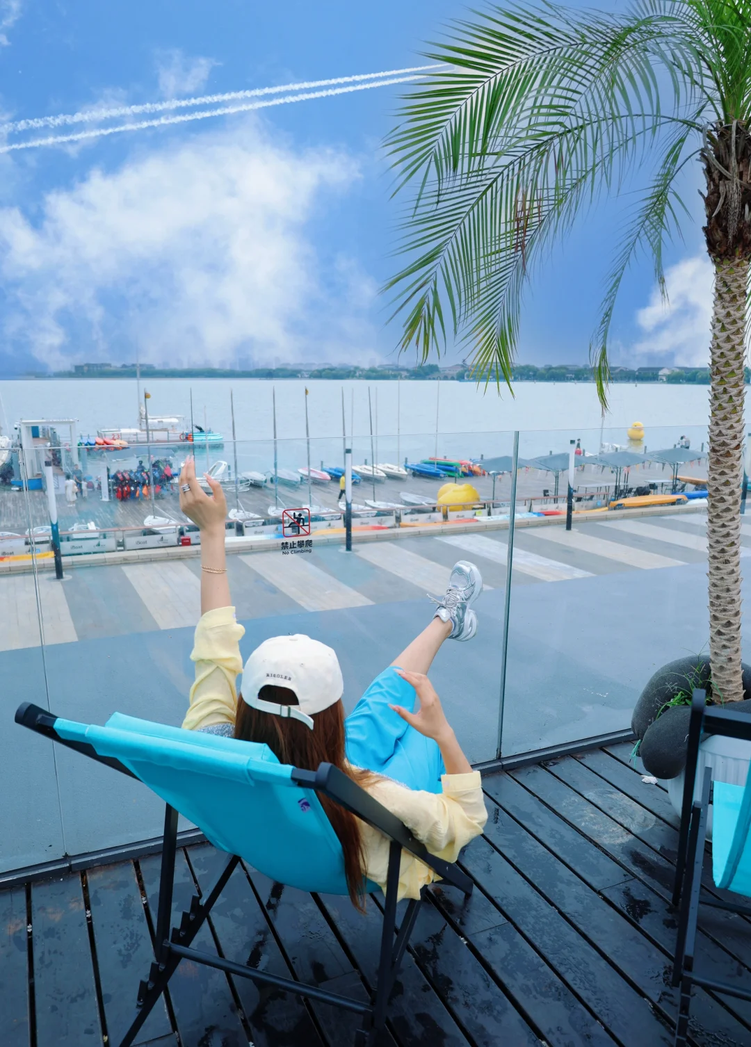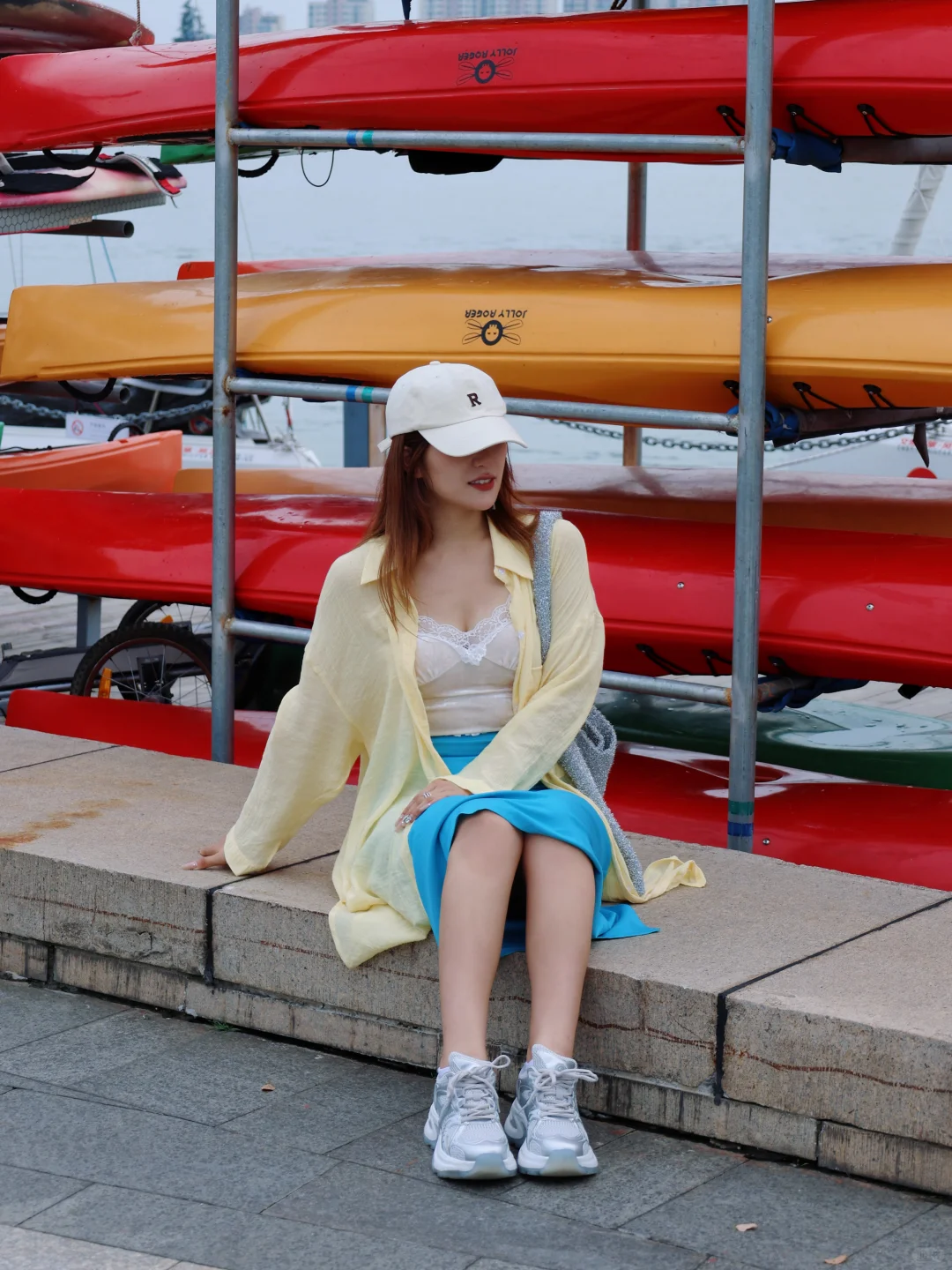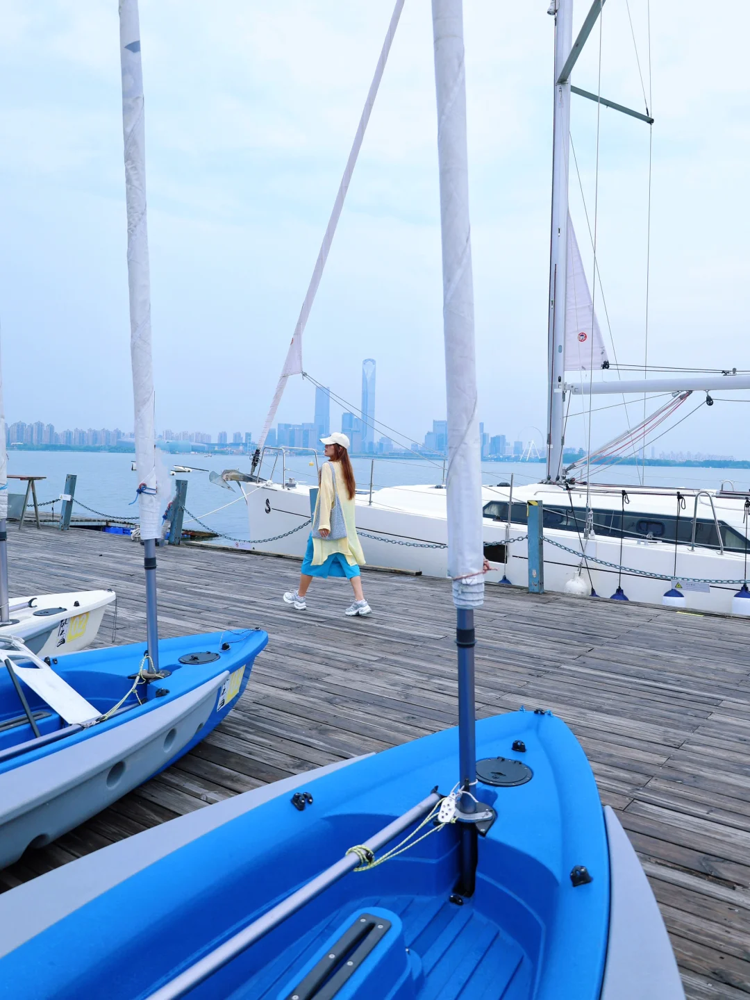 苏州你变了! 已经不是我认知里的样子了[萌萌哒R] - 谁能想到[赞R]水上户外运动在苏州也可以轻松实现了! 金鸡湖新开的风之驿太出片了,📷 椰子树,蓝色路牌,无痛到达济州岛哈哈哈 - 水上项目有很多🧼 皮划艇,游船🚣,快艇,出海🌊变成日常项目啦~ - 今日OOTD: 🧥:淡黄衬衫(防晒又休闲)➕湖蓝半裙👗 (这种浅色系和海边真的很搭!) 👟:苏茵茵老爹鞋 (增高7.5cm,拉长腿部比例,旅游暴走也不累)
