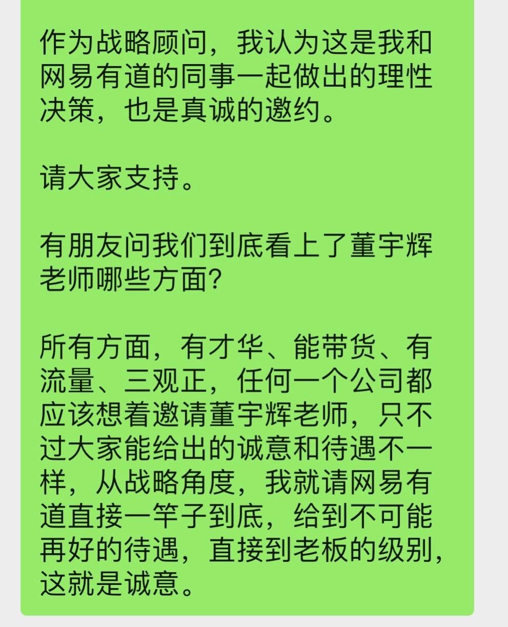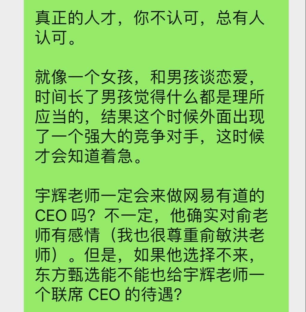 昨天我建议东方甄选应该让董宇辉做联席 CEO,今天我自己就付诸行动了。因为我是网易有道的战略顾问,直接和网易有道一起,邀请董宇辉老师来做网易有道的联席 CEO。这就是代表着诚意,董宇辉在东方甄选甚至连高管都不算,我们直接跳过一般的高管级别,请董宇辉老师来做老板,这应该是一家送去能给出的最高待遇了吧。 物质和待遇给够,但是还不够,东方小孙觉得给董宇辉几千万了,你还想怎么样?其实,并不单单是钱的问题,除了钱,我们能给的是真正的认可和信任。 网易也是大厂,网易有道也是上市公司,请董宇辉老师做联席 CEO,就是这样肯定宇辉老师的价值,我们觉得他值。 真正的人才,你不认可,总有人认可。 就像一个女孩,和男孩谈恋爱,时间长了男孩觉得什么都是理所应当的,结果这个时候外面出现了一个强大的竞争对手,这时候才会知道着急。 宇辉老师一定会来做网易有道的 CEO 吗?不一定,他确实对俞老师有感情(我也很尊重俞敏洪老师)。但是,如果他选择不来,东方甄选能不能也给宇辉老师一个联席 CEO 的待遇? 作为战略顾问,我认为这是我和网易有道的同事一起做出的理性决策,也是真诚的邀约。 请大家支持。 有朋友问我们到底看上了董宇辉老师哪些方面? 所有方面,有才华、能带货、有流量、三观正,任何一个公司都应该想着邀请董宇辉老师,只不过大家能给出的诚意和待遇不一样,从战略角度,我就请网易有道直接一竿子到底,给到不可能再好的待遇,直接到老板的级别,这就是诚意。 #东方甄选 #董宇辉丈母娘 #东方甄选直播 #董宇辉小作文 #董宇辉