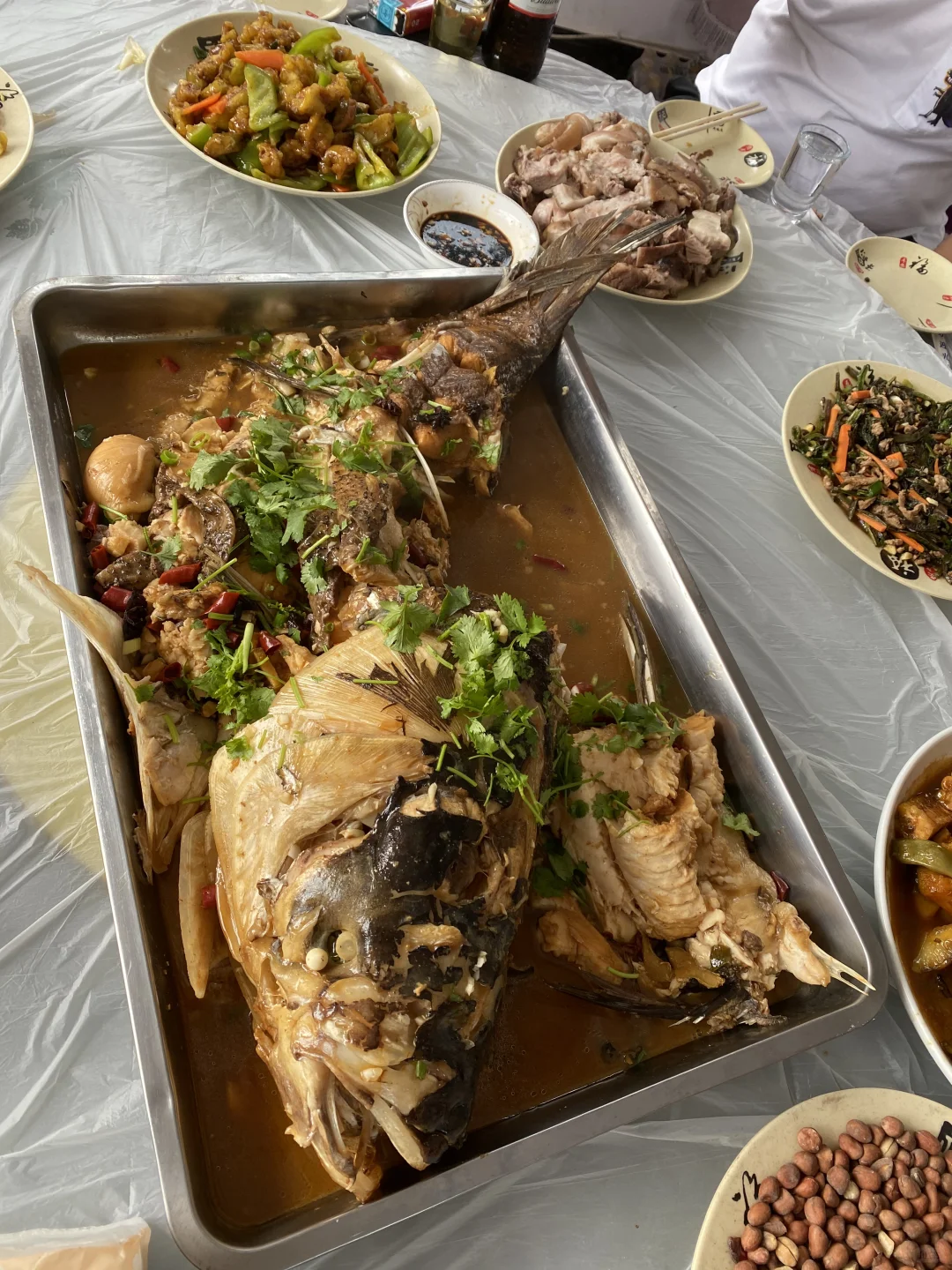下山后出来左边有农行家园,做的烤全羊和炖鱼还不错,环境很干净