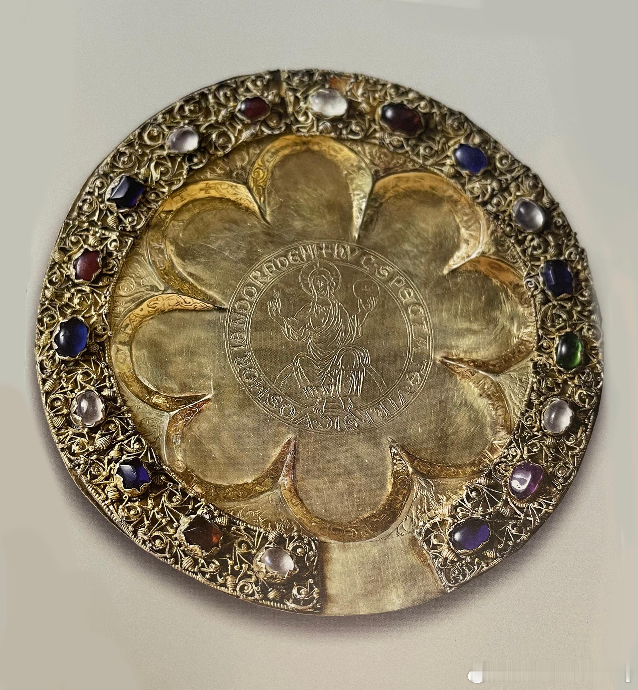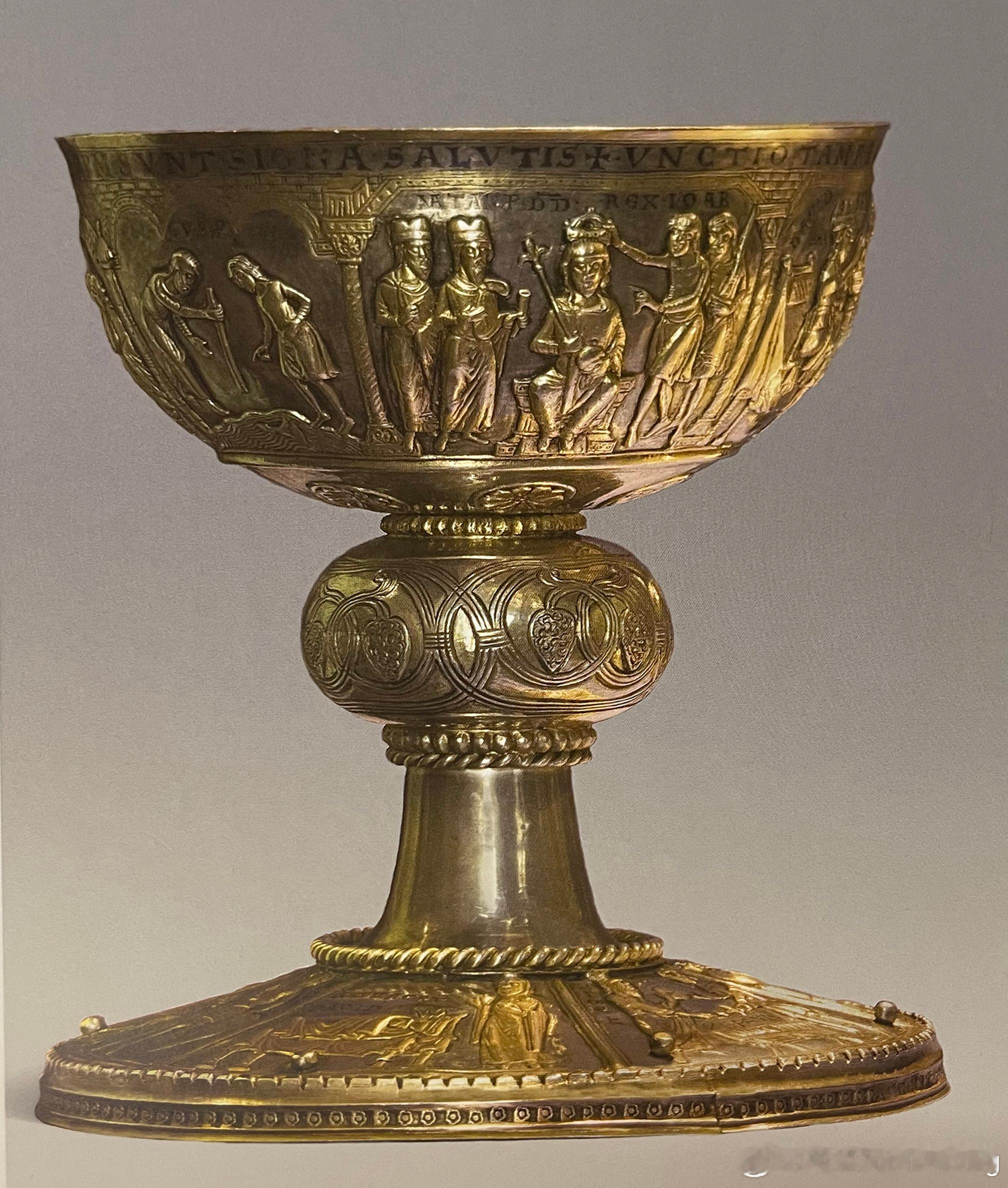图3. 4. 圣贝恩瓦德圣餐杯与圣盘,约13世纪中叶,银、浮雕、雕刻、镀金、金银丝细工、镶有宝石,高17.9厘米,圣盘直颈17.7厘米,希尔德斯海姆,圣哥达教堂