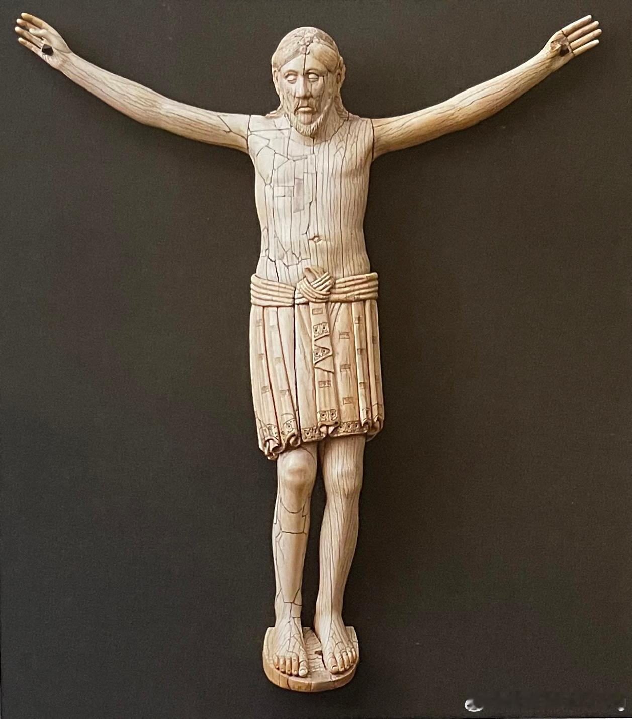 德国南部班贝格教区的美术馆保留了一件象牙制的基督受难像,造于1130--1140年。举起双臂钉于十字架的基督立于脚板上,其背后没有十字架。据推测此基督像为中世纪的班贝格主教座堂中早期圣米迦勒祭坛上胜利十字架的一部分。耶稣受难像通常与复活节的礼拜仪式相关联,但在这个例子中仅有15世纪的文献记载了其使用。根据文献,此圣像于棕枝主日时从十字架上卸下,并置于教堂门前,此教堂门被视为恩典门,为恩典的入口。在耶稣受难日时,十字架会被摆放在高祭坛上供人崇敬,并在复活节游行夜的过程中被放置回传统的位置上(图3.4)。