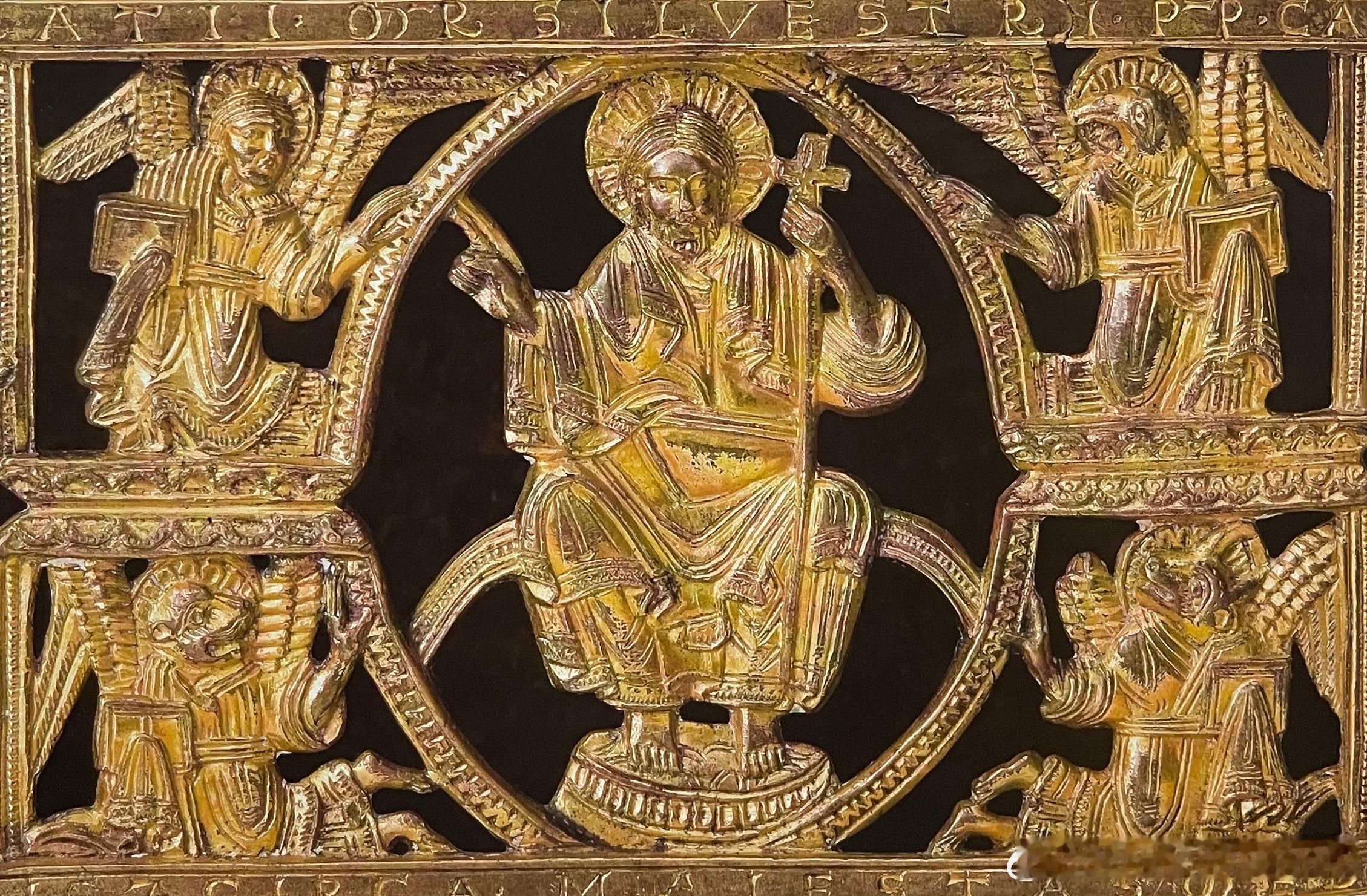 德国桑腾主教座堂珍宝馆中以青铜盒作为十字架基座,为耶稣十字架受难像置于祭坛上时的支撑物,其顶部与四壁皆有透孔及镀金。其中一个长面的杏核状光圈内呈现基督于彩虹上登基,身旁伴随着带翅膀的福音传道者。在另一面,圣母玛利亚及天使长位于基督圣像两侧,顶部及短侧边为置有使徒的小拱廊。顶部角落坐有完整的年轻教士辅祭雕塑像,其有力的外形与平面的青铜图像相区分,并使观者看到制作者制作青铜作品的技术:据推测创作者来自下萨克森(图1.2)。
