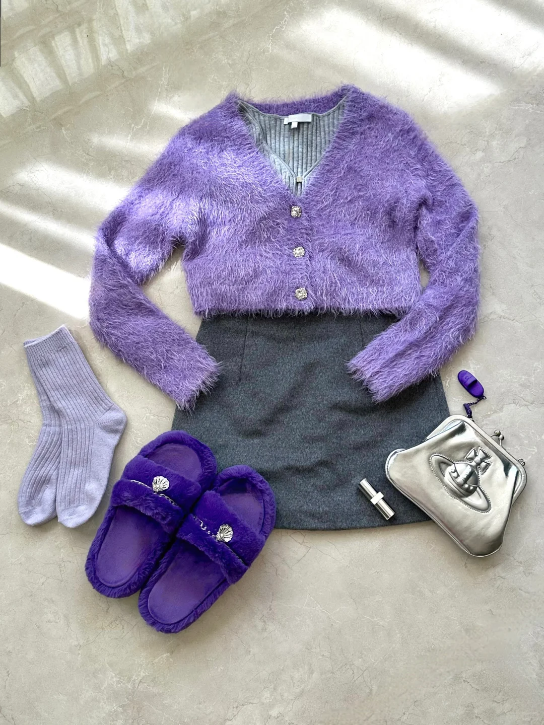 今年是我第一次在国内过秋天 🍂 天气慢慢的凉快,不光舒服,也到了可以随心所欲搭配衣服的时候。 像这一次,我选择了紫色毛衣➕灰色短裙的穿搭,可以带一件薄外套披上增加层次感! 平日模特工作外,我本来就喜欢各种鲜艳的颜色,紫色也一直是我的心头好,没想到千金感十足~ 今天特意搭配了FILA贝壳毛毛拖鞋。这双鞋是长长的绒毛质感,特别舒服柔软,很好的呼应了我今天的千金紫OOTD! 鞋面上挂着系列标志的小贝壳和珍珠,好精致呀,搭配贵气的紫色,穿上秒变富贵千金 每个女孩子都值得一双贝壳毛毛拖鞋~要做自己最坚实的贝壳 永远爱自己!💜 ———
