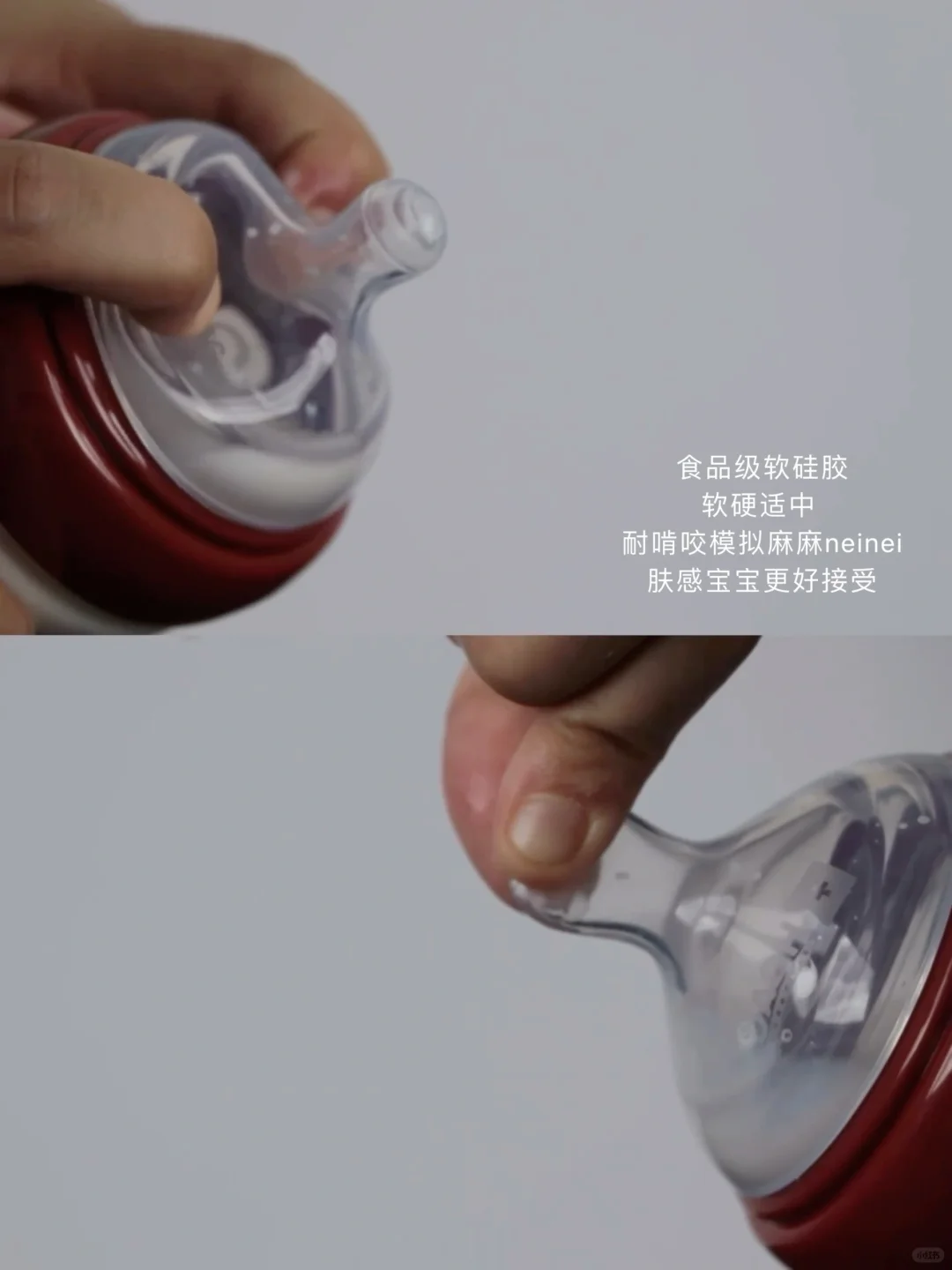 奶嘴是食用级硅胶材质,软硬适中,模拟麻麻neinei肤感