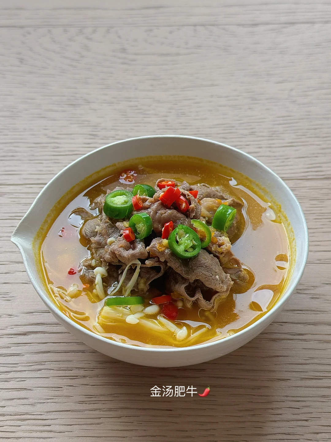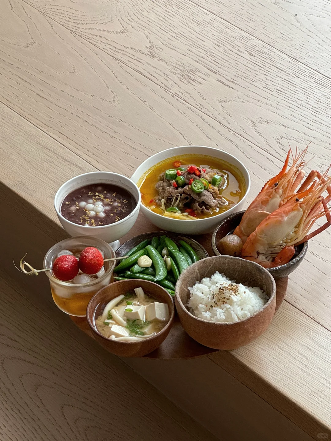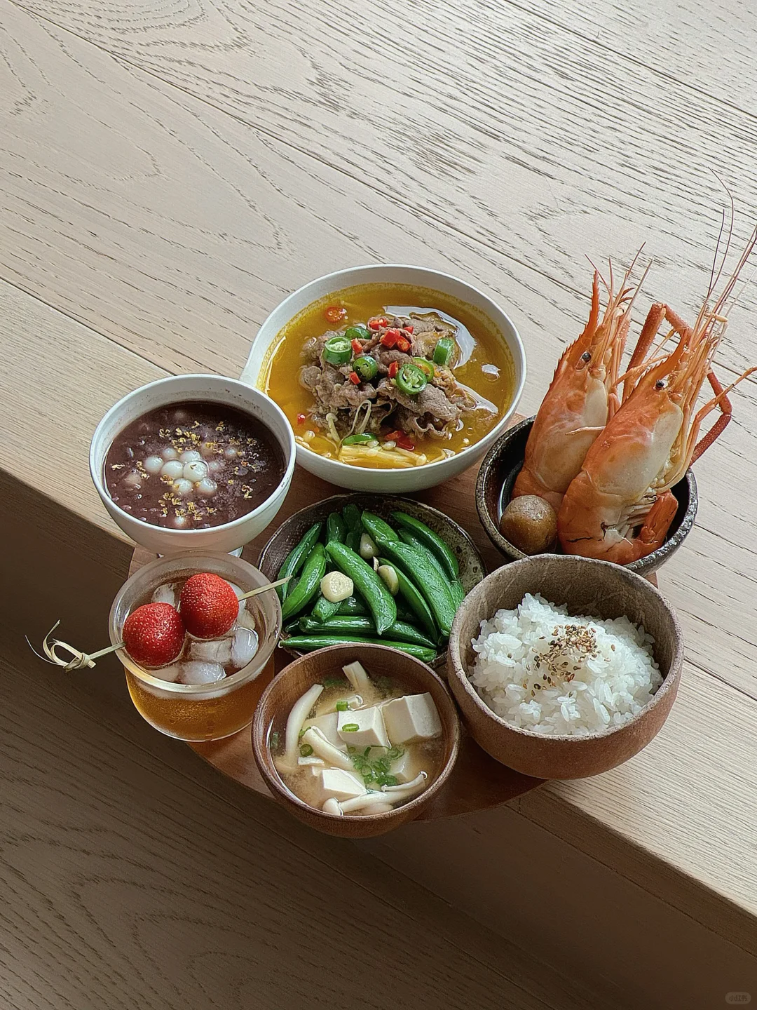 今日菜单📝 金汤肥牛🥩 话梅花雕太湖一号🦐 清炒甜豆荚🫛 豆腐白玉菇味增汤🍄‍🟫 陈皮红豆沙桂花小圆子🌼 梅酒+甜甜d草莓🍓 - 金汤肥牛🥩(做法附图) 其实就是酸汤肥牛 但家里没有调料包 于是自己做 金汤的秘诀是加了南瓜泥 牛肉片有肌红蛋白 会把汤弄浑浊 事先和金针菇一起焯水即可。 - 话梅花雕太湖一号🦐 风很大的超大号罗氏虾 今天终于吃上了! 话梅花雕卤的 感觉有点甜了 下次可以自己做 是不是在很多人的心中上海人喜欢吃甜的呀! 因人而异 我只是喜欢在菜里放点糖调个鲜。 - 陈皮红豆沙桂花小圆子🌼(做法附图) 红豆提前一晚上泡发比较容易煮开花 陈皮的香和冰糖的甜 在口中很好的过度了 加点糯叽叽的小圆子撒上桂花 秋天快乐! - 晚上偷个懒 煮了松叶蟹火锅 很鲜很美味🦀 又是很爱自己、好好吃饭的一天 珍惜自己每一餐的福报 生活才能细水长流。
