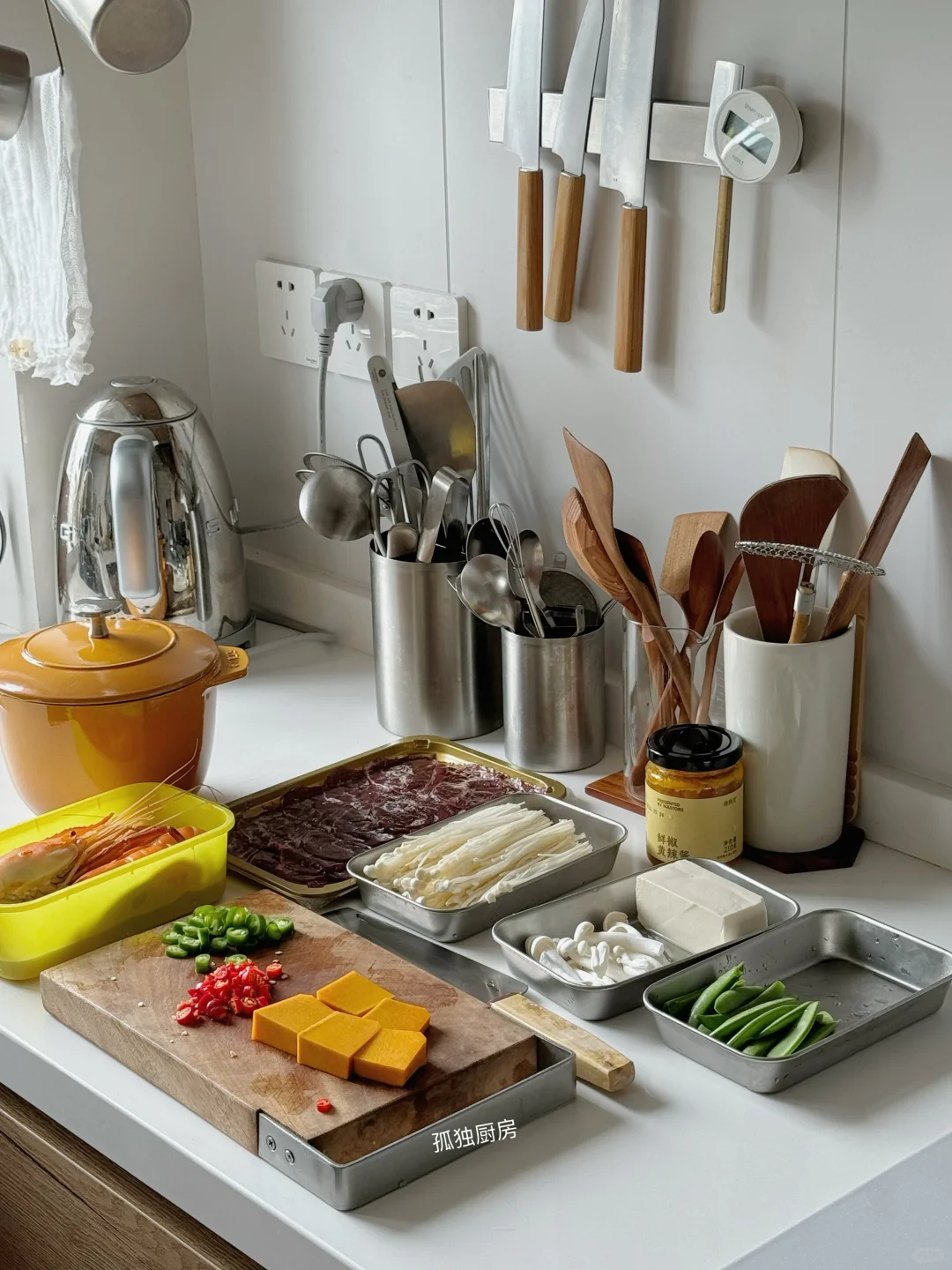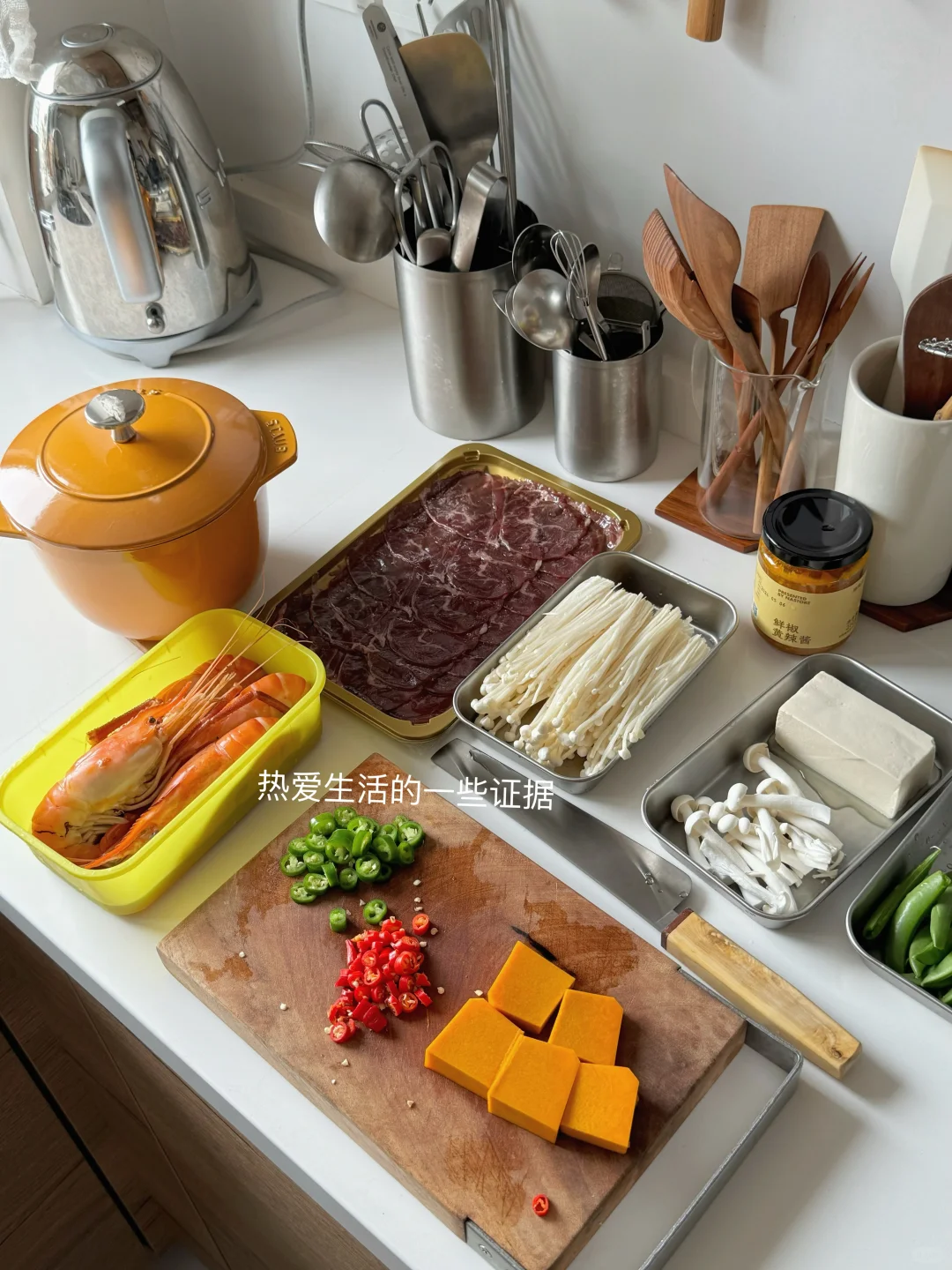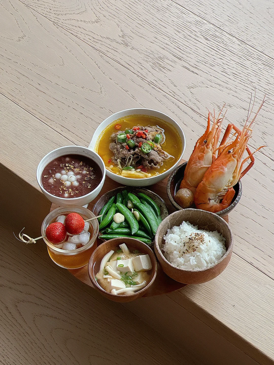 今日菜单📝 金汤肥牛🥩 话梅花雕太湖一号🦐 清炒甜豆荚🫛 豆腐白玉菇味增汤🍄‍🟫 陈皮红豆沙桂花小圆子🌼 梅酒+甜甜d草莓🍓 - 金汤肥牛🥩(做法附图) 其实就是酸汤肥牛 但家里没有调料包 于是自己做 金汤的秘诀是加了南瓜泥 牛肉片有肌红蛋白 会把汤弄浑浊 事先和金针菇一起焯水即可。 - 话梅花雕太湖一号🦐 风很大的超大号罗氏虾 今天终于吃上了! 话梅花雕卤的 感觉有点甜了 下次可以自己做 是不是在很多人的心中上海人喜欢吃甜的呀! 因人而异 我只是喜欢在菜里放点糖调个鲜。 - 陈皮红豆沙桂花小圆子🌼(做法附图) 红豆提前一晚上泡发比较容易煮开花 陈皮的香和冰糖的甜 在口中很好的过度了 加点糯叽叽的小圆子撒上桂花 秋天快乐! - 晚上偷个懒 煮了松叶蟹火锅 很鲜很美味🦀 又是很爱自己、好好吃饭的一天 珍惜自己每一餐的福报 生活才能细水长流。