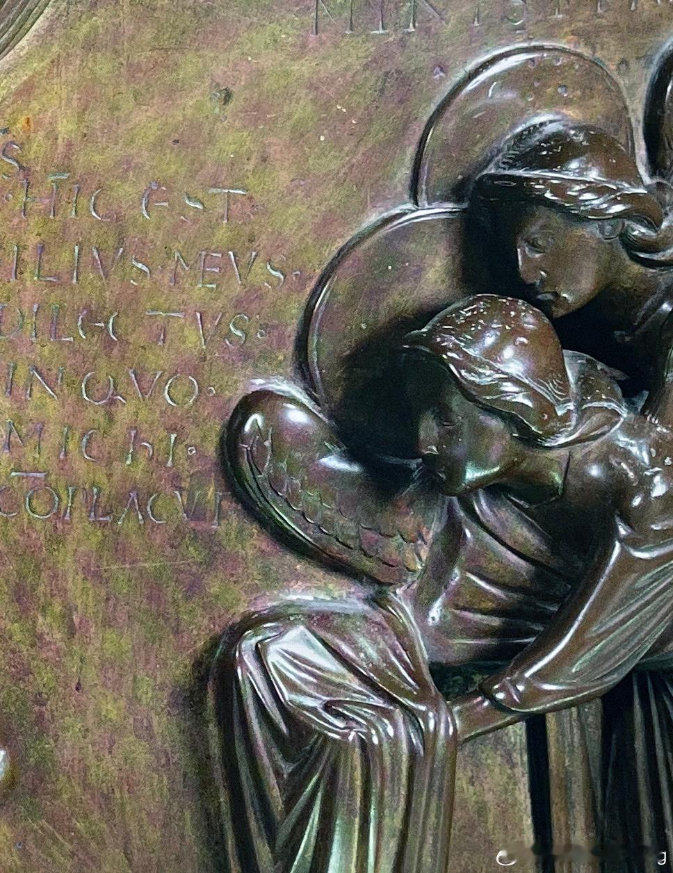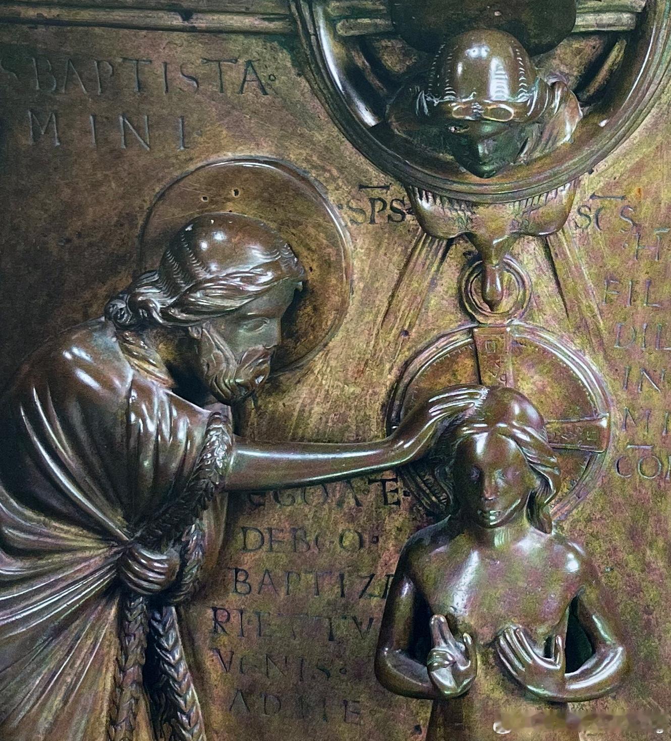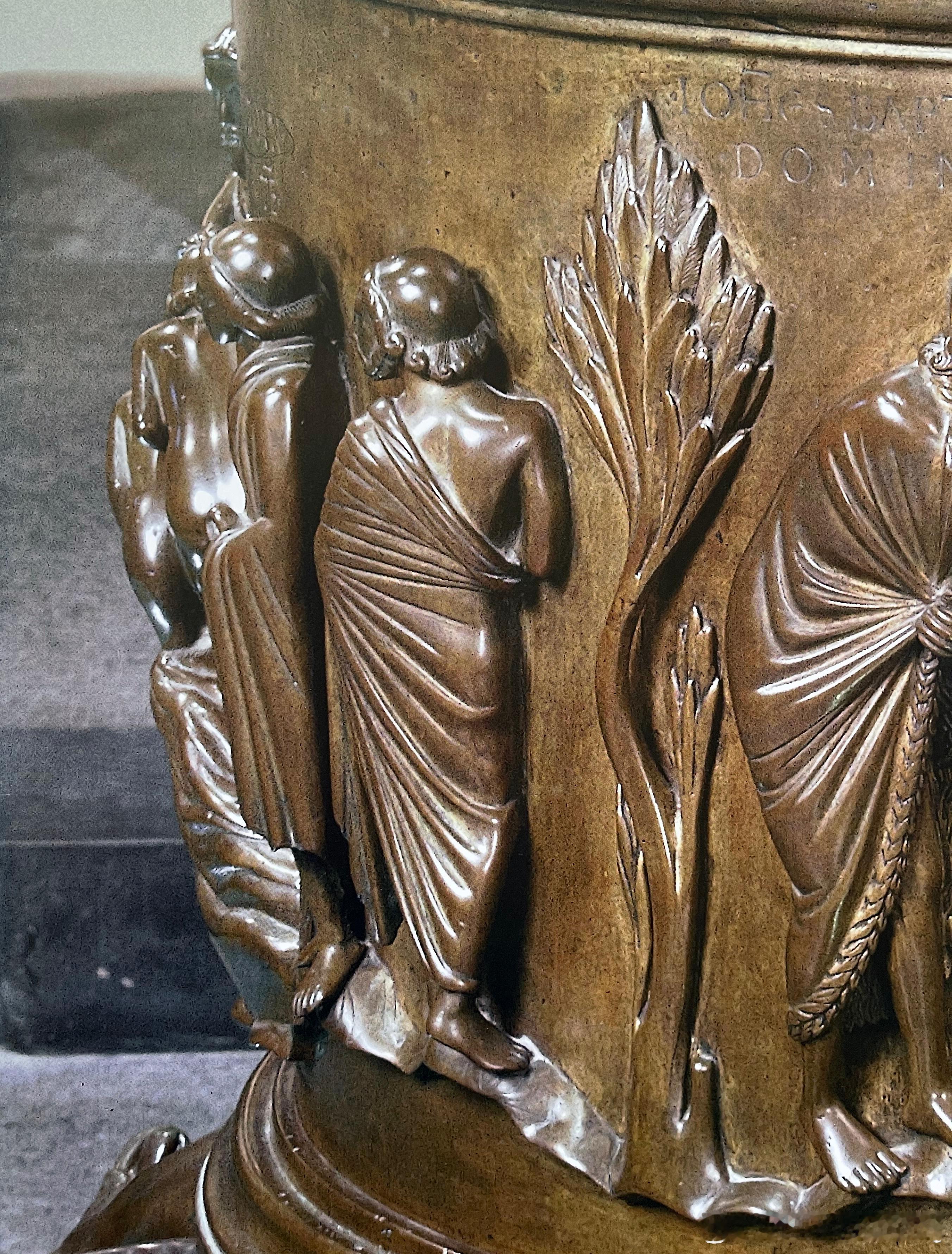据推测,1107--1118年,铜制艺术家伊·德·瑞尼为洗礼盆圣母修道院的院长制作了其中一件极为突出的作品:洗礼盆。其中施洗者约翰为基督于约旦河的洗礼成为浮雕的主要场景。而有些浮雕人像如此突出于背景之上,仿佛完整的雕塑。这引发了对于古典原型的联想---一个直到意大利文艺复兴前不再出现的呈现人像背景的技法。
