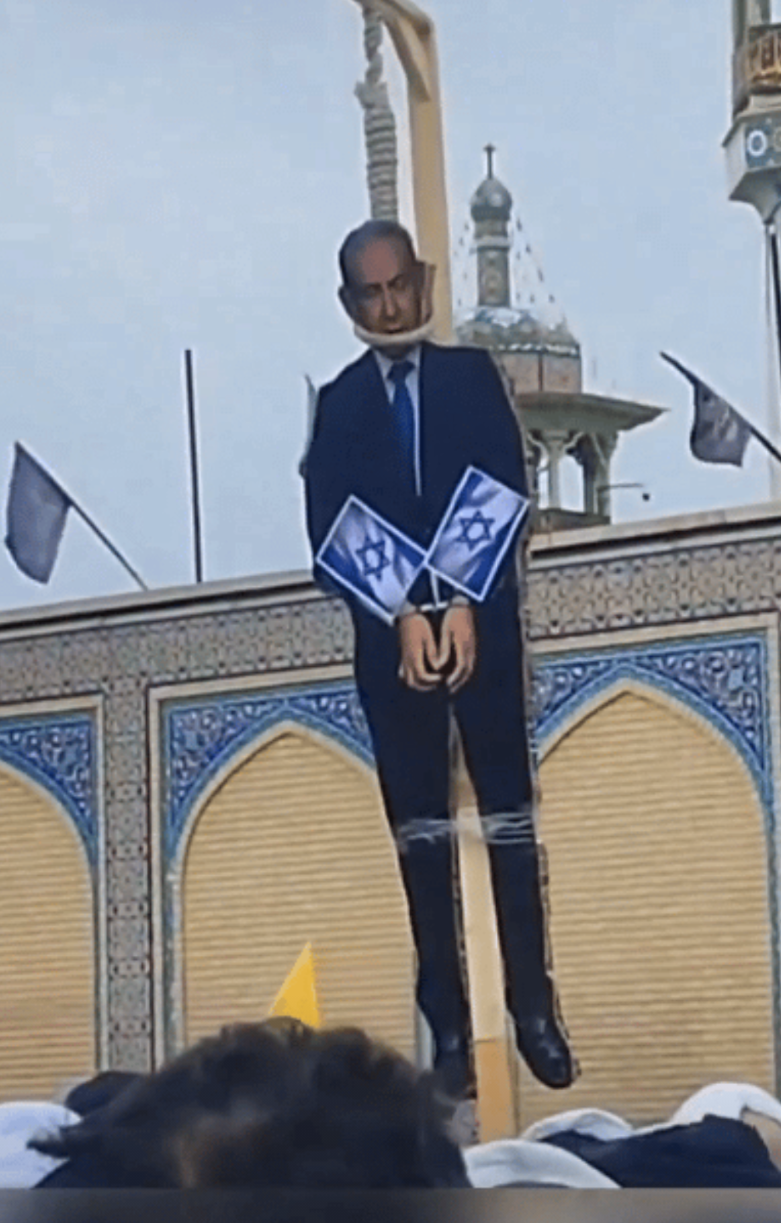 “绞死内塔尼亚胡!” 伊朗人也挺会玩儿,弄个跟真人一样大的照片模板,就把“内塔尼亚胡”挂到绞刑架上出气泄火去了。乍一看还挺唬人,只是,这实在没什么太大的意义。 类似的事情有人也干过,记得多年前,美国空袭了利比亚首都后,卡上校在群众大会上也玩儿了一把。他在讲完话后,宣布把美国总统拉上来当众斩首。在众人惊异的目光里,一头老牛被拉上来,脖子上挂着写着里根名字的牌子。配合着表演,扬声器里放着激昂的音乐,只是那曲子是《星球大战》序曲。