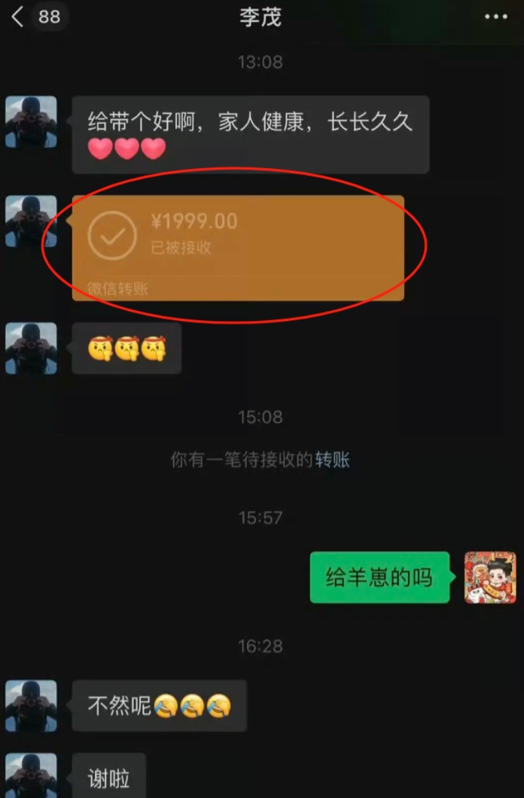 两个人连联系方式都没有,这个1999元的红包,还是刘洲成转交的——有网友猜测是李茂结婚时,马雪阳随了1999元,李茂现在是回礼,不知真假。