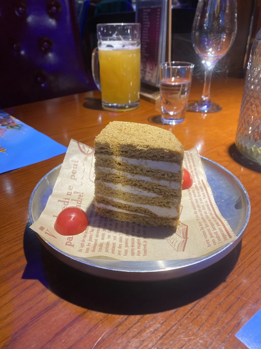 [草莓R]阿穆儿是100%正宗的俄餐,老板是专门去学过俄餐的,食材,调味料他都能叫出名字,最有特色的是菜单,这顿饭不仅是吃,更多的是在学历史学文化,菜单做的每道菜都有历史渊源,集合了东斯拉夫,格鲁吉亚,波兰菜为一体,真的长见识了,推荐鹅肝,红菜汤,罐牛都不错,黑面包也好吃,最推荐的是最后的甜品奶油和酸奶是他们现做,真的是肥甘厚腻,一滴水都没有的口感,不推荐的是这道烤鲈鱼,有股不新鲜的味,还挺贵的一道菜