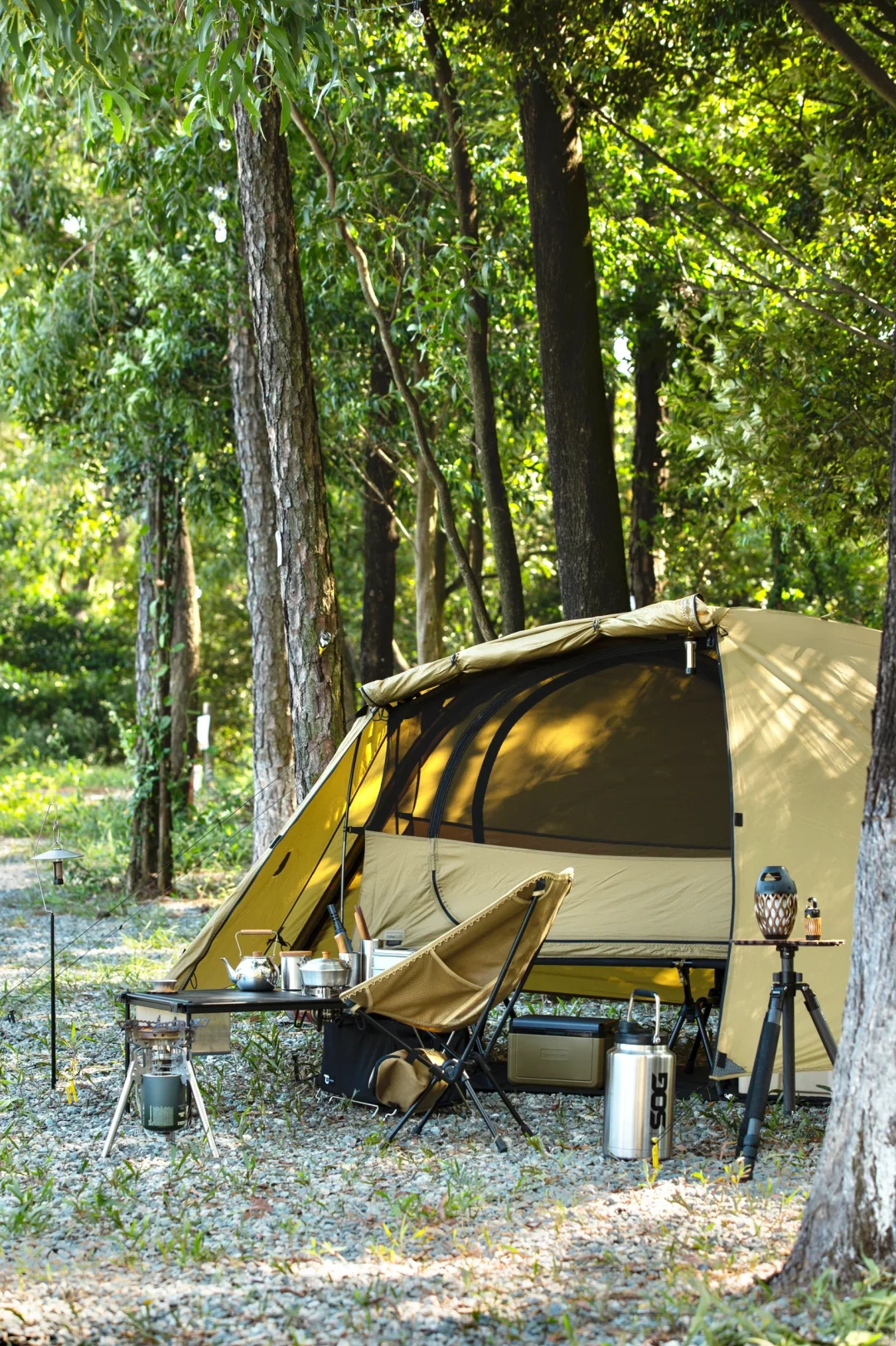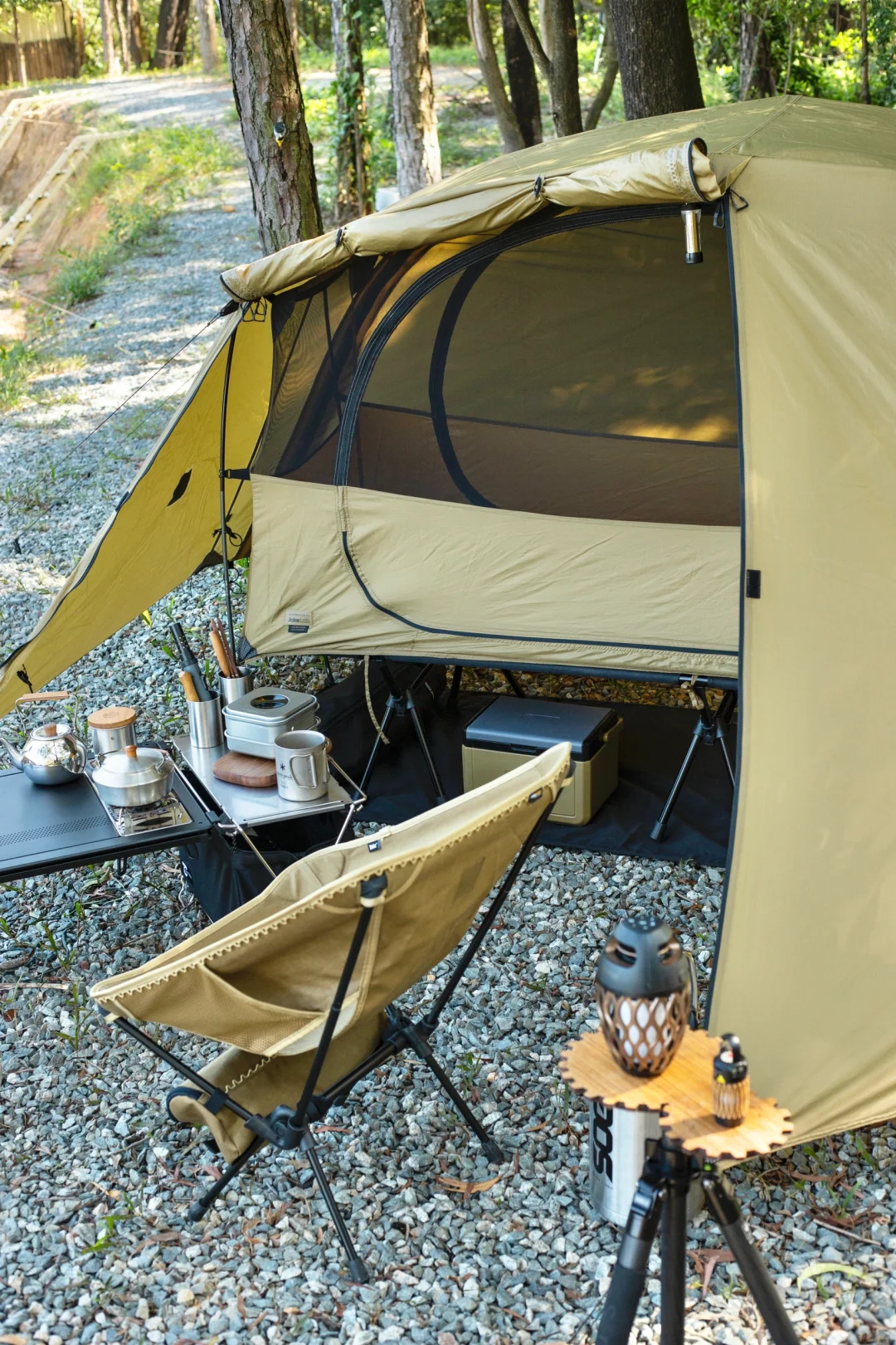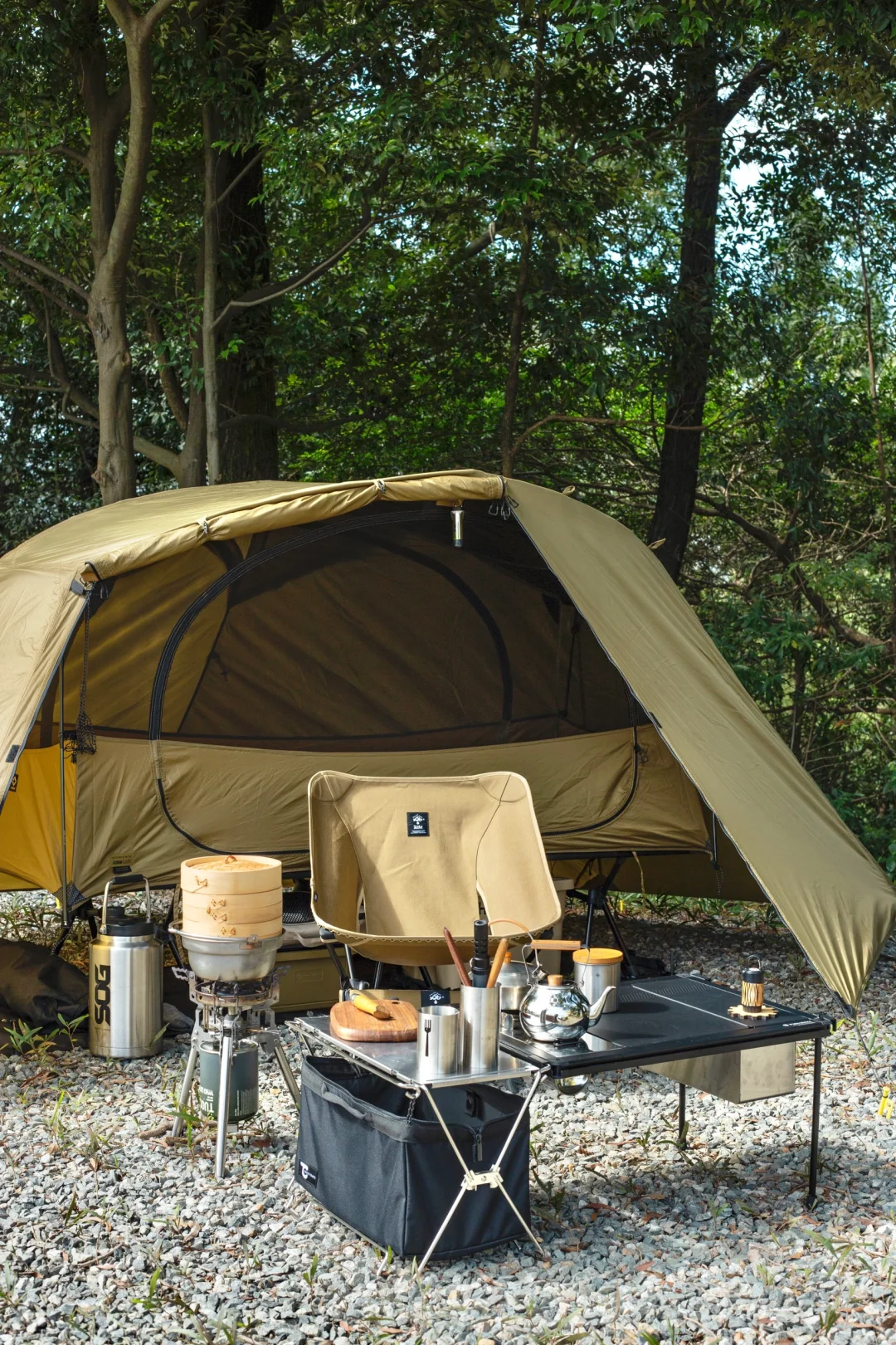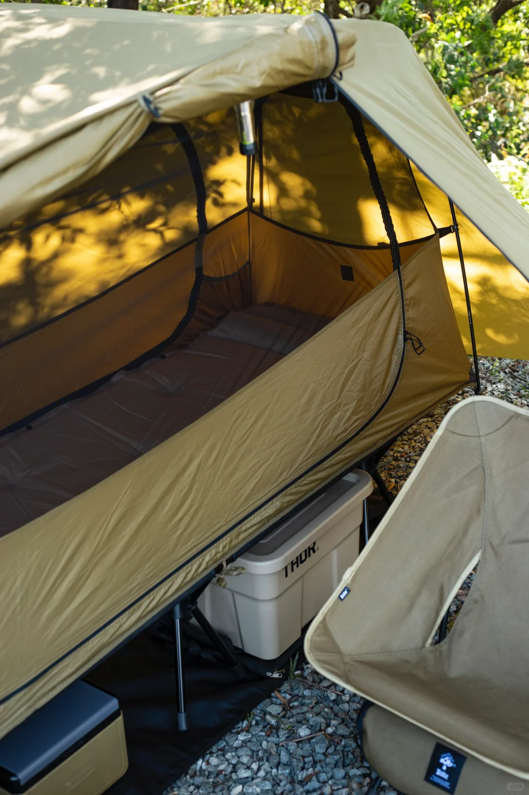 分享一组solo露营床帐的搭配: 这次大搭配思路是轻量化「小细腿」,可以看到行军床腿,月亮椅腿,桌腿,三脚架,灯杆都是黑色小细腿。 黑色地垫可以让床帐视觉上更有“悬浮感”,有地垫隔潮隔脏,床底可以放收纳箱和保温箱。 这次带了一个mini保温箱,刚好和帐篷的狼棕色近似,这个季节防个冰袋冷藏鸡蛋和午餐肉完全没问题。