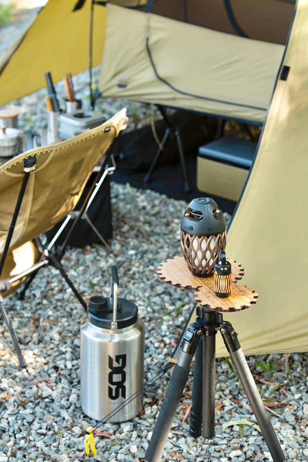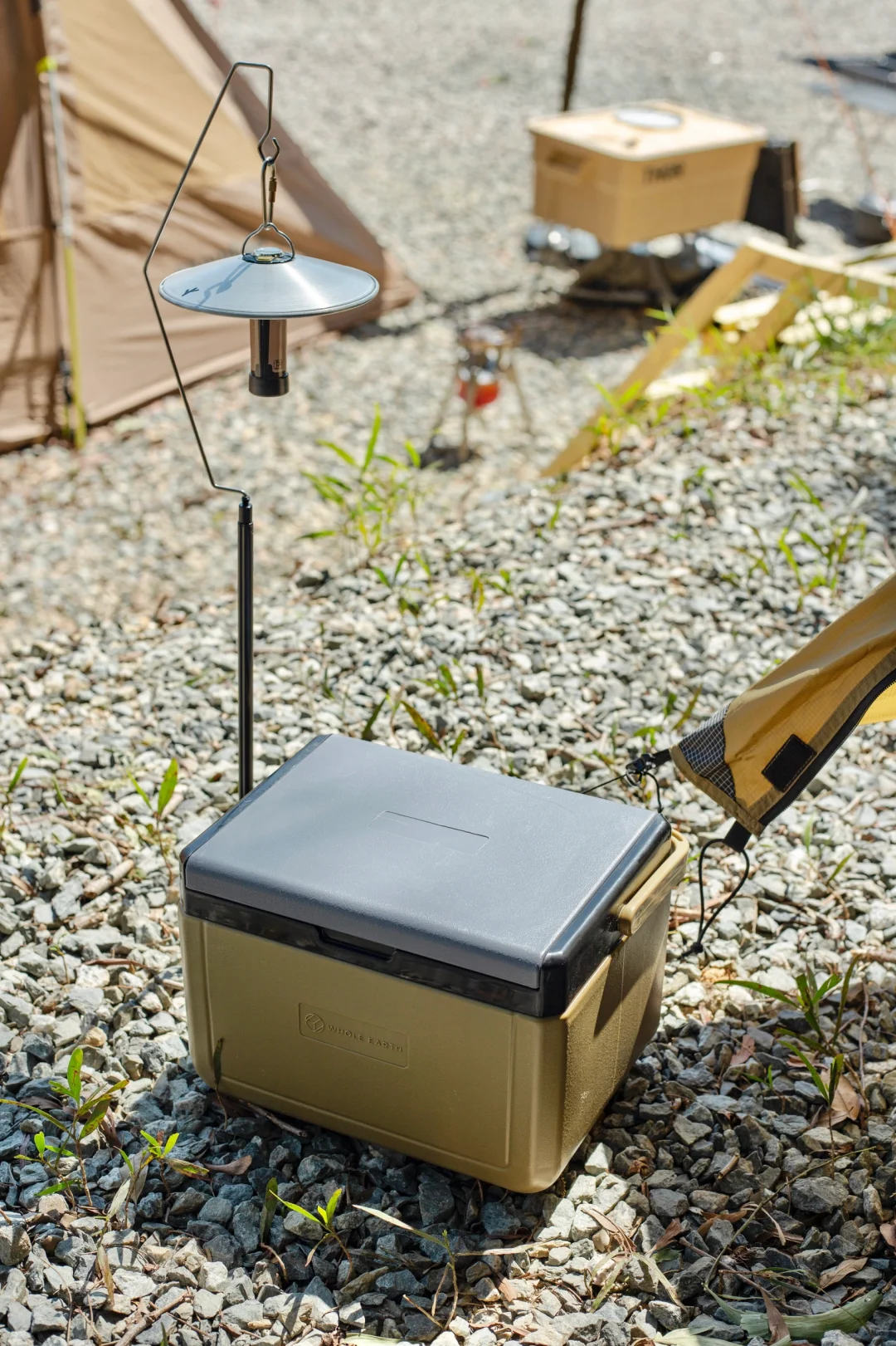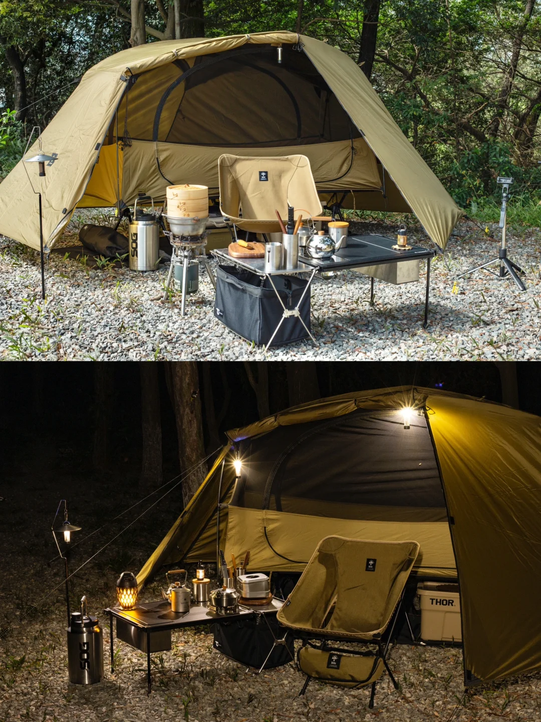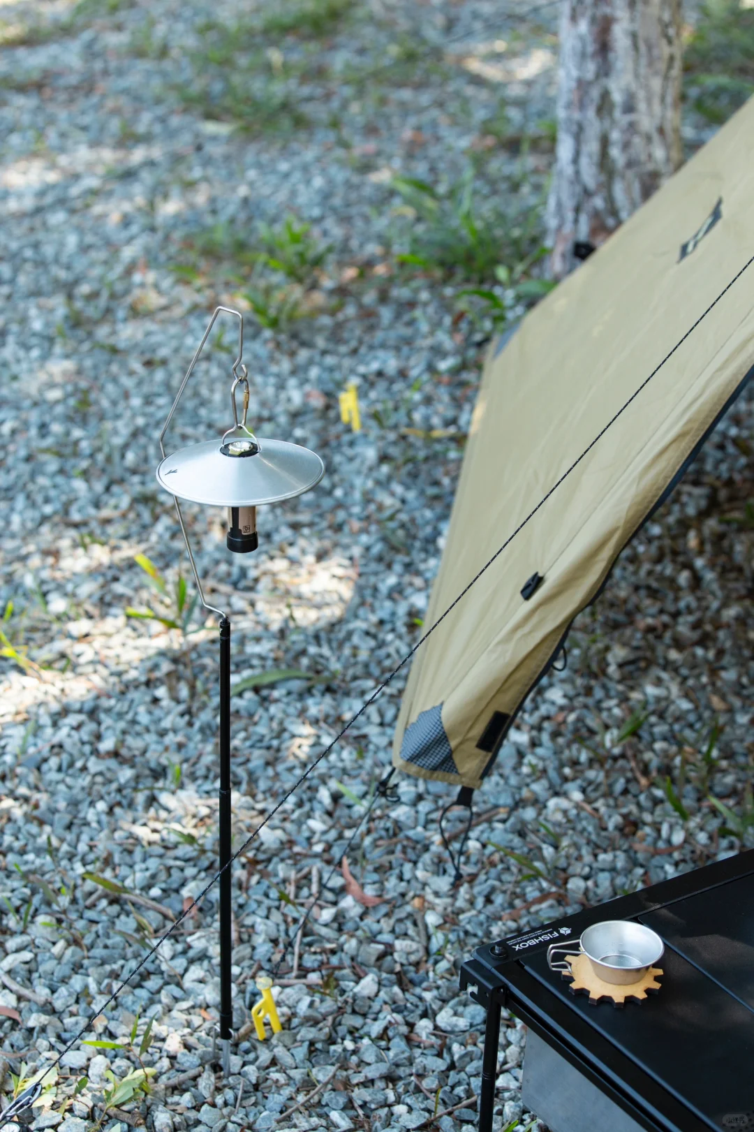 分享一组solo露营床帐的搭配: 这次大搭配思路是轻量化「小细腿」,可以看到行军床腿,月亮椅腿,桌腿,三脚架,灯杆都是黑色小细腿。 黑色地垫可以让床帐视觉上更有“悬浮感”,有地垫隔潮隔脏,床底可以放收纳箱和保温箱。 这次带了一个mini保温箱,刚好和帐篷的狼棕色近似,这个季节防个冰袋冷藏鸡蛋和午餐肉完全没问题。