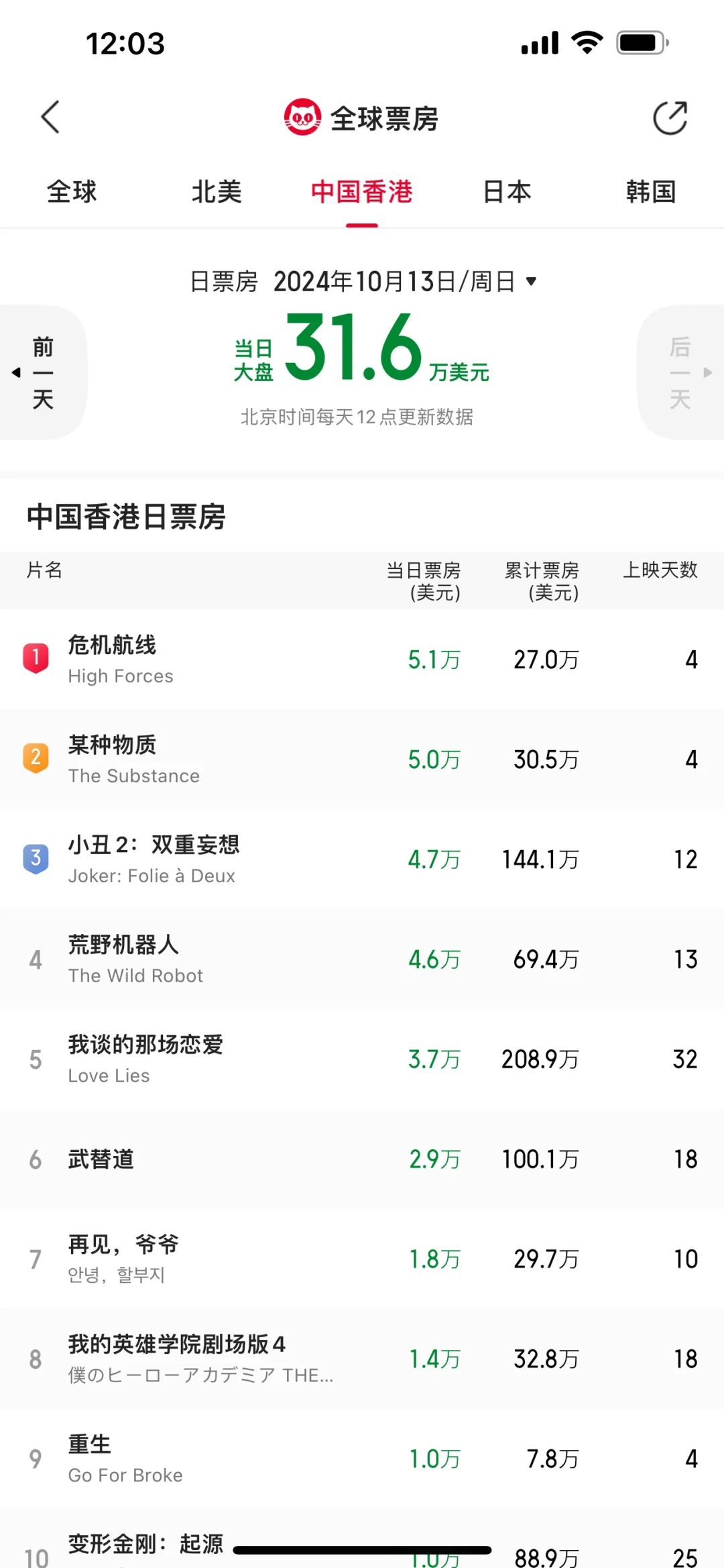 近期,香港上映了五部电影,分别是: 《危机航线》、《完美物质》、《小丑2:双重妄想》、《荒野机器人》、《我谈的那场恋爱》 其中,由彭顺导演执导,刘德华、张子枫、屈楚萧、刘涛主演的电影《危机航线》上映的第四天逆袭成为单日票房冠军,13日票房40万港币,折合5.1万美元*。 *数据来源:Hong Kong Box Office、猫眼专业版 内地也在热映中,这部电影到底是做对了什么才让两岸的观众都满意呢?据本台分析,原因有三: 1️⃣选角得当。 刘德华、张子枫、屈楚萧、刘涛,既有能够吸引港片老观众的基因,也吸引到了年轻的观众群体,影片中的父女情、一家人和解团聚的感情通过演员们真挚的演出,为电影增色不少。 2️⃣场面精彩。 万米高空劫机事件、封闭机舱内激烈打斗、舱门大开紧急迫降等情节,都是观众最多讨论的地方,不少观众看完都分享在电影院看这部电影特别过瘾、特别刺激,又爽又解压,尤其是4dx厅还能享受更真实的代入感,体验感Max! 3️⃣引人遐想。 不少观众看完电影后,在评论里或多或少谈到电影中的情节让他们联想到马航、川航事件,表达了对平安出行的渴求和国内航空安全的认可,这样的联想更让这部电影具有了非常强的观看价值! 电影正在全国热映中,推荐还没看的小伙伴拉上朋友一起去体验这场惊心动魄的绝境逆袭吧!