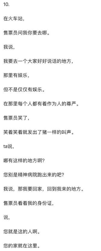我和大夫说:我要回我来的地方,大夫讲了一个网上流传了好几年的笑话,然后开怀大笑,边笑边说:你刚刚出院,为什么要回来呢?我也笑了说:我觉得我还没有被治好,我还不是一个正常人。