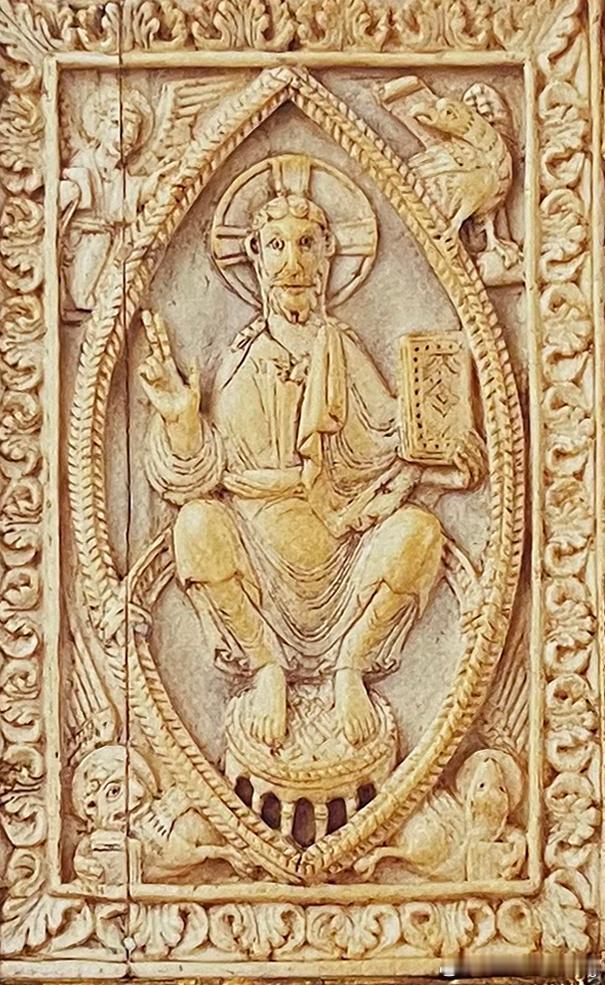 图2、3. 弗雷肯霍斯特金福音书封面,约1100年,木质封面、金箔、珍珠、珍珠母贝,及珍贵宝石装饰。高22.6厘米,象牙雕版高12.2厘米,明斯特