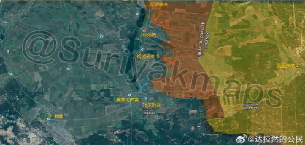 三、红利曼 方向:俄军继续在 特尔尼 北部、扬波利夫卡 东郊推进,但也被赶出了 托尔斯克(图3)