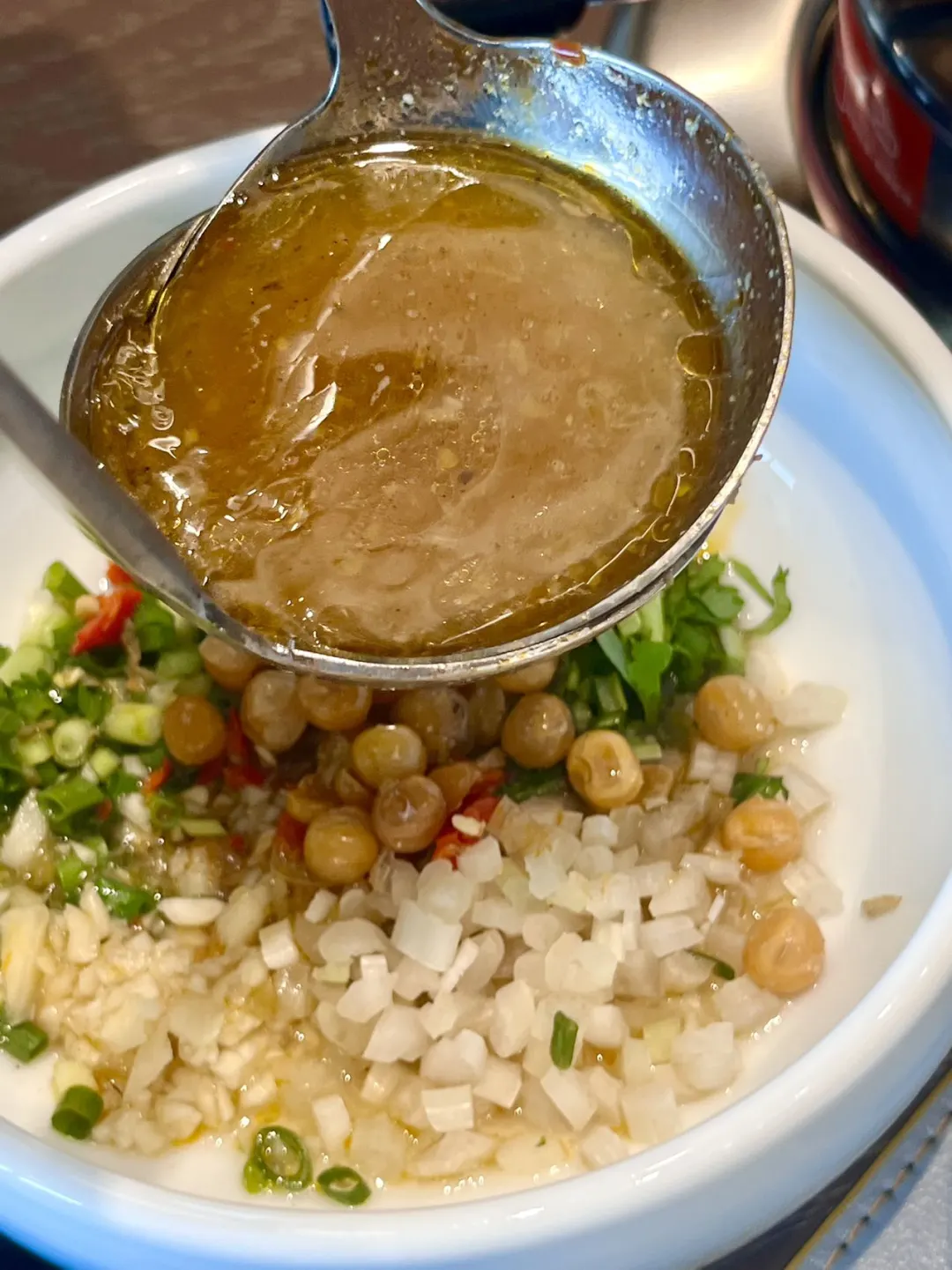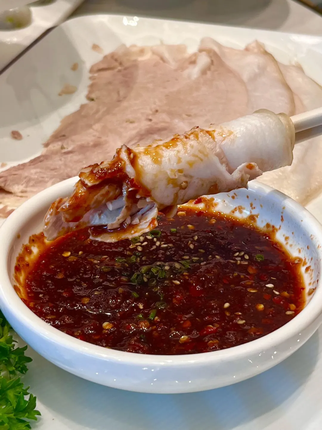 李庄大刀白肉切的薄厚均匀,沾上秘制的酱料,一口一片!吃起来真的一整个大满足啦,超入味的!