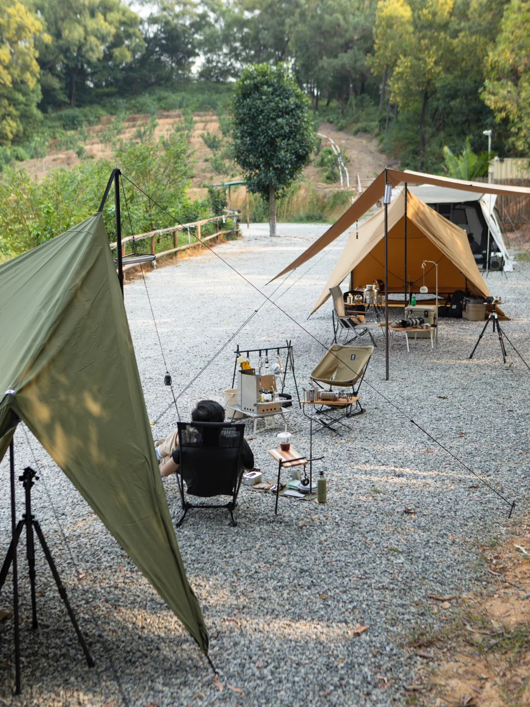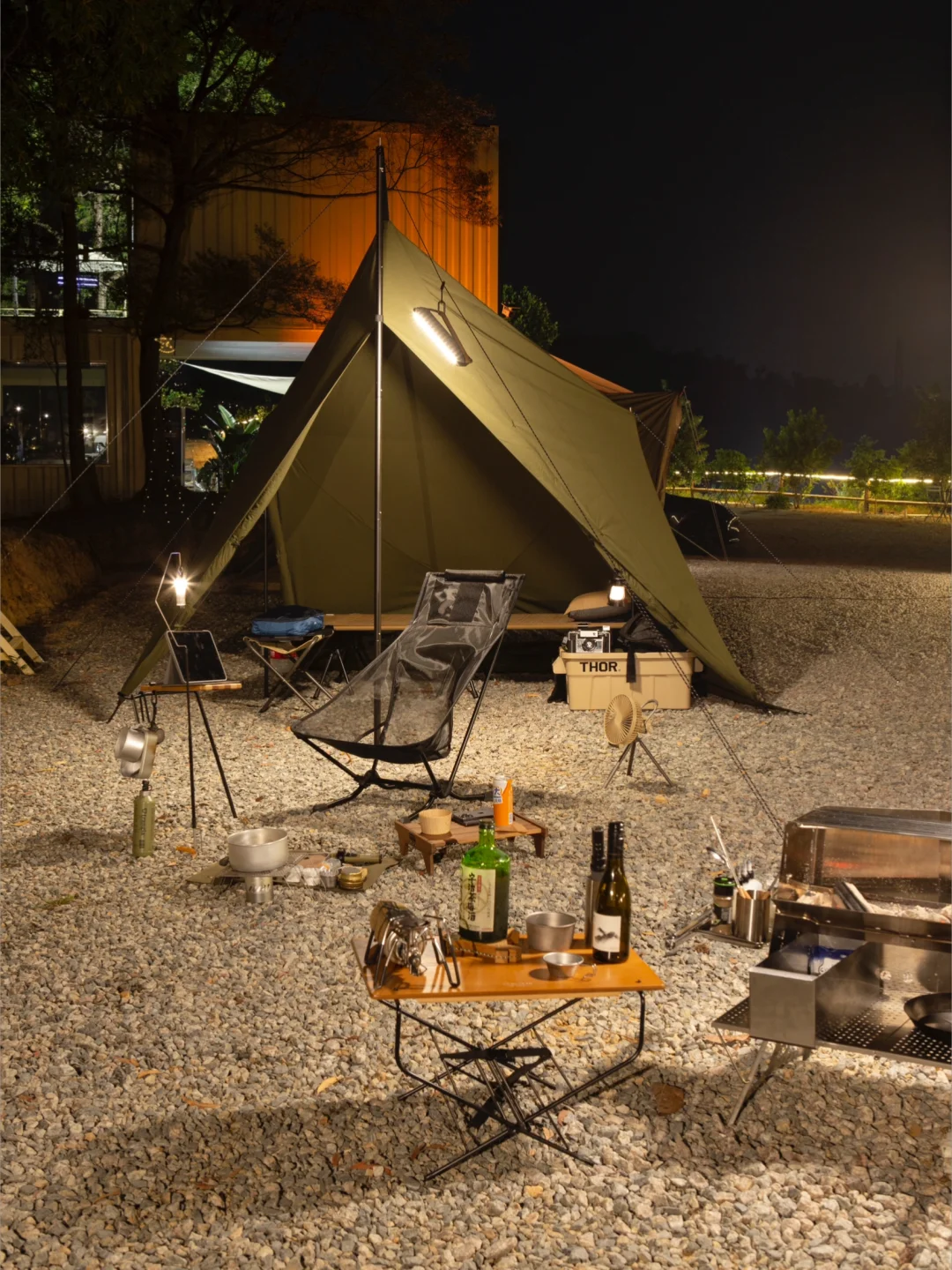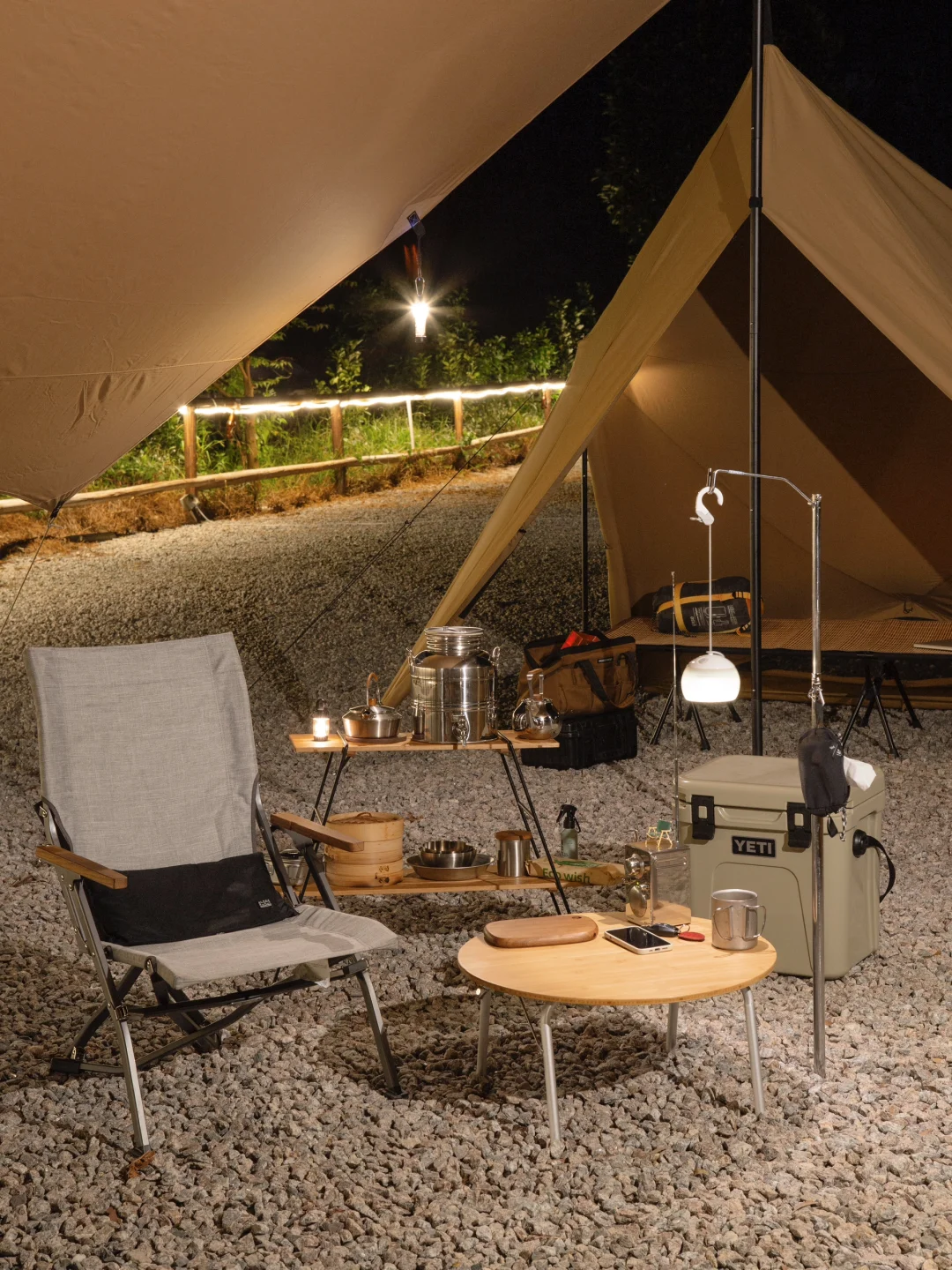 我这边就外接了一个同色天幕,算是这个塔帐的一个拓展玩法吧,杆高2.4m。天幕外是烧烤区,天幕下是置物休息区,帐篷是睡眠区,半夜把怕淋雨的装备都放天幕下,果然凌晨开始转小雨,安全感满满。如果是灰色帐篷的营友也可以考虑外接他家的灰色天幕。