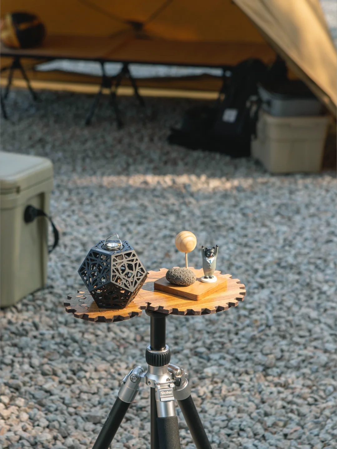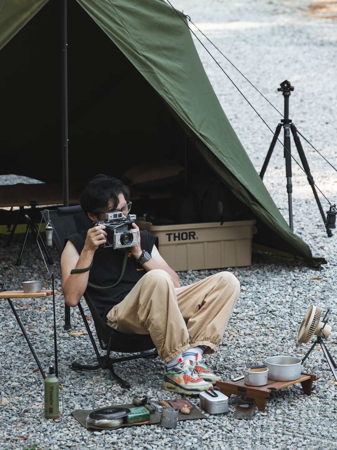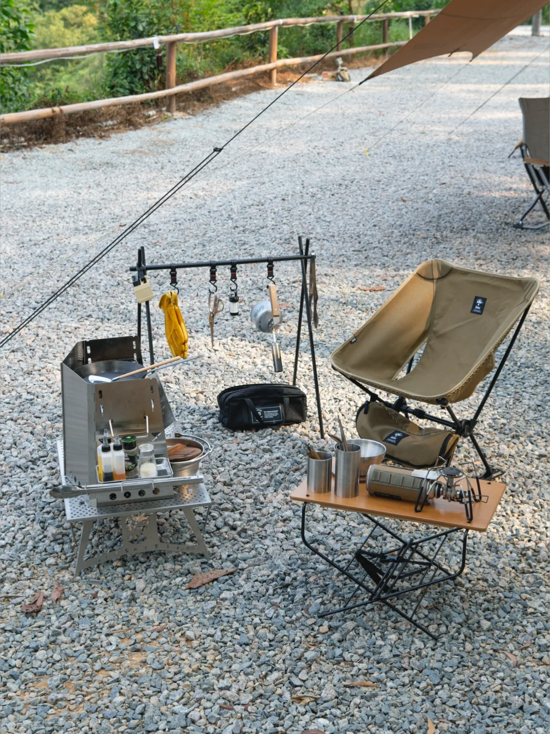 这次被「地板流」的氛围感种草了,搭建收摊儿轻快,单人餐煮也完全没问题,看似简单的装备,实则一点不复杂,一张地桌,一个camp ooparts的钉桌,组成高低组合,一把沙滩椅,一套trangia酒精套锅,全套装备除帐篷外收纳在一个53升的THOR箱内。