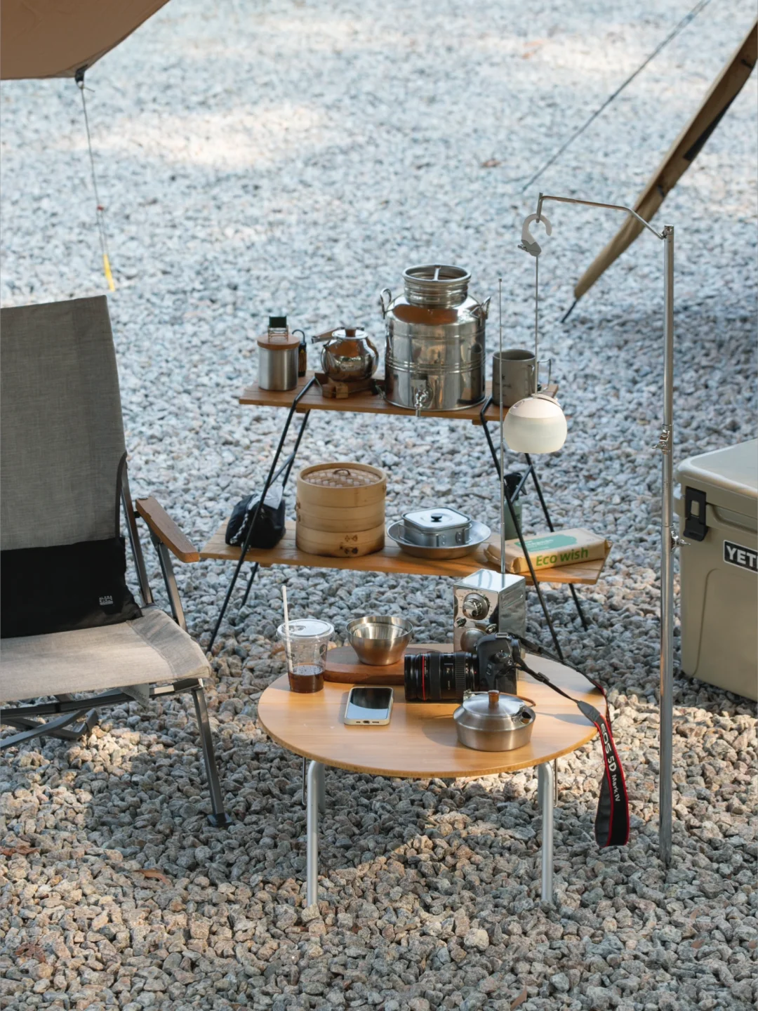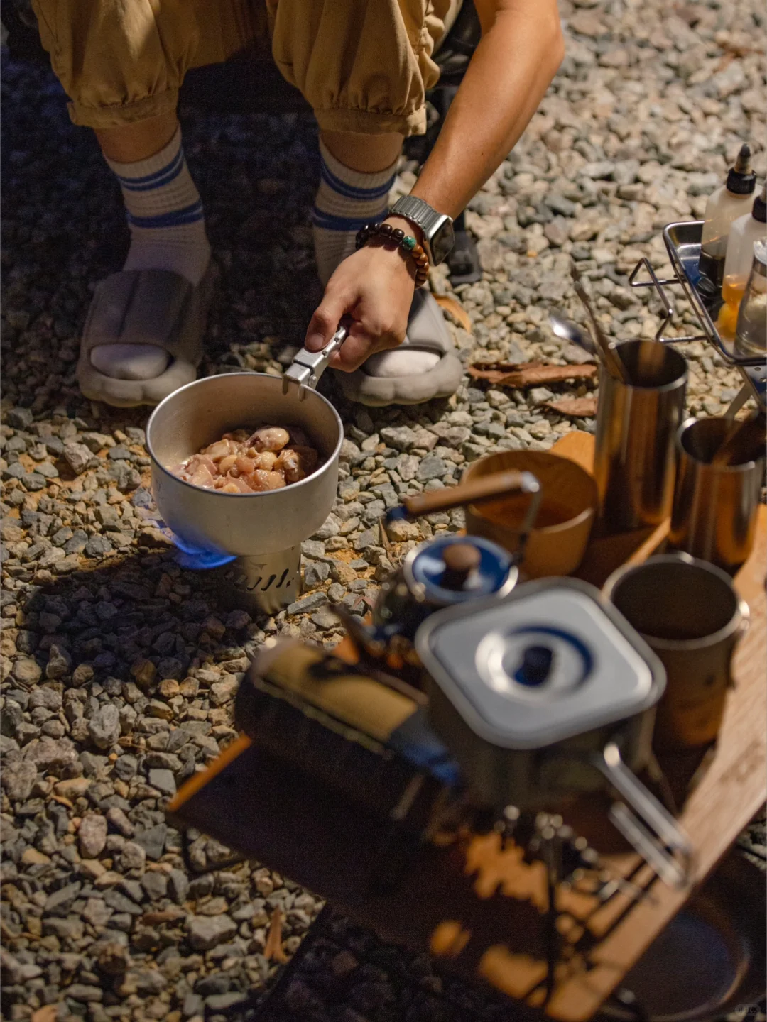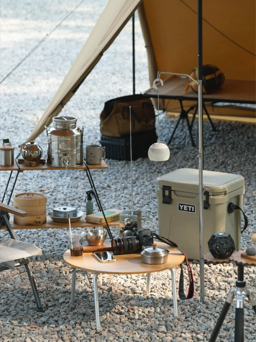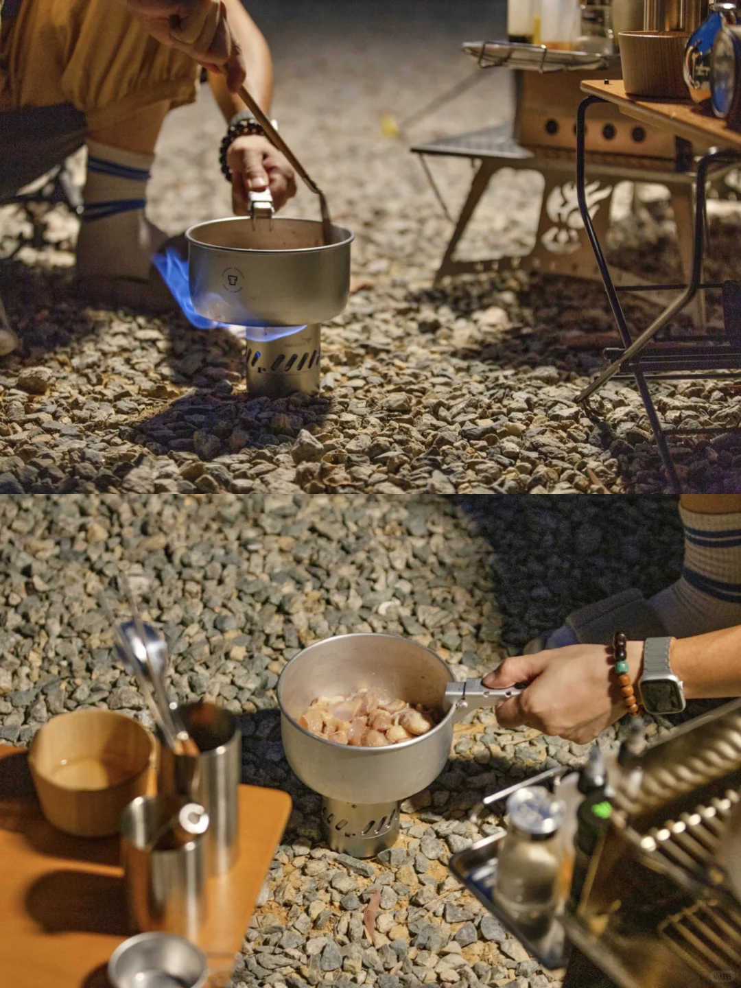 这次被「地板流」的氛围感种草了,搭建收摊儿轻快,单人餐煮也完全没问题,看似简单的装备,实则一点不复杂,一张地桌,一个camp ooparts的钉桌,组成高低组合,一把沙滩椅,一套trangia酒精套锅,全套装备除帐篷外收纳在一个53升的THOR箱内。