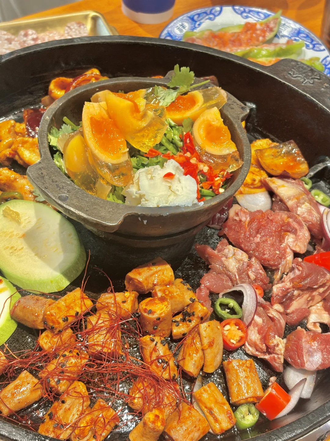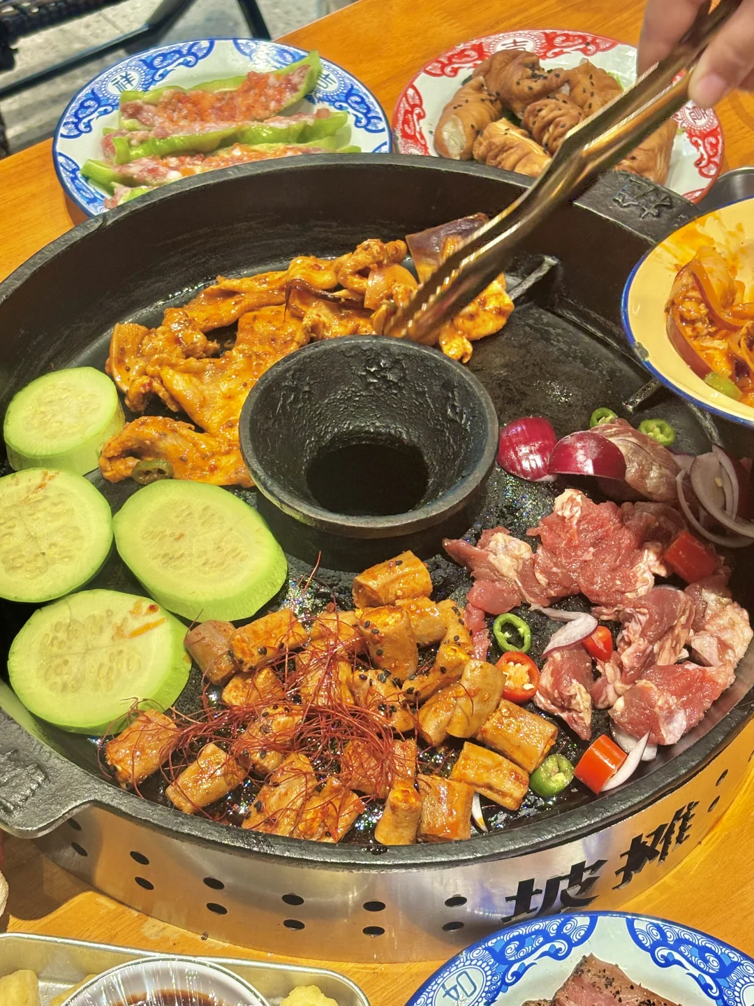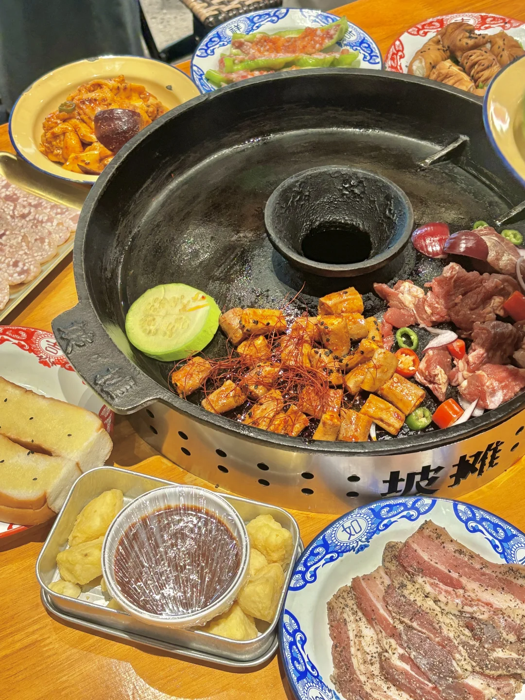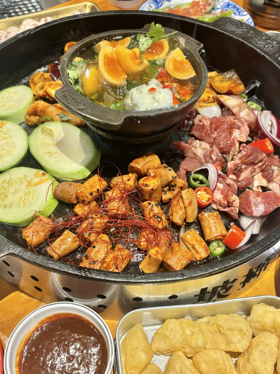 终于在唐山吃到正宗的贵州活油烙锅了!就在吾悦广场6层! 烙锅万物皆可烙!!菜,肉🥩,海鲜……一锅放下,香味四溢!它的精髓就是锅中间的皮蛋活油蘸水!用的是每天新鲜的猪油➕贵州特色调料制作而成!这里面煮的是糖心皮蛋!可以煮时间长点,特别入味!我还喜欢把肉直接在里面涮一下,辣辣的,非常香~ 除了肉🥩之外,强烈推荐超大章鱼足!吃起来很鲜也很有嚼劲! 他家的炒饭还有部分饮品是自助无限量的~真的很赞👍🏻 - 🏡店名:坡摊烤肉 📍地址:吾悦广场6层