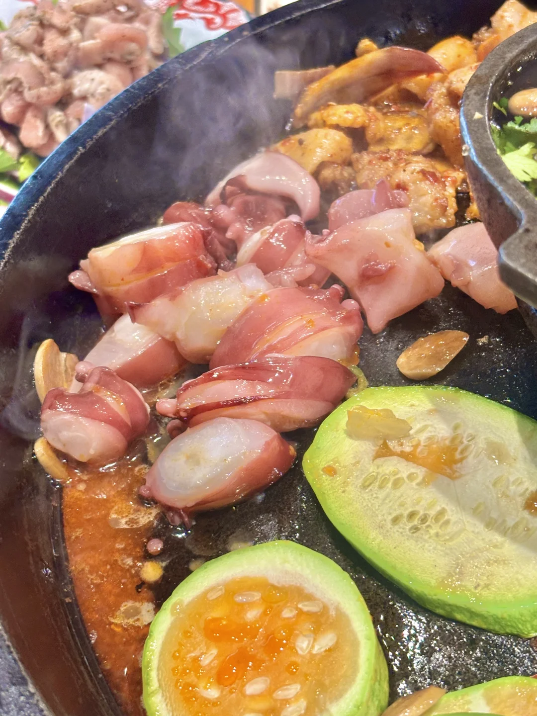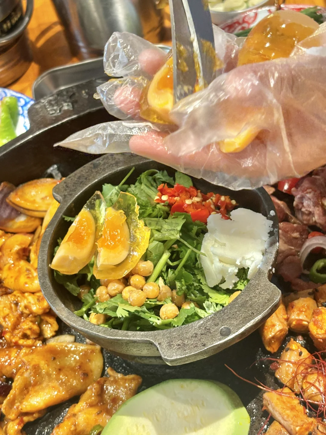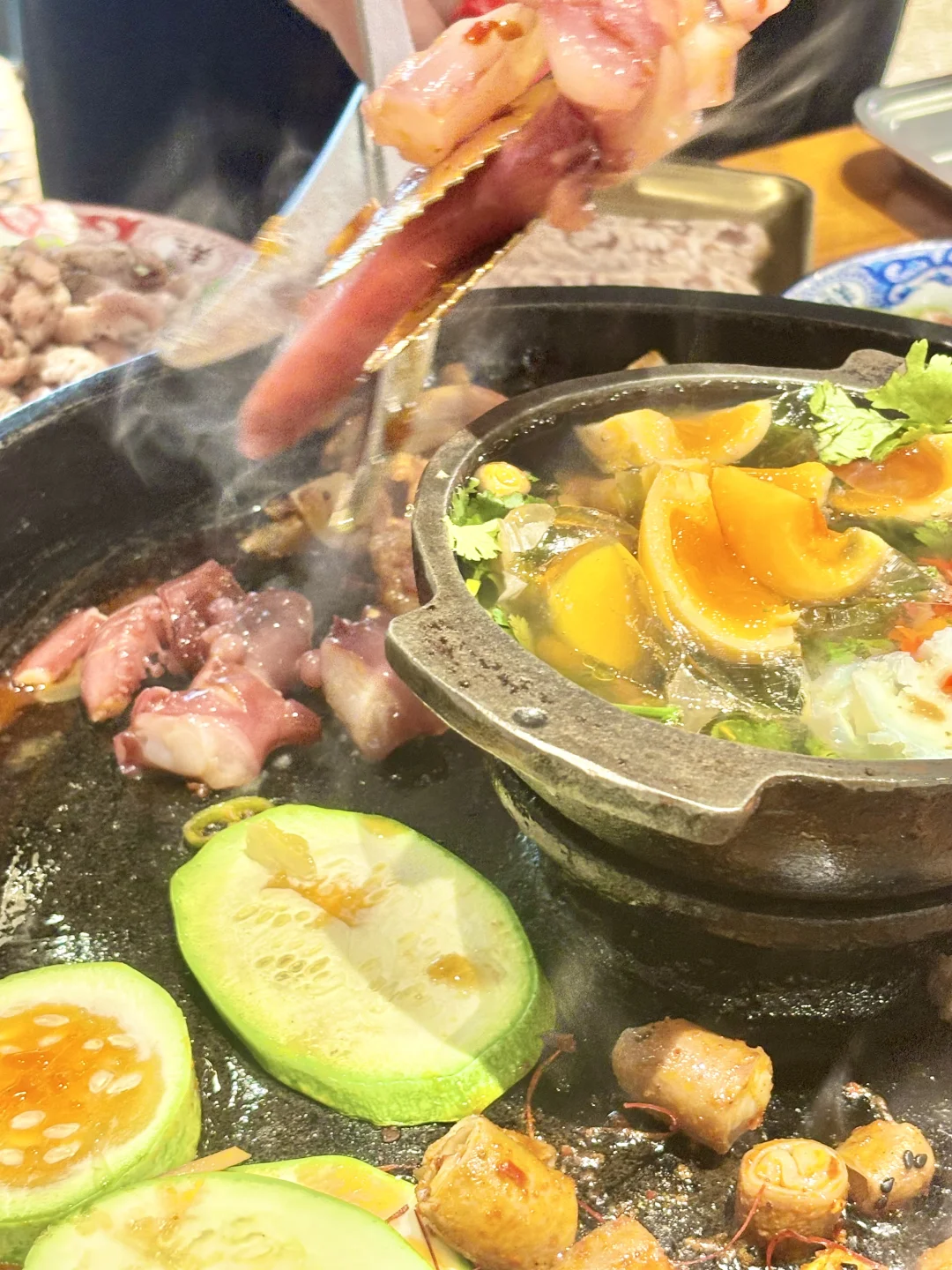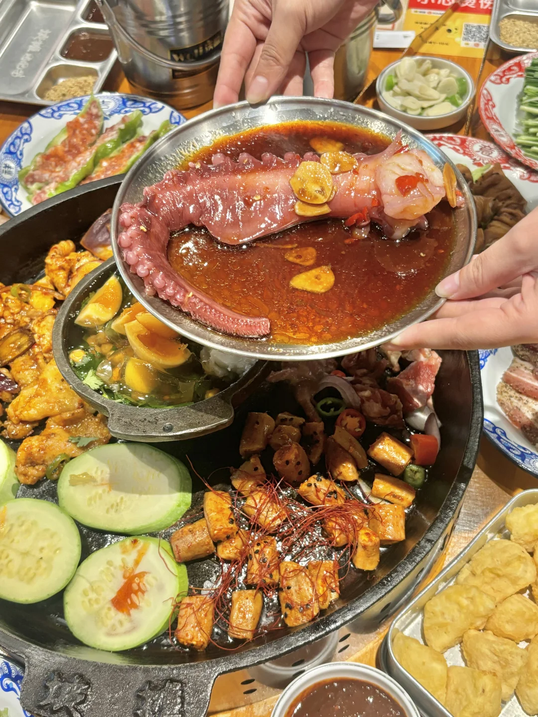 终于在唐山吃到正宗的贵州活油烙锅了!就在吾悦广场6层! 烙锅万物皆可烙!!菜,肉🥩,海鲜……一锅放下,香味四溢!它的精髓就是锅中间的皮蛋活油蘸水!用的是每天新鲜的猪油➕贵州特色调料制作而成!这里面煮的是糖心皮蛋!可以煮时间长点,特别入味!我还喜欢把肉直接在里面涮一下,辣辣的,非常香~ 除了肉🥩之外,强烈推荐超大章鱼足!吃起来很鲜也很有嚼劲! 他家的炒饭还有部分饮品是自助无限量的~真的很赞👍🏻 - 🏡店名:坡摊烤肉 📍地址:吾悦广场6层