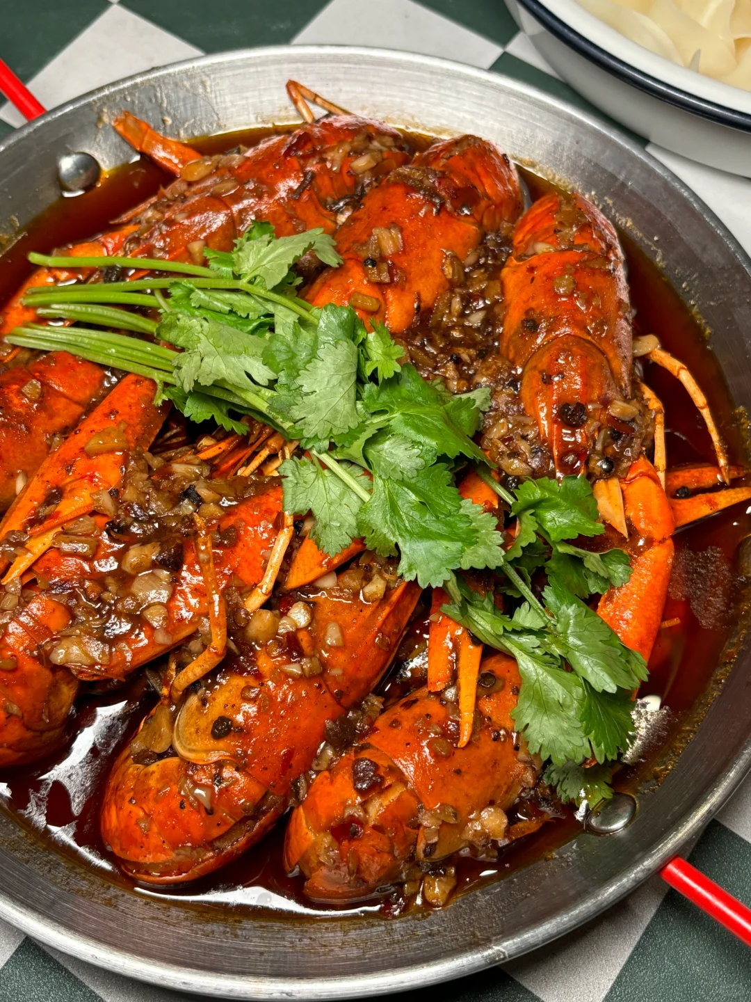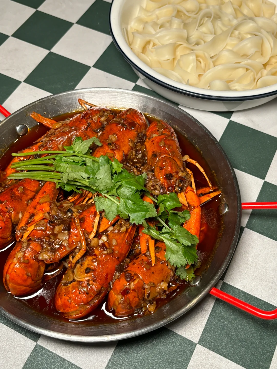 🦞蓝龙虾个头很大 蒜香味和🌶️麻辣味道都很好吃 还有搭配宽面条 吃完的龙虾 汤汁再倒进去搅拌 真的会香迷糊!价格也很平价有tg