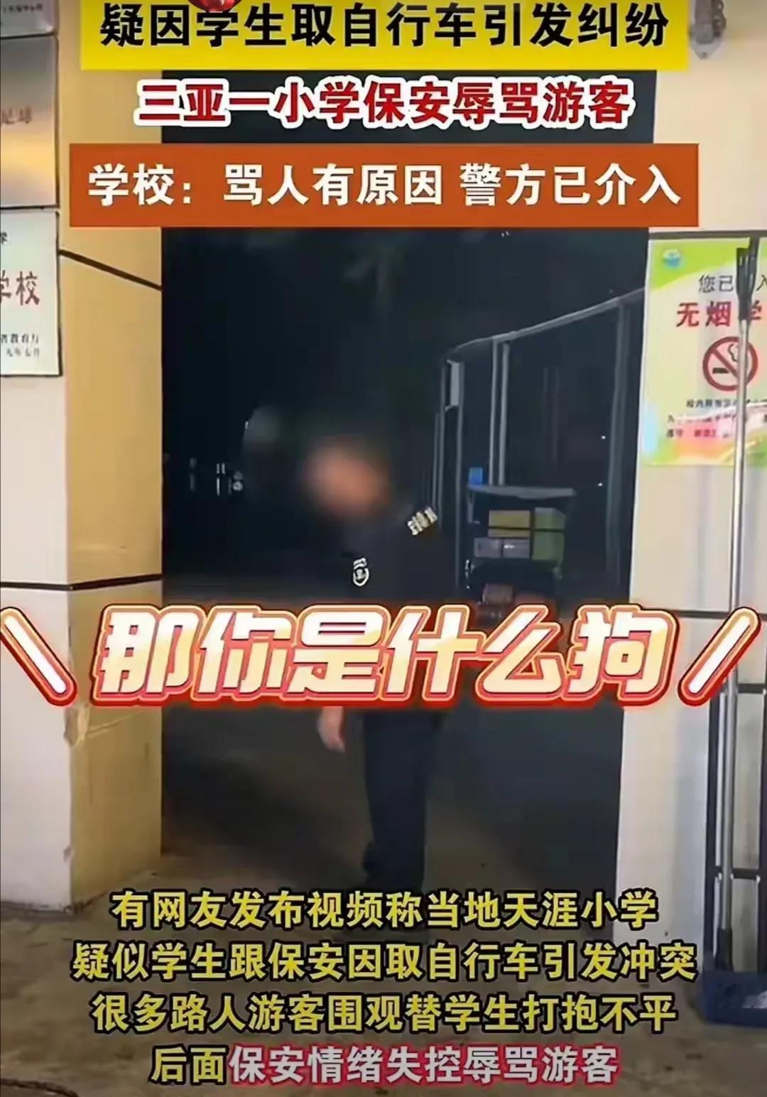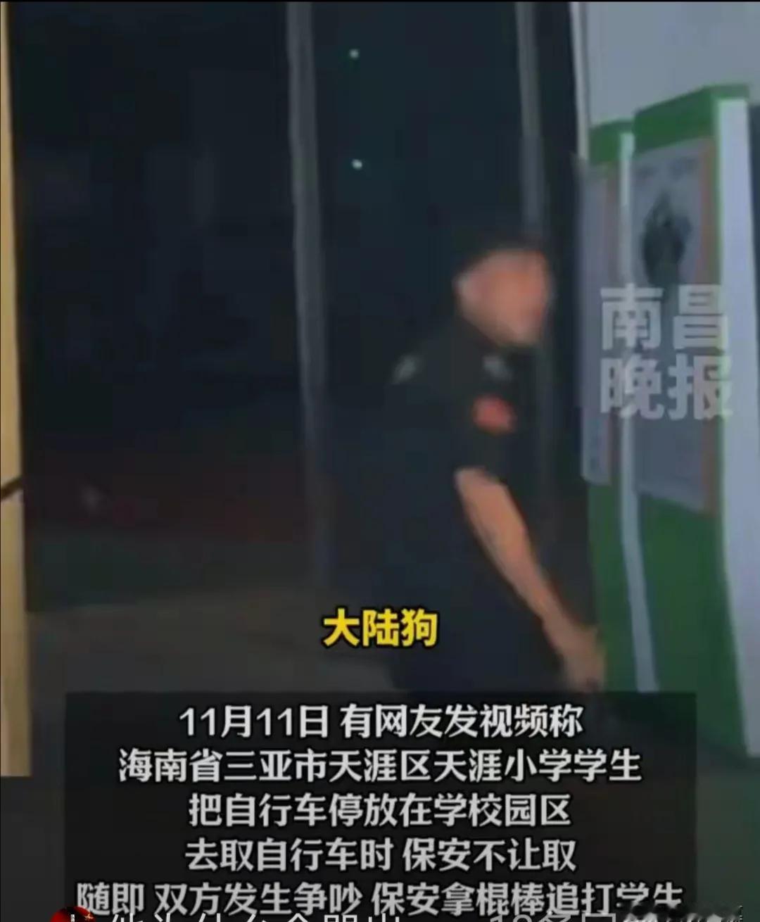 《海南保安辱骂家长“大陆狗”事件:令人发指的恶行与后续处理》 保安,本应是守护一方安宁的群体,他们的工作虽在底层,却也十分重要,无论是烈日炎炎还是寒夜漫漫,都得坚守岗位,然而,他们有时也会与他人产生冲突。可海南三亚天涯小学的一名保安,却做出了让人气愤不已的事。 11月11日,据媒体报道,一场风波在三亚天涯小学门口掀起。一位家长发布的视频令人震惊,视频中显示她竟被该校一个五十多岁的保安追打,更过分的是,保安还口出恶言,骂她是“大陆狗”。那保安从学校门口走出时,态度就极其嚣张,对着家长宣称自己是保安。当看到家长拿着手机拍摄,他的怒火更是“噌”地一下就冒了起来,还质问周围的围观者为何在学校这里。 双方随后发生口角,各执一词。家长情绪激动是因为自己孩子受了委屈,她不停地向保安质问。可谁能想到,保安竟骂出了“大陆狗”这般带有歧视性的话语,还回头强调是在叫家长。这种辱骂实在是太过分了,当地虽有人会提及“大陆人”这一说法,但绝不是这种充满侮辱的口气,家长和周围人面对如此野蛮的保安,也只能又气又无奈。 随着事件的进一步曝光,事发原因也浮出水面。原来,是这个保安先挑起事端。当天晚上,学校有个学生把自行车放在学校,打算放学后骑回家,可保安却不让学生取车,双方因此发生争执。保安竟拿着棍子在学校里追打学生,学生被追得四处逃窜,惊恐万分,于是赶紧给妈妈打电话求救。在保安追打学生时,还有一些正义的路人看不过去,出手帮忙制止。 之后家长赶到学校门口,便出现了视频中的那一幕。而这个保安还不知收敛,不仅对家长辱骂,在追打学生和与家长冲突过程中,还和其他劝阻的游客发生口角。他情绪完全失控,行为恶劣至极。 此事经网络发酵后,引起了轩然大波。当地相关部门迅速做出回应,涉事保安已被停职,学校也开始对该事件展开调查,警方也已经介入。不过,网友们认为,仅仅停职是远远不够的,保安追打学生、辱骂他人的行为如此恶劣,必须要更严肃地处理。 确实,保安拿着工资,就应该履行好自己的职责,以认真负责的态度对待学生。而这位保安却因一点小事就大动肝火,这是严重的失职。如今,他已被停职,或许还将失去这份工作,他必须要向学生和家长道歉,为自己的恶行负责。#三亚一个业主# #三亚宰人# #三亚学校保安# #海南人挺住了#