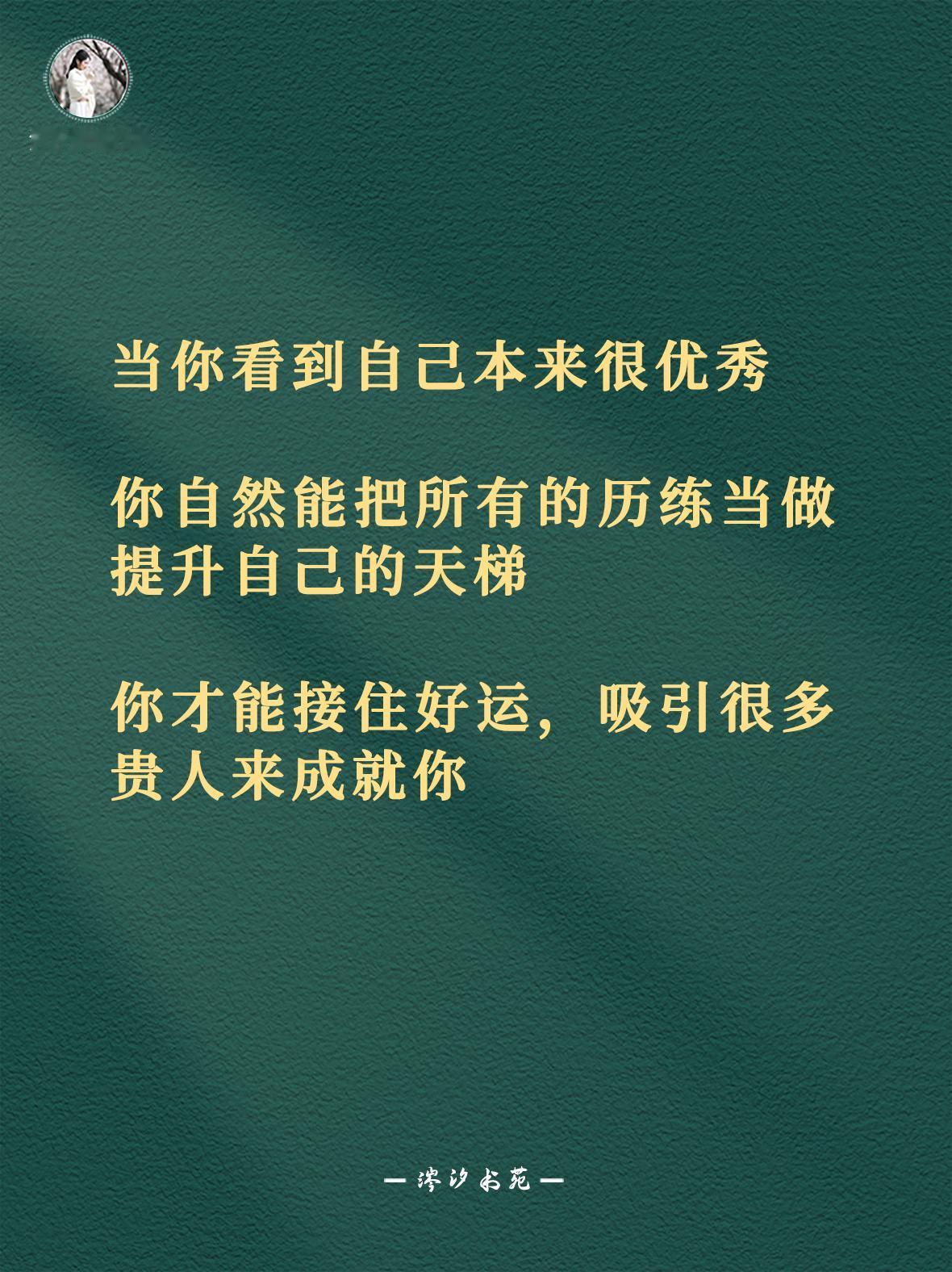 你本来就很优秀,好运属于你 1.你总是因为人生的打击来否定自己,其实所有的经历只不过让你来体验的。 2.你在体验中变得更强大,在强大中你看到自己的无限潜力。 3.只不过当初你陷入了攀比中,而忘了这只是一个体验,所以看不到自己的潜力,看不到自己的优点,看不到自己身上的闪光点,看不到一切都是机会。 4.当你看到自己本来很优秀,你自然能把所有的历练当做提升自己的天梯,你才能接住好运,吸引很多贵人来成就你。
