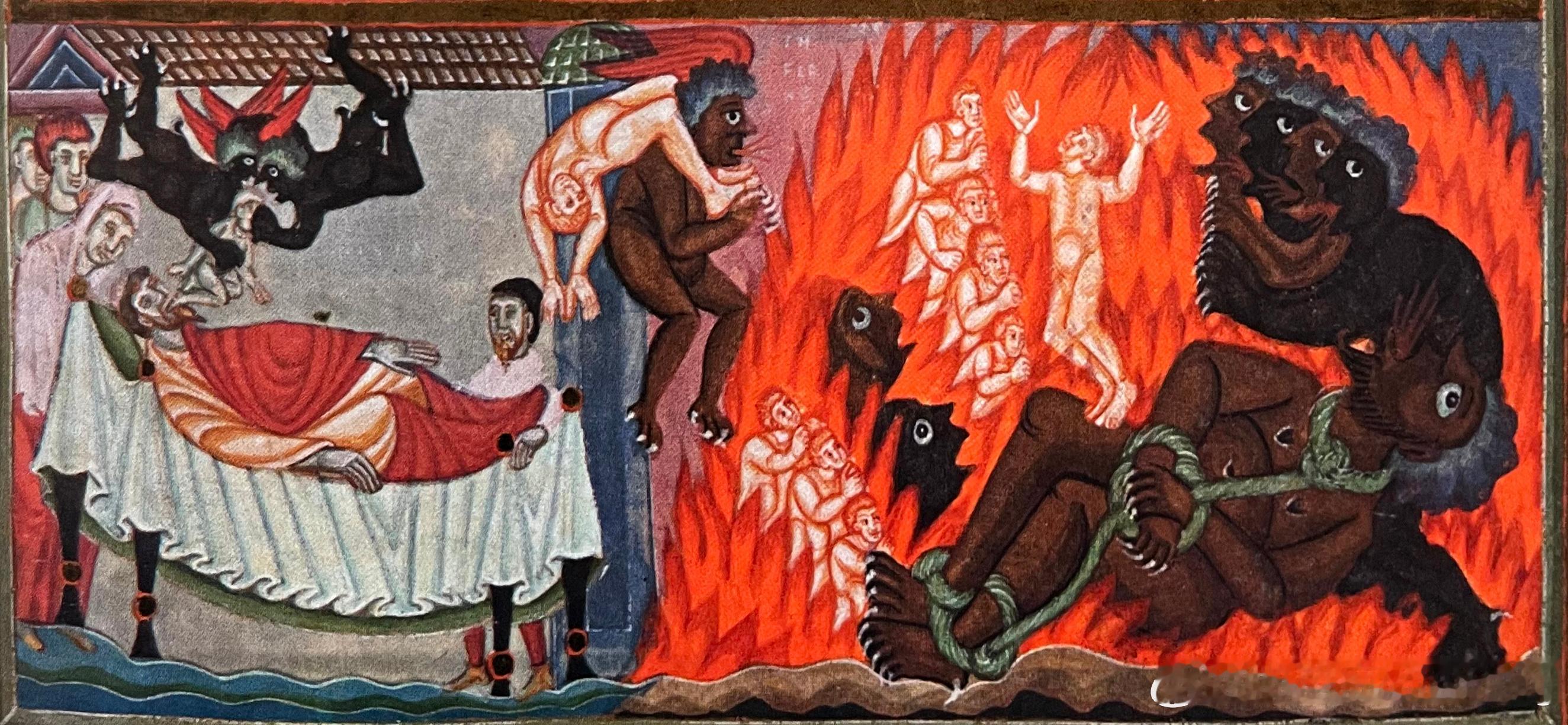 《埃希特纳赫金福音书》制于1030年,是埃希特纳赫缮写室作品中最重要的一件作品。此书用来自特里尔的昂贵的封面装订,并由皇后迪奥凡诺及其儿子奥托--之后的奥托三世捐赠给修道院,书本以基督圣像开始,其周围除了环绕福音传道者的象征物外,也有四位先知耶利米、以赛亚、以西结和但以理。《福音书》的评论可在手抄本的刻写板上找到,由天使拿着,记有四枢德:义德(正义)、节德(节制)、勇德(勇敢)及智德(明智)。古书手抄本所包含的《四福音书》经句,皆具有装饰的页面及众多描绘耶稣生平、传道和受难场景的微型画。《路加福音》书的页面中呈现了麻风病人拉撒路的故事及挥霍者最终堕落于地狱的故事。这些场景搭配作为作者的福音传道者的描绘,以及最后引出文字的图饰起首字母。起首字母以金色作为作品内容的开始。