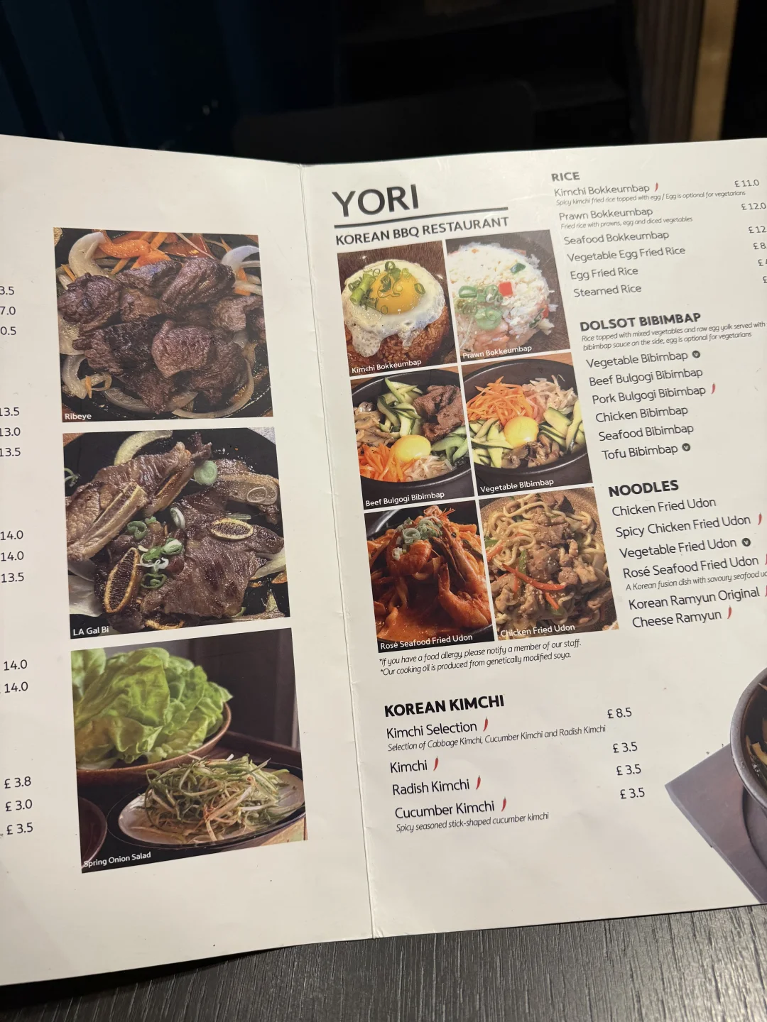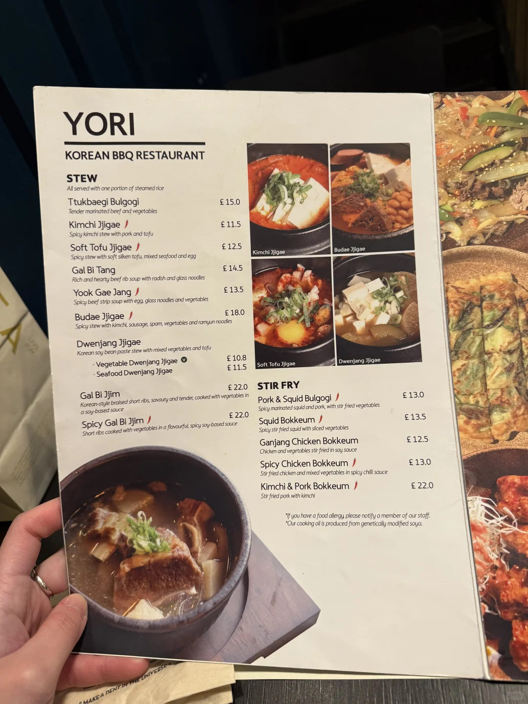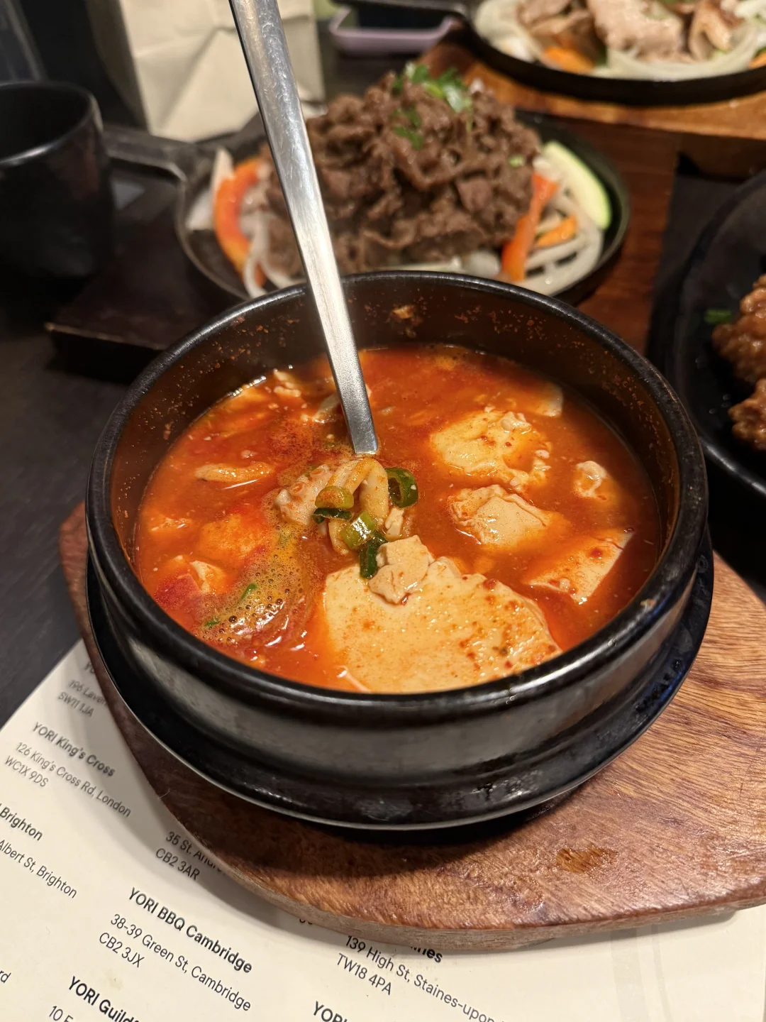 伦敦今年入冬好早❄️ 才十一月中就已经日均1、2度,体感温度更是一度只有零下[扯脸H] 昨天晚上去Covent Garden那边看圣诞灯饰,实在冷得不行于是就在附近吃了顿韩料,明明是个bbq餐厅,到最后反而是汤饭和炸鸡最好吃[偷笑R] . 🔅 Seafood Soft Tofu Jjigae - £12.5 ta家的海鲜绢豆腐汤饭很不错吃,虽然看起来只有小小一锅,但用料很足,满满都是小章鱼、鱿鱼、青口贝、虾米和吃起来很嫩的豆腐🍲 调味是恰到好处的微辣,用来泡饭一绝,一勺一勺停不下来[大笑R] . 🔅 Soy Garlic Chicken - £12.8 无骨的蒜香豉油炸鸡球吃起来很不错,外皮酥脆,一咬开里面很多汁,感觉应该会是很好的下酒菜叭[赞R] . 🔅 Pork Belly BBQ - £14 🔅 Beef Bulgogi BBQ - £13.5 烤猪五花肉和烤韩式牛肉都稍微有点令人失望,五花肉感觉完全没有提前腌味,就是生煎[汗颜R] 虽然没有英国猪的臭味,但吃起来就感觉没有灵魂❌ 韩式烤肉是微甜的调味,吃起来倒也还行就是不惊艳[扯脸H] . 🥩 YORI (Covent Garden)🥩 📍 15 Catherine St, London WC2B 5LA 💰 £20-30/人 ✍️ 店里位置不多,周五晚上or周末的话建议提前预约,别问我怎么知道的哈哈哈[暗中观察R] . 👭:Ng