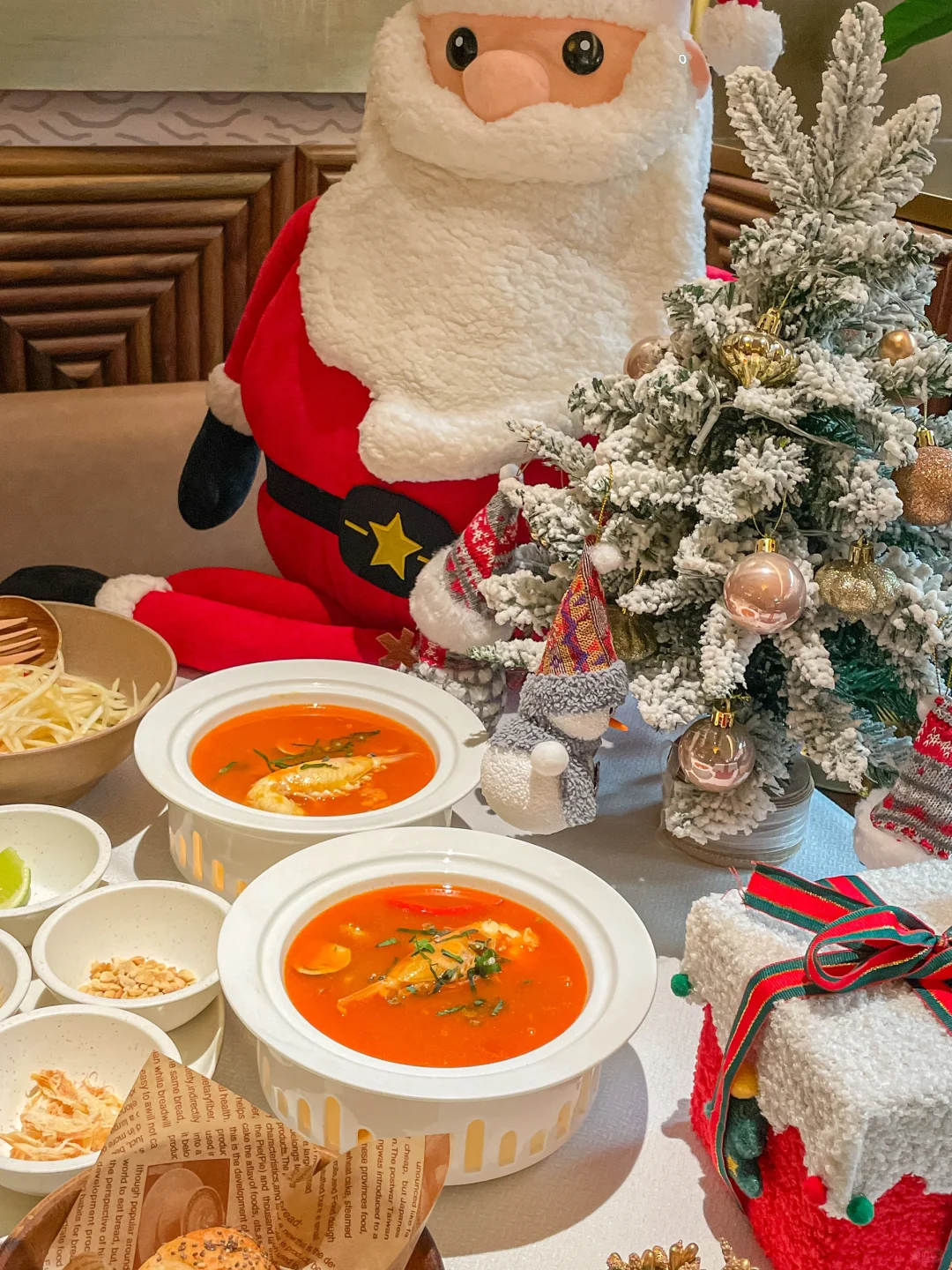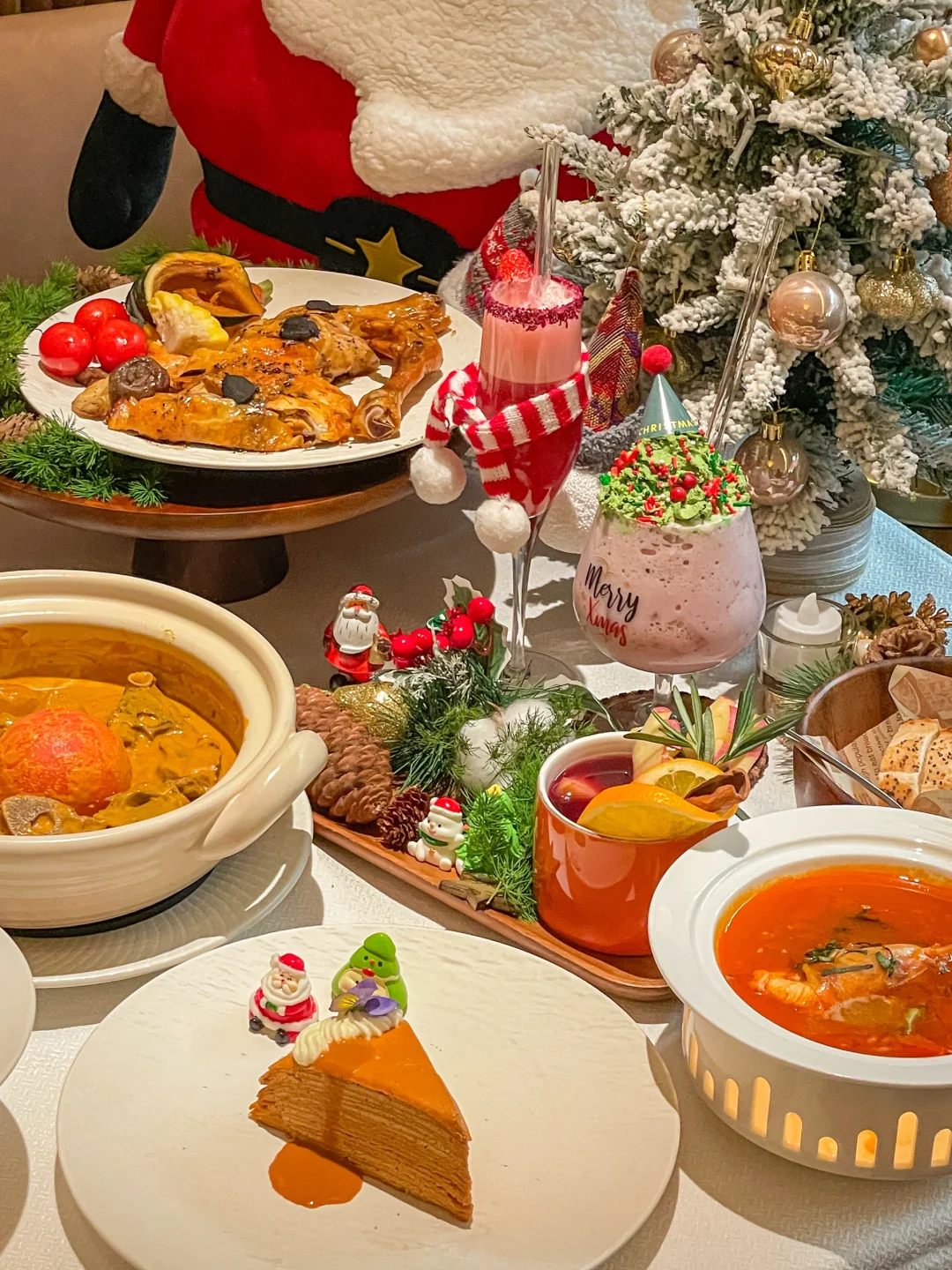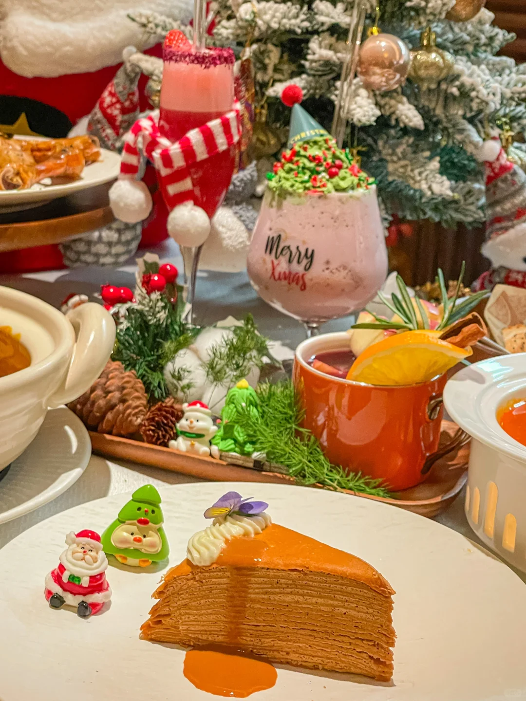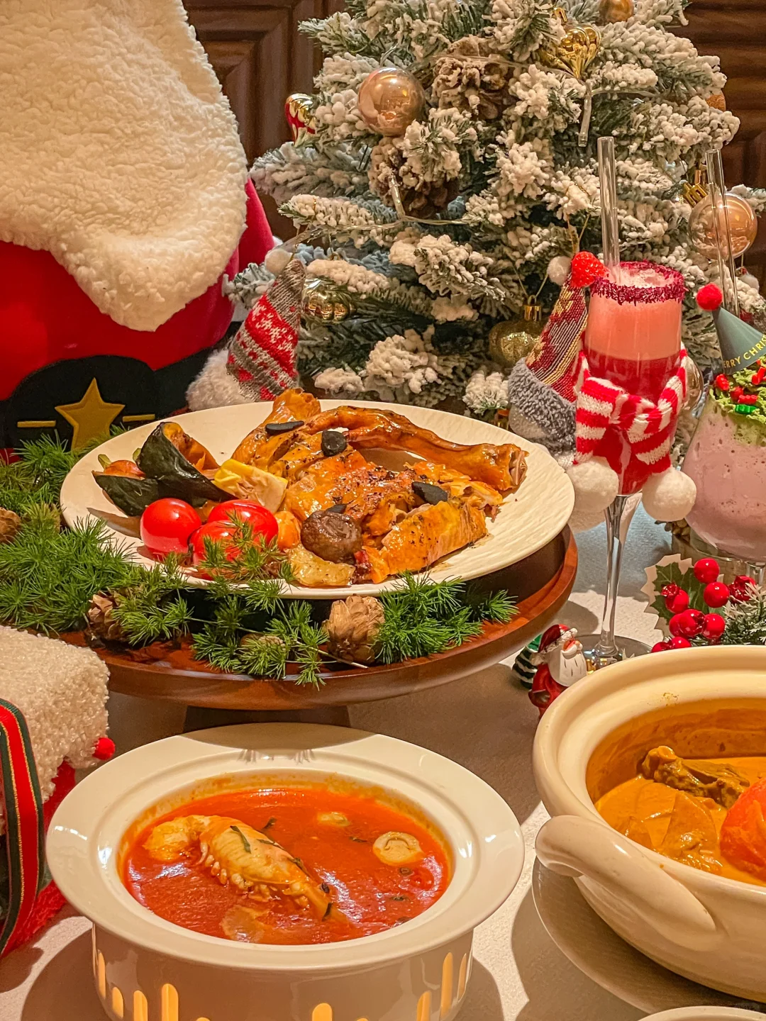 静安寺好美的圣诞氛围餐厅! 来5G过圣诞🎄 这家的泰国菜太戳我啦! 饮品做的好有圣诞感🍹 还点了黑松露烤鸡,泰茶千层,椰奶鸡汤,黄咖喱羊肉好好吃🤤