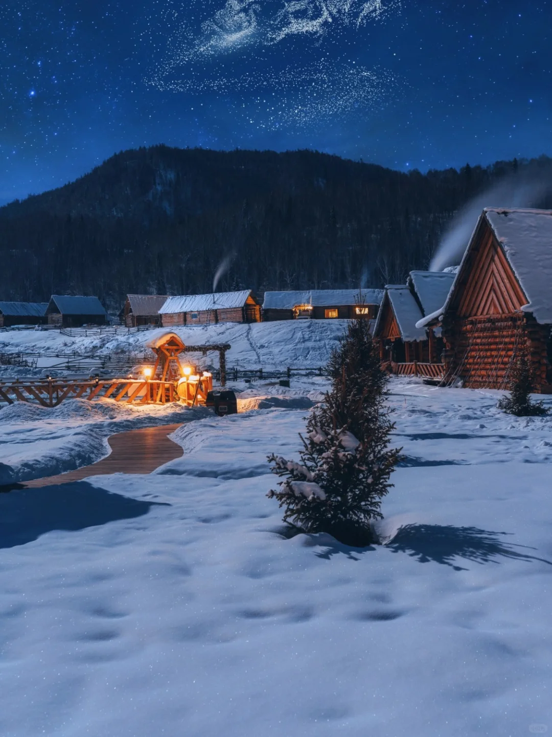 这里的木屋错落有致,被白雪覆盖后,宛如梦幻般的仙境。清晨,炊烟袅袅升起,与雪景融为一体