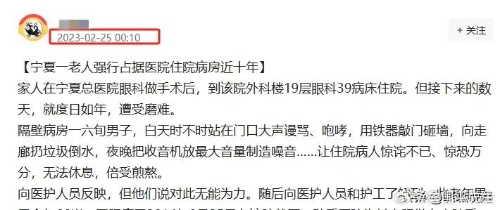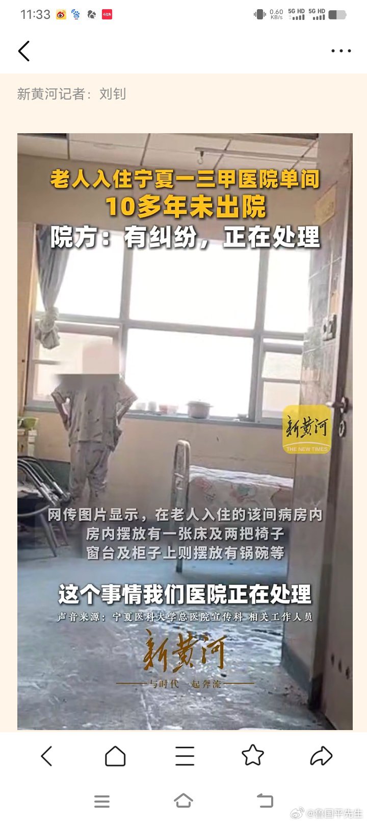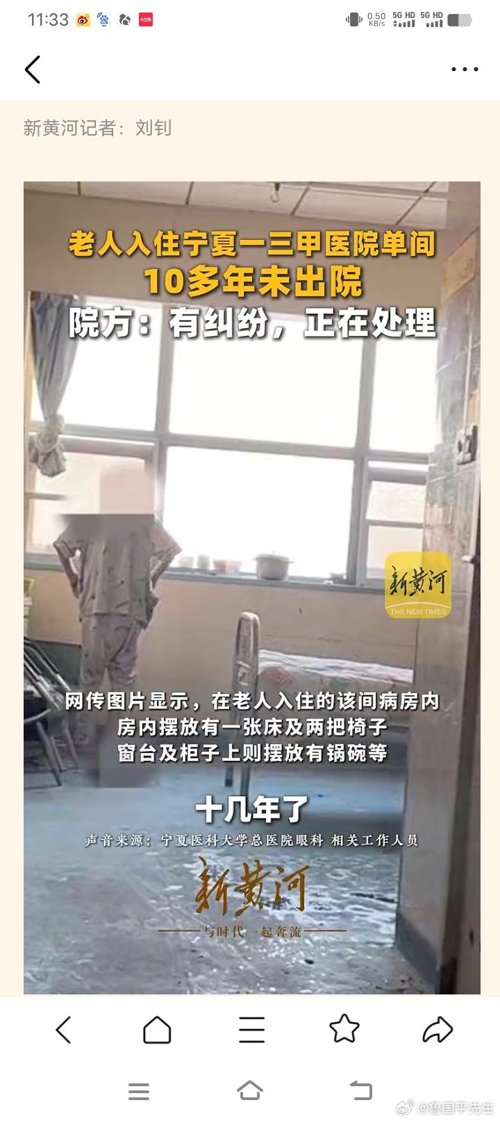 把医院当成家,根据宁夏医科大学的工作人员回复的话是医院当时和老人有医疗纠纷。但是再怎么纠纷的话,住院十几年不夸张的说病房费都有几十万了吧。因为现在哪怕在我们小县城里面住单间,一天的话,都在400块钱左右。
