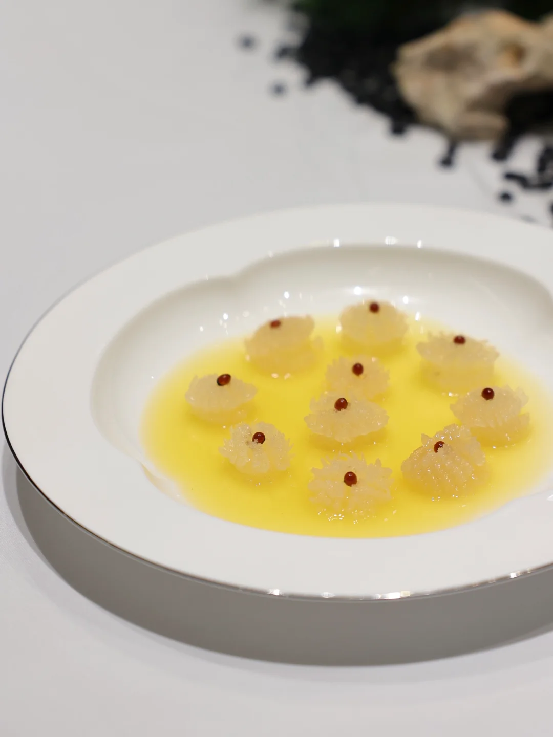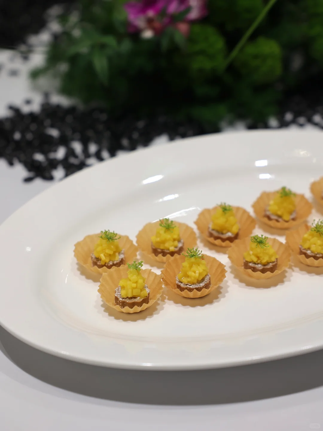 菜品巧妙地将法式鹅肝与热带风情的芒果相结合,再配以椰香的点缀,创造出层次分明、口感丰富的味觉体验。鹅肝的细腻与芒果的清新,加上椰香的甜美,三者完美融合,令人回味无穷。