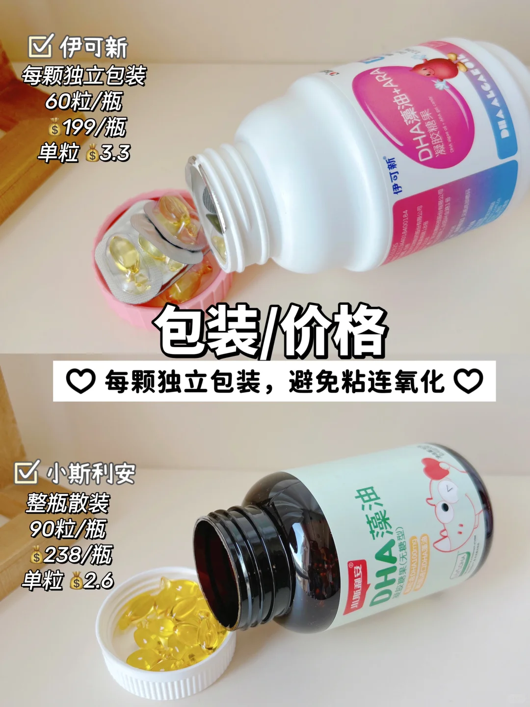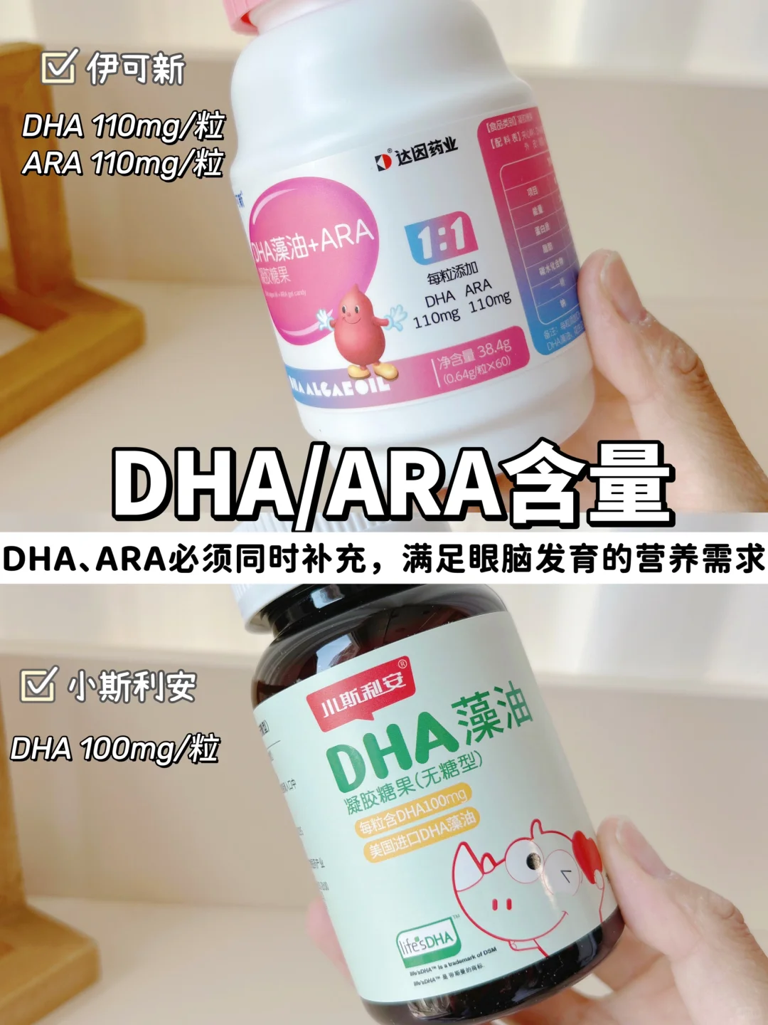 小斯利安藻油DHA和伊可新DHA藻油+ARA,我家都买过,具体区别可以看看图上所示!